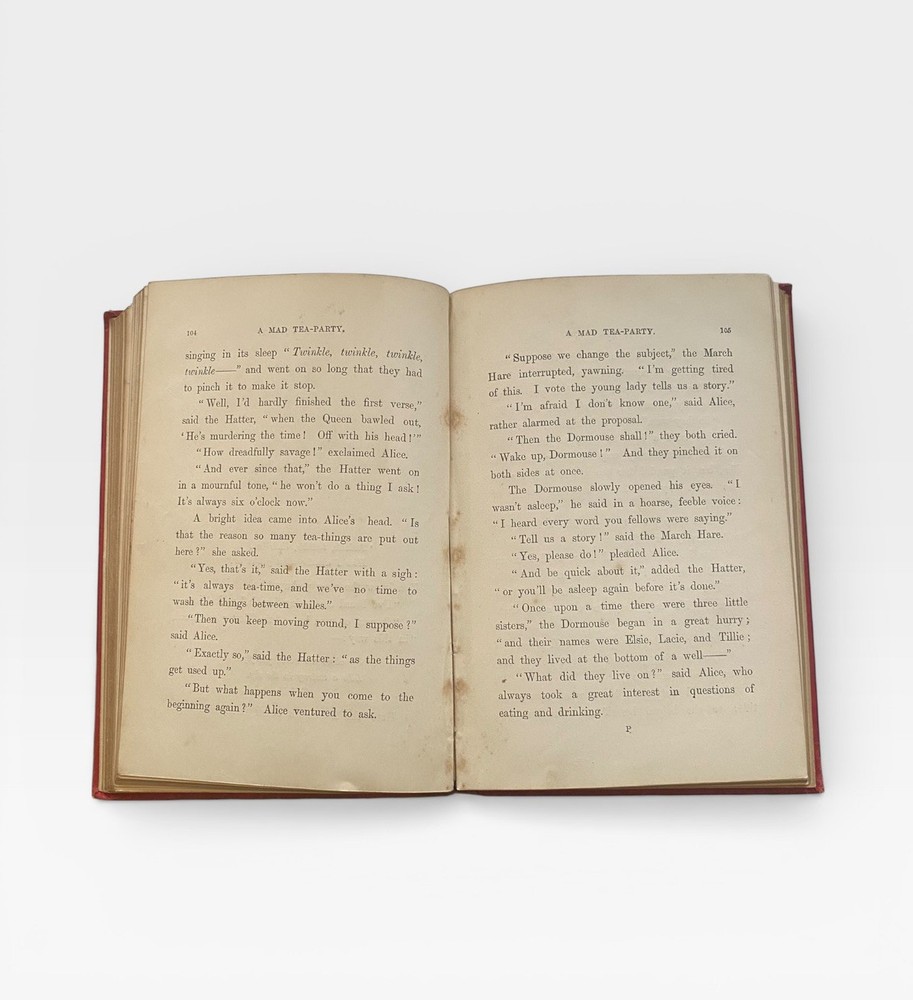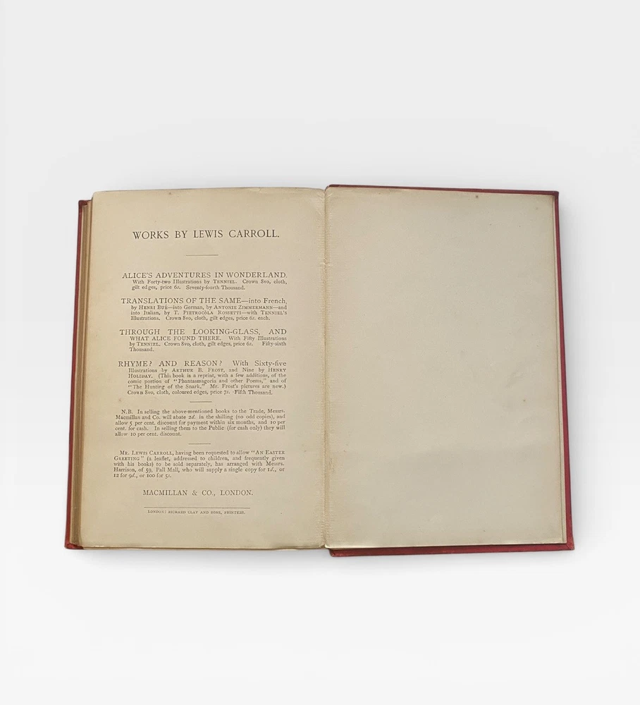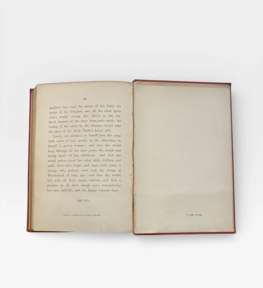 Offered for sale is an original 1885 copy of “Alice’s Adventures in Wonderland” by Lewis Carroll, published by Macmillan and Co., London, with the classic 42 illustrations by John Tenniel. This example is the “Seventy-Fifth Thousand” edition, printed in 1885. 📚 Details: • Publisher: Macmillan and Co., London • Year: 1885 • Edition: Seventy-Fifth Thousand • With 42 illustrations by John Tenniel • Original red cloth binding with gilt decoration • Gilt lettering to spine 📖 Condition: • Original publisher’s red cloth boards • Wear to edges and corners • Some rubbing and fading to spine • Front and rear inner hinges show age-related wear • Light foxing and age toning to pages • Gilt page edges • Structurally sound and complete A genuine late 19th-century example of one of the most iconic works of English literature. A highly collectible Victorian edition in original binding. Ideal for collectors of Lewis Carroll, illustrated classics, and 19th-century literature.