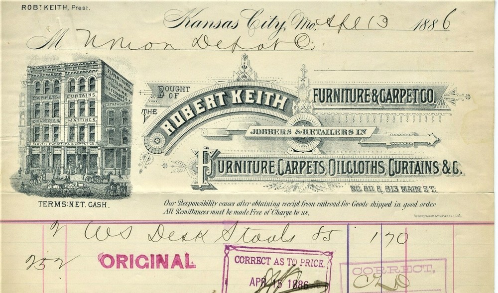 GRAPHIC 1886 BILLHEAD AND UNION DEPOT VOUCHER KANSAS CITY MISSOURI , ROBERT KEITH FURNITURE & CARPET CO. 2 PCS ORIGINAL. JOBBER AND RETAILERS IN FURNITURE, CARPETS, OILCLOTHS AND CURTAINS ADDRESS: 811, 813, MAIN ST. PRESIDENT: ROBERT KEITH VOUCHER SIGNED BY RAILROAD MOGUL, GEORGE NETTLETON SOLD TO: UNION DEPOT TRAIN STATION (NOT TO BE CONFUSED WITH THE MORE MODERN UNION STATION). SEE MY STORE: VINTAGE HARDWARE STORE COLLECTIBLES George H. Nettleton Railroad Baron 1831-1896 by Daniel Coleman At the peak of his career, George Nettleton lived in a West Bluffs mansion overlooking the Kansas City Stock Yards and Union Depot, both of which he managed in addition to the 800 miles of railroad track and 2,000 employees under his command. Nettleton was as close to a railroad baron as Kansas City could boast in the late 1800s, with the exception that he was not an owner of the various lines he controlled. George H. Nettleton was born November 13, 1831, in Chicopee Falls, Massachusetts, located just northwest of Springfield. The 1850s saw Nettleton’s career as an engineer advancing steadily along with the miles of track laid by the various railroads for which he worked. . He served for a time as an assistant, then general superintendent of the Hannibal & St. Joseph Railroad. The Hannibal Bridge opened under Nettleton’s watch in 1869. Nettleton was also instrumental in the laying of one of the earliest rail lines in the Kansas City area when he oversaw completion of the Cameron to Kansas City road. In 1872, Nettleton became the general superintendent of the Atchison, Topeka & Santa Fe Railroad, and from his headquarters in Topeka, Kansas, supervised the line’s extension as far as the state’s western border. He moved to Kansas City in 1874 and turned his attention toward developing the growing transportation center his railroad endeavors had helped to create. He organized and managed the Kansas City Stockyards, and, at the helm of the Union Depot Company, administered the city’s first major railroad station and yards in the West Bottoms. Nettleton was an important link to eastern capitalists who backed Kansas City business ventures. He helped incorporate the First National Bank of Kansas City and served as president of the Fort Scott & Memphis Railway. In the early 1890s, they built a 12-room, brick mansion on the West Bluffs at 7th Street overlooking Nettleton’s industrial domain, but he died only a few years later at age 64, on March 26, 1896. In 1900, Julia Nettleton donated the structure to be used as a home for elderly women, and although these occupants moved to new quarters in 1917. ORIGINAL, LETTERHEADS, BILLHEAD, BILLHEADS, HARDWARE.