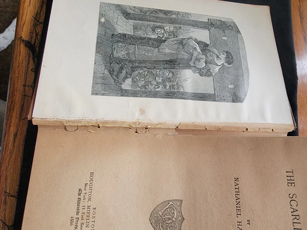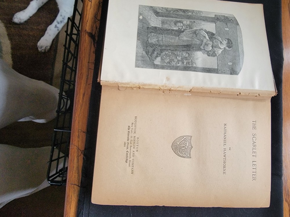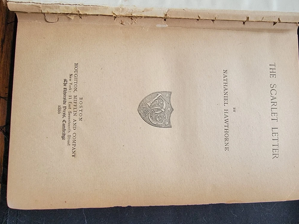This 1886 printing of The Scarlet Letter by Nathaniel Hawthorne is a must-have for any literature collector. Published by Houghton Mifflin Harcourt, this book delves into the topic of letters in a beautifully written narrative. It is a great addition to any book collection and a must-have for fans of Hawthorne's work. There are minimal water marks on the outside. There are penciled names before getting to the title page. Separation of the title page from binding runs about halfway.