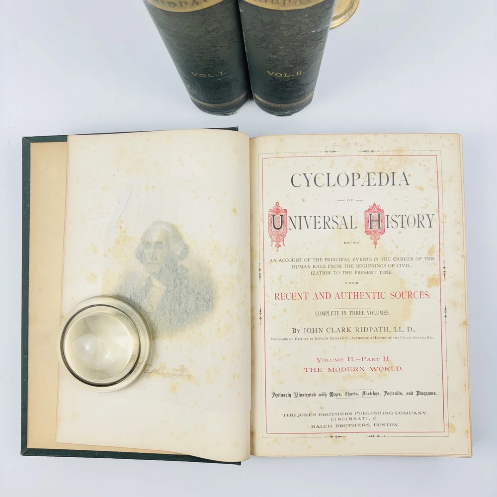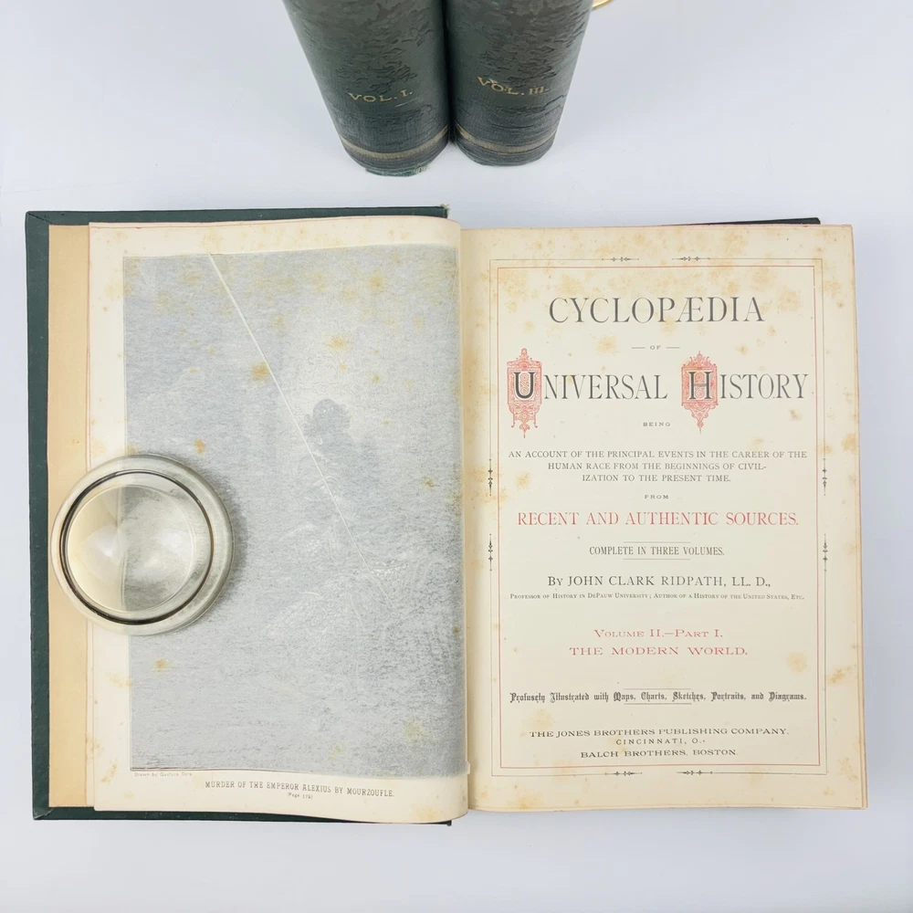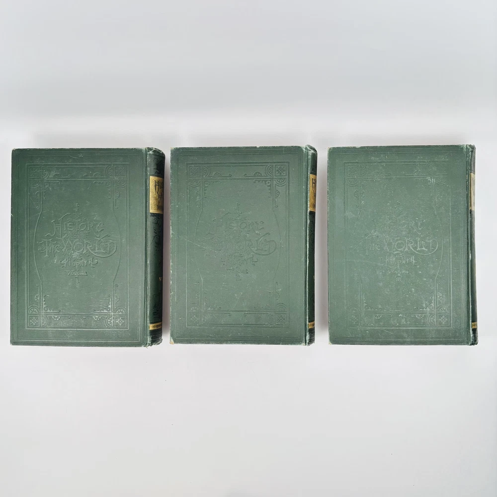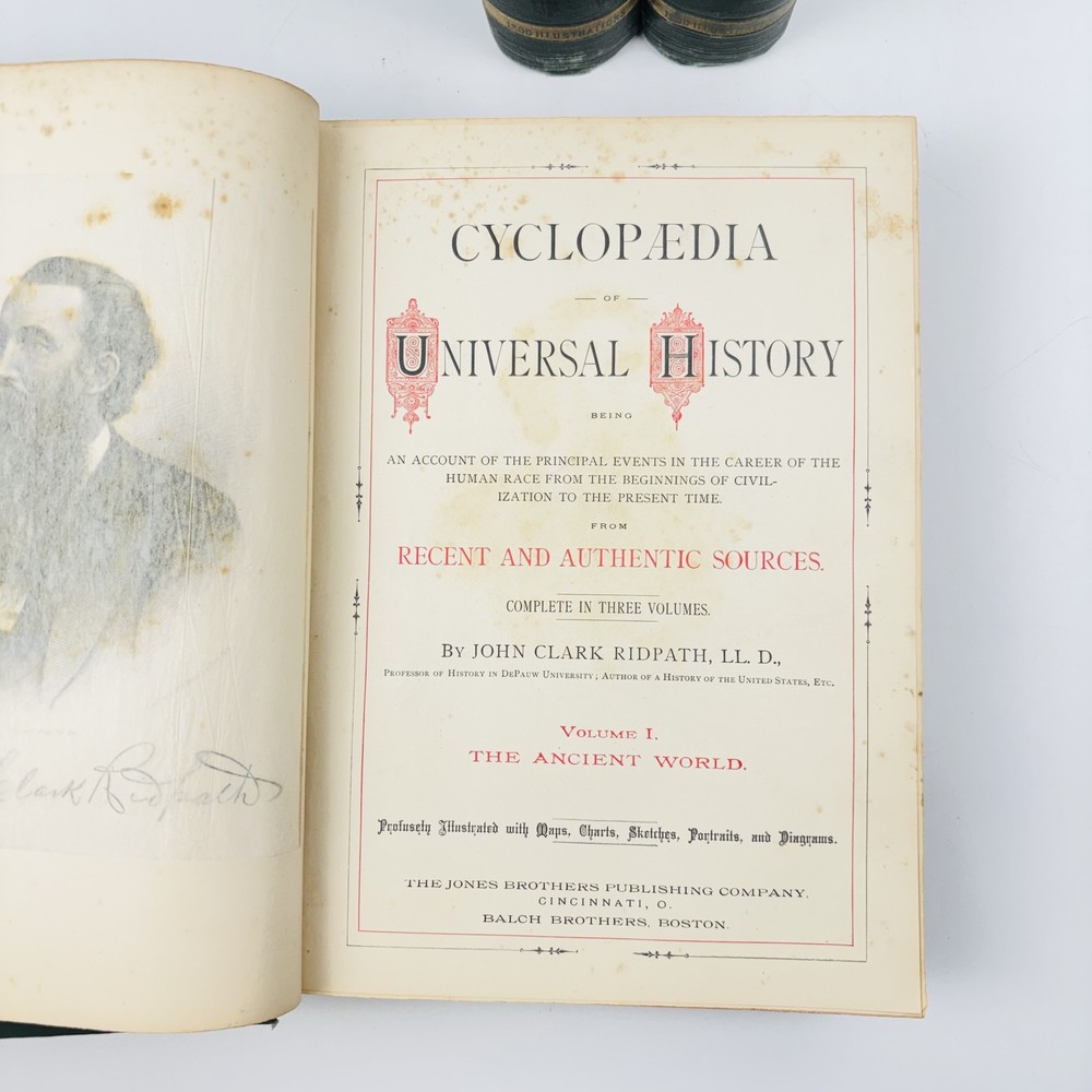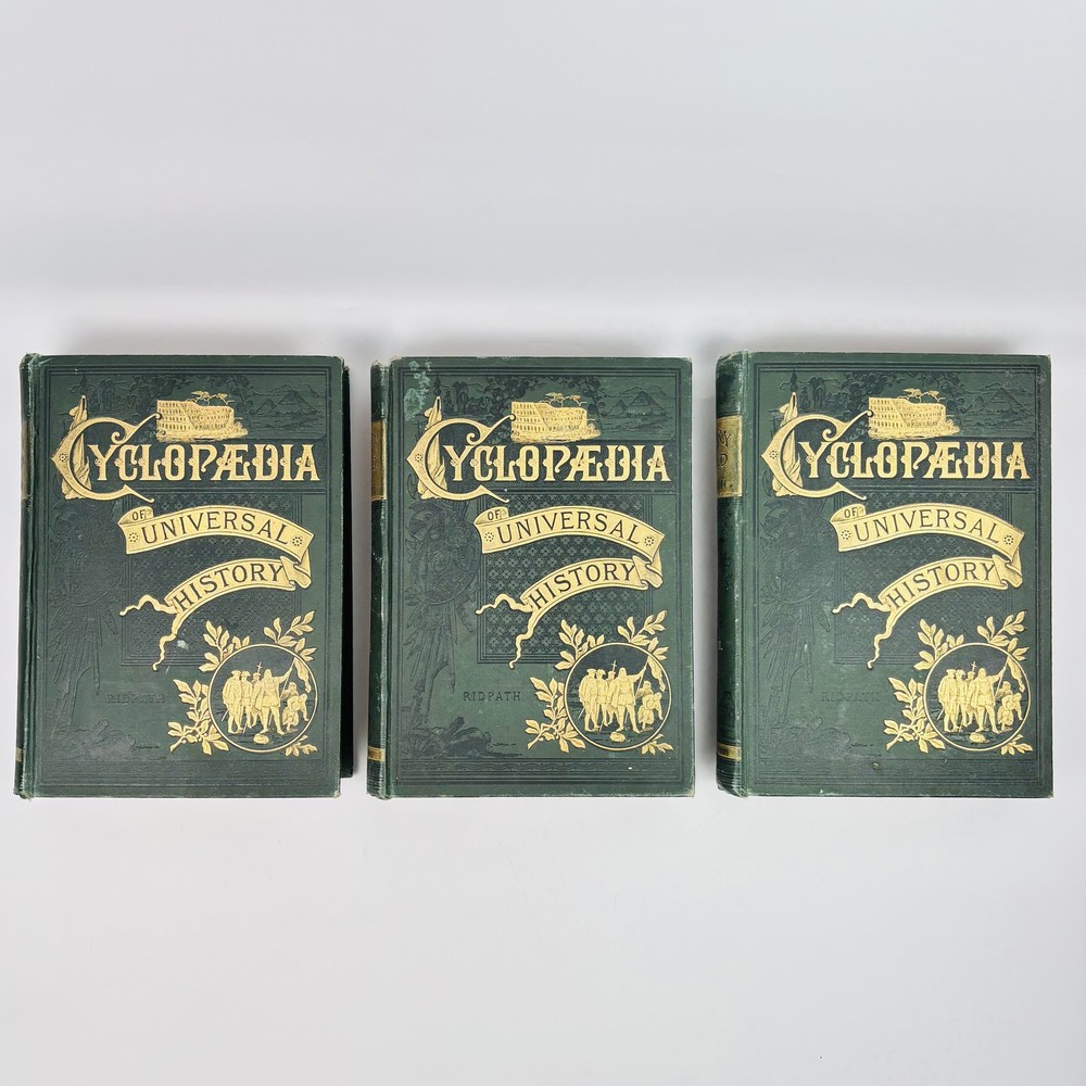 This is a handsome three-volume set of "Cyclopaedia of Universal History" by John Clark Ridpath, published in 1886. The set covers universal history from ancient to modern times, profusely illustrated with maps, charts, portraits, and diagrams. Bound in decorative green hardcover with gilt lettering and illustrations. Volume I covers 'The Ancient World', Volume II covers 'The Modern World, Part I', and Volume III covers 'The Modern World, Part II'. This set is a first edition and would make a significant addition to any antiquarian book collection. Condition: Good overall antique condition. Hardcover bindings are sturdy with some shelf wear, rubbing to edges, and minor fading. Spines show some wear but retain their decorative elements. Internal pages are generally clean with some age-toning and occasional foxing. Front hinge in Volume I & II are cracked. Some minor water staining on endpapers of Volume I (visible in image). Please see all photos for a detailed visual description of the condition.