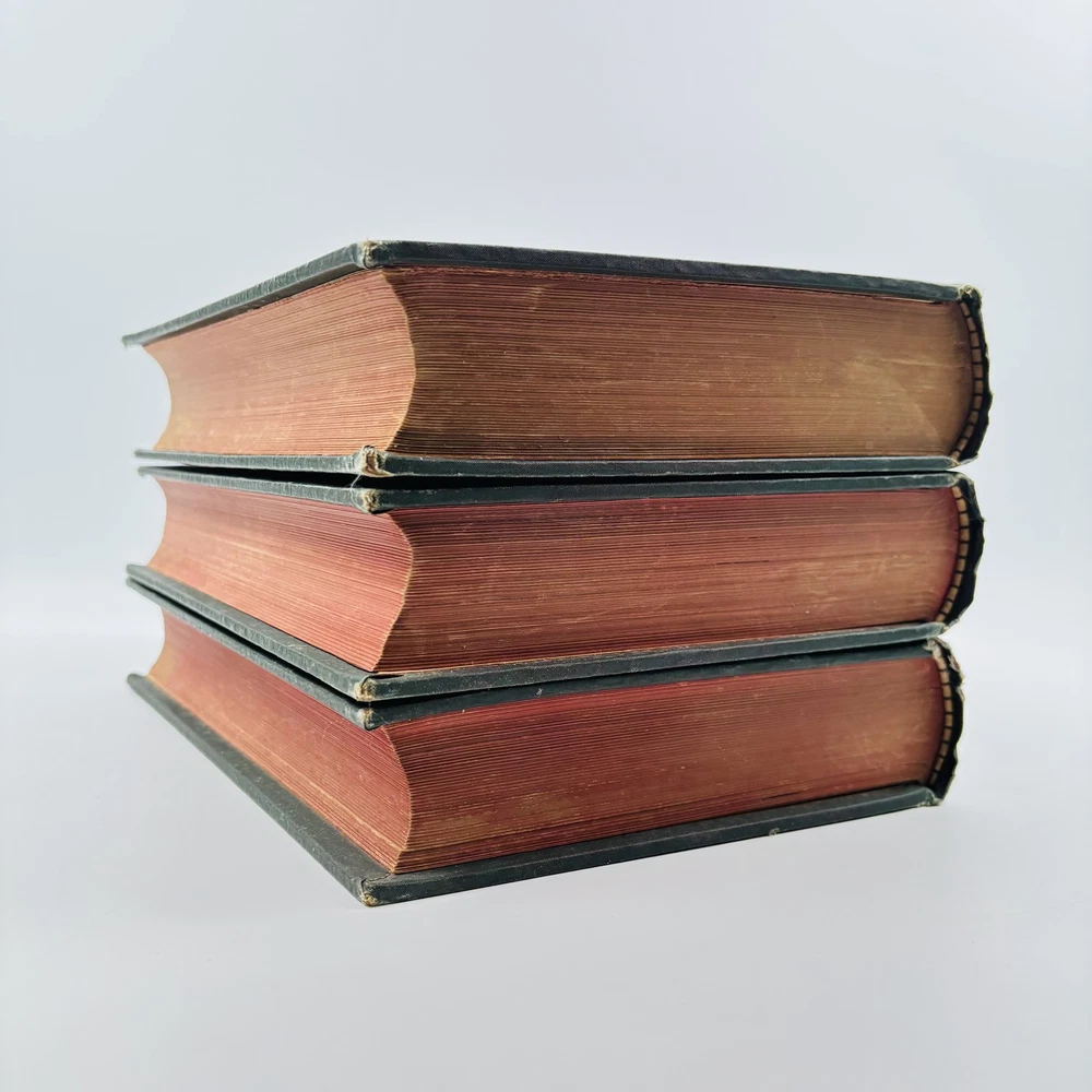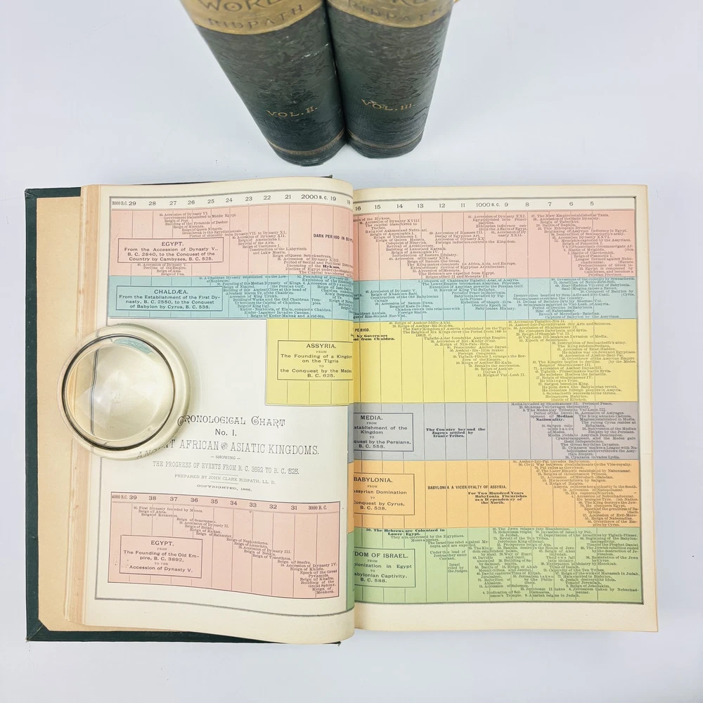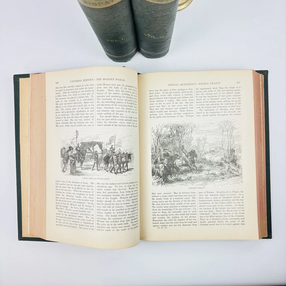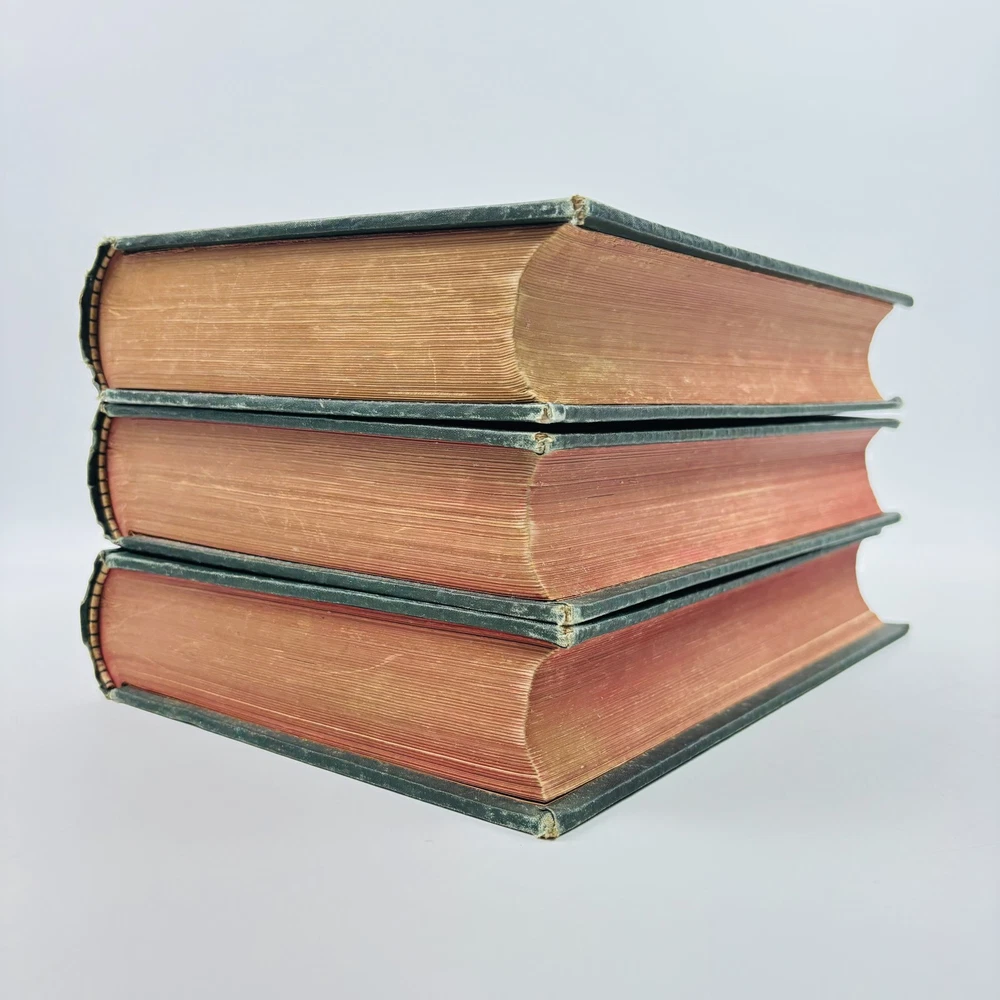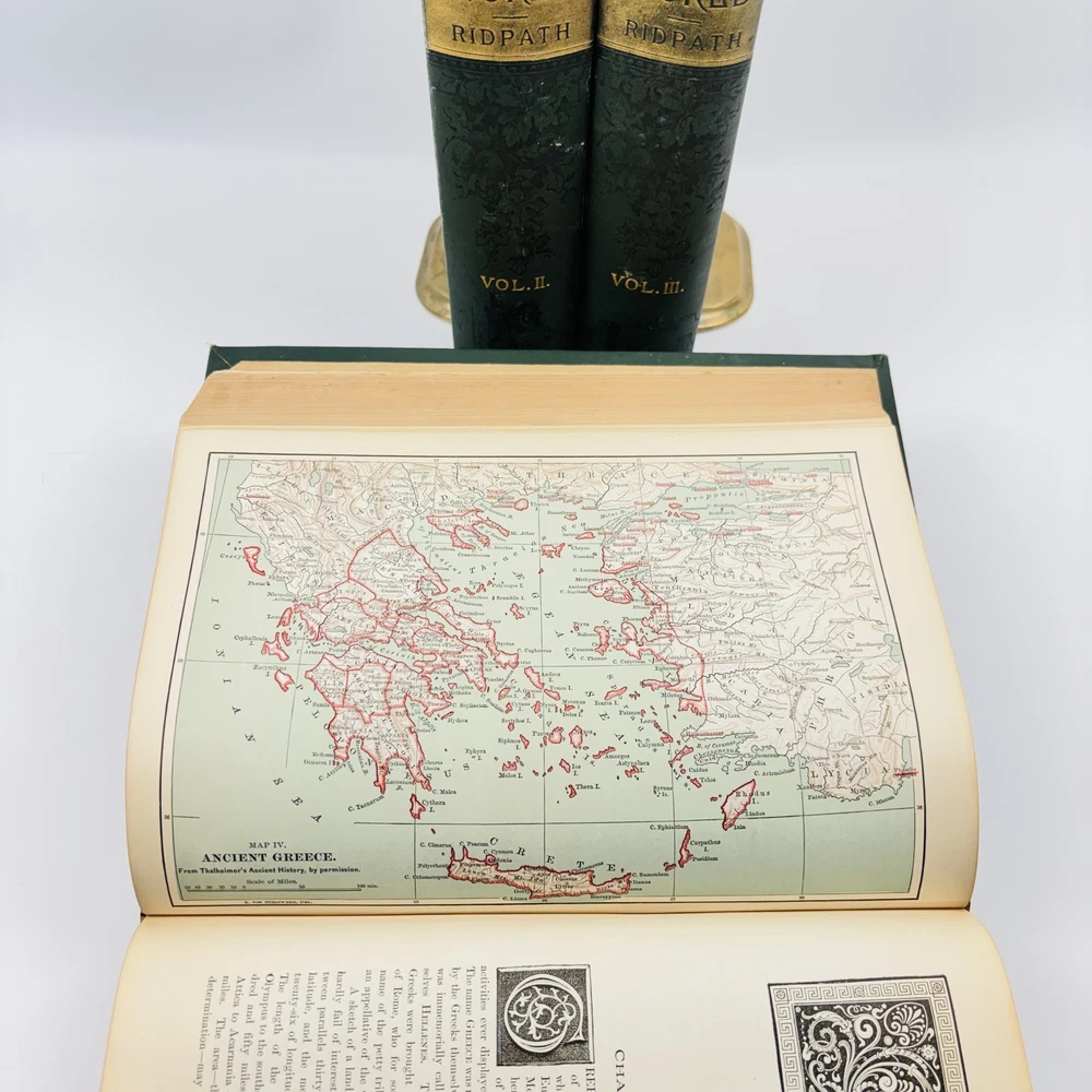 This is a handsome three-volume set of "Cyclopaedia of Universal History" by John Clark Ridpath, published in 1886. The set covers universal history from ancient to modern times, profusely illustrated with maps, charts, portraits, and diagrams. Bound in decorative green hardcover with gilt lettering and illustrations. Volume I covers 'The Ancient World', Volume II covers 'The Modern World, Part I', and Volume III covers 'The Modern World, Part II'. This set is a first edition and would make a significant addition to any antiquarian book collection. Condition: Good overall antique condition. Hardcover bindings are sturdy with some shelf wear, rubbing to edges, and minor fading. Spines show some wear but retain their decorative elements. Internal pages are generally clean with some age-toning and occasional foxing. Front hinge in Volume I & II are cracked. Some minor water staining on endpapers of Volume I (visible in image). Please see all photos for a detailed visual description of the condition.