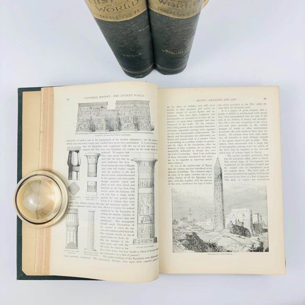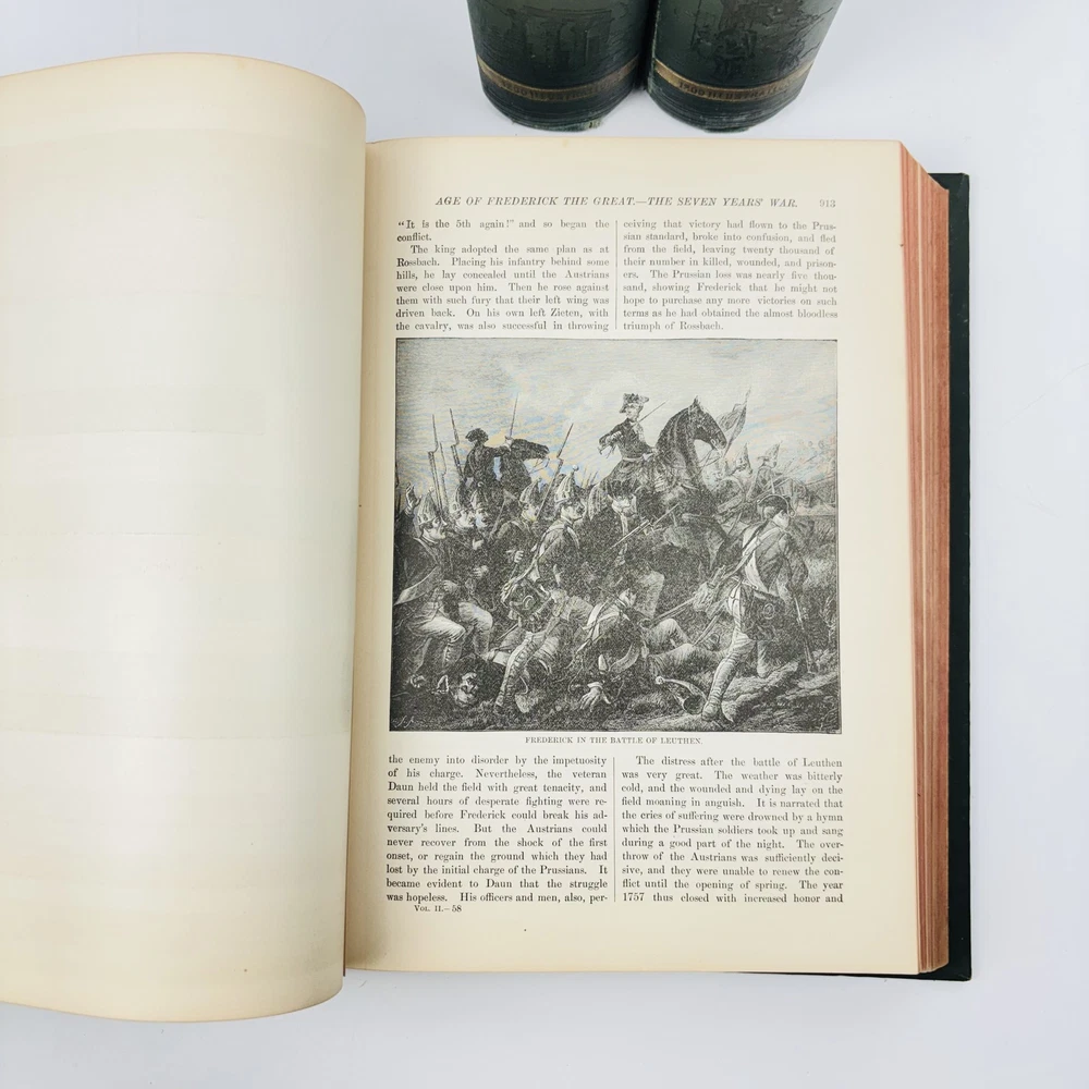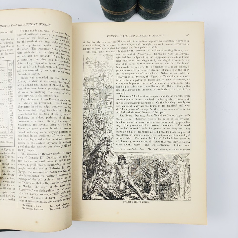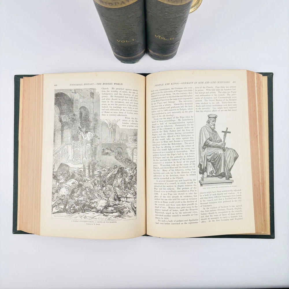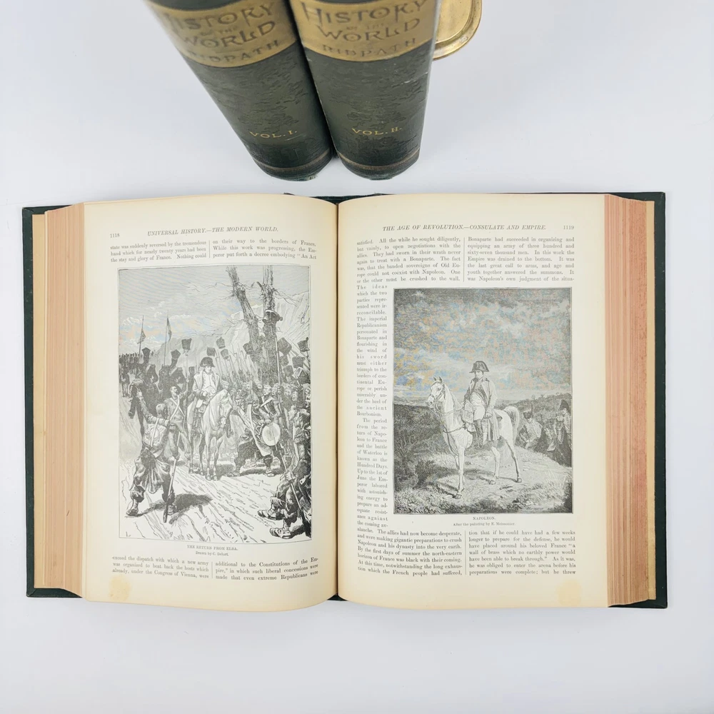 This is a handsome three-volume set of "Cyclopaedia of Universal History" by John Clark Ridpath, published in 1886. The set covers universal history from ancient to modern times, profusely illustrated with maps, charts, portraits, and diagrams. Bound in decorative green hardcover with gilt lettering and illustrations. Volume I covers 'The Ancient World', Volume II covers 'The Modern World, Part I', and Volume III covers 'The Modern World, Part II'. This set is a first edition and would make a significant addition to any antiquarian book collection. Condition: Good overall antique condition. Hardcover bindings are sturdy with some shelf wear, rubbing to edges, and minor fading. Spines show some wear but retain their decorative elements. Internal pages are generally clean with some age-toning and occasional foxing. Front hinge in Volume I & II are cracked. Some minor water staining on endpapers of Volume I (visible in image). Please see all photos for a detailed visual description of the condition.