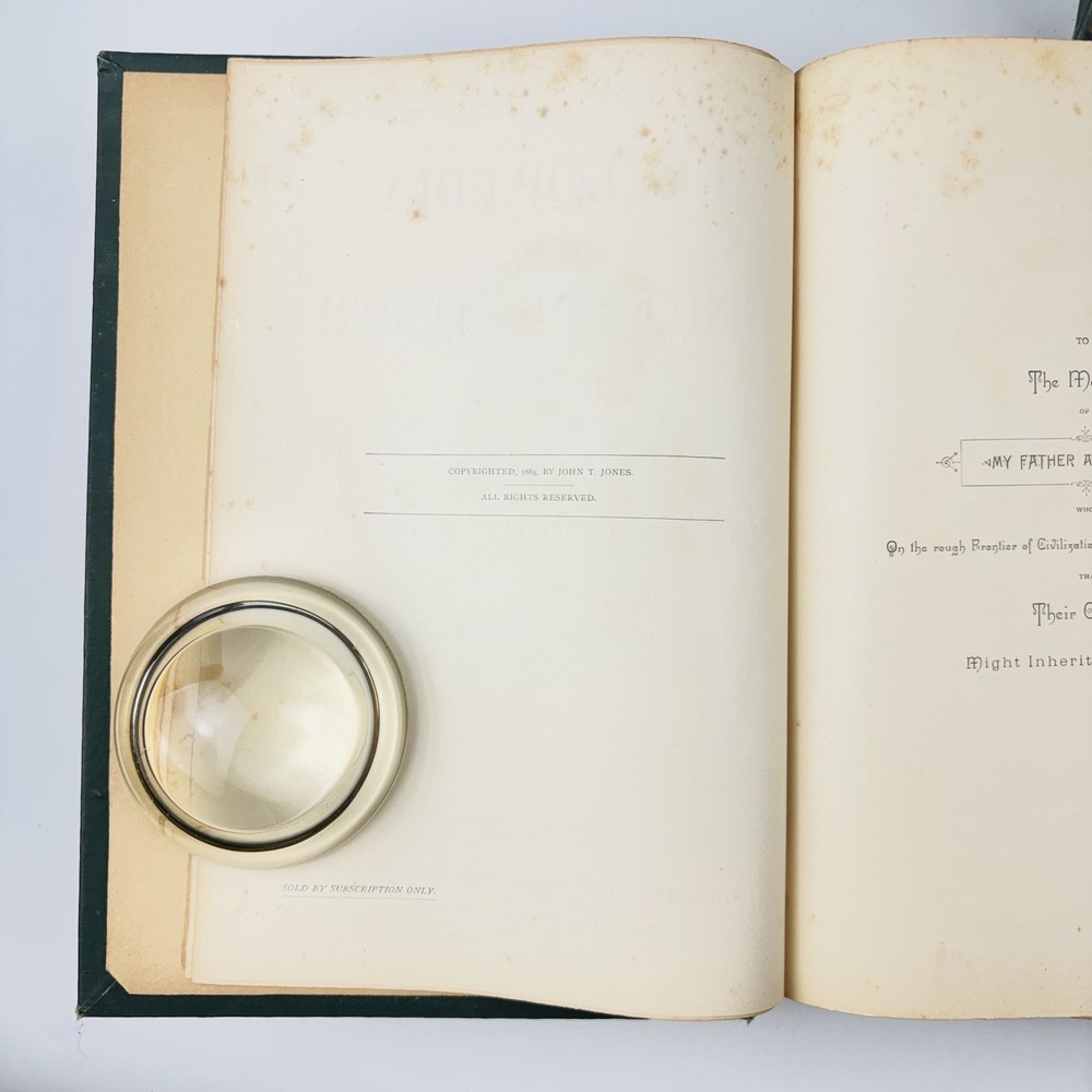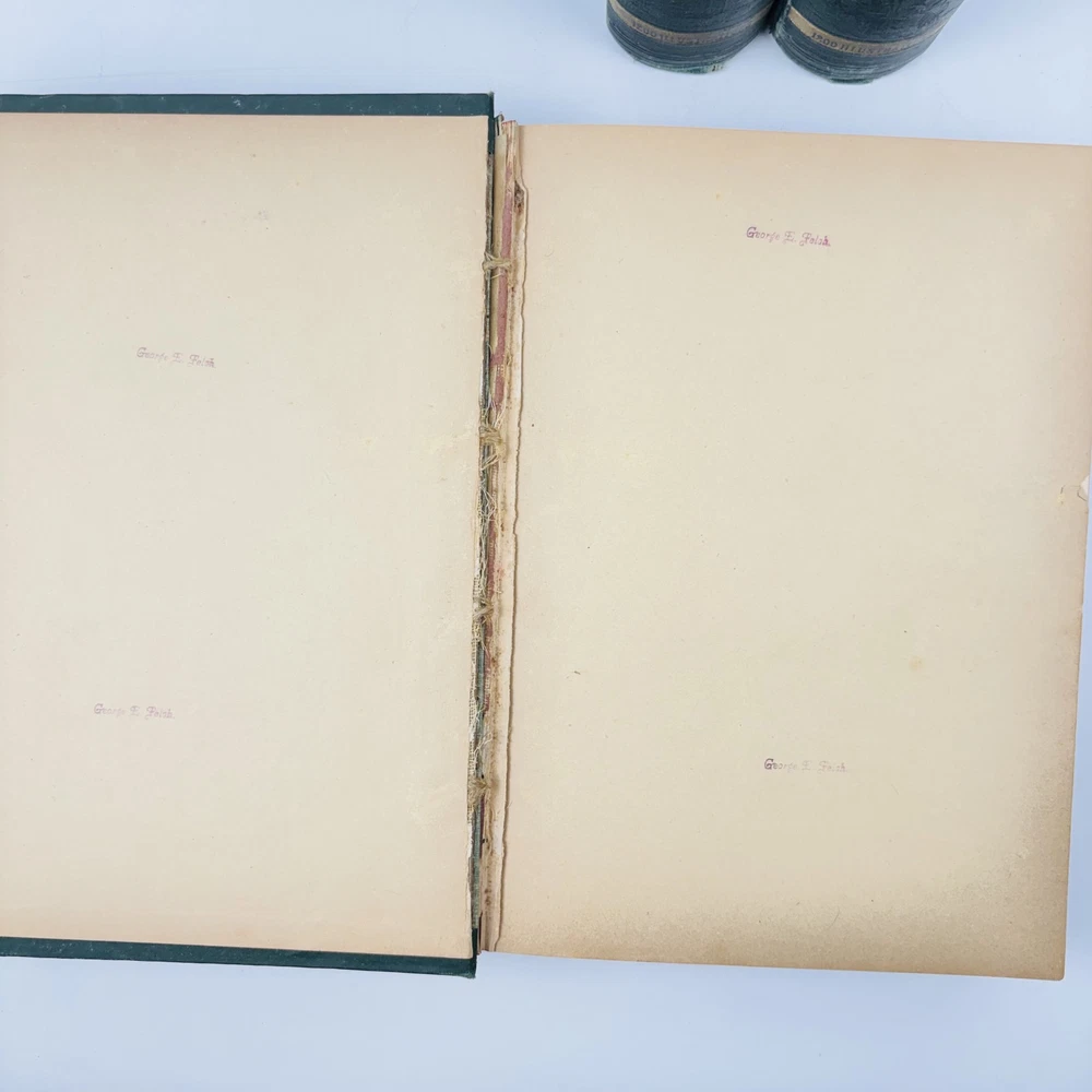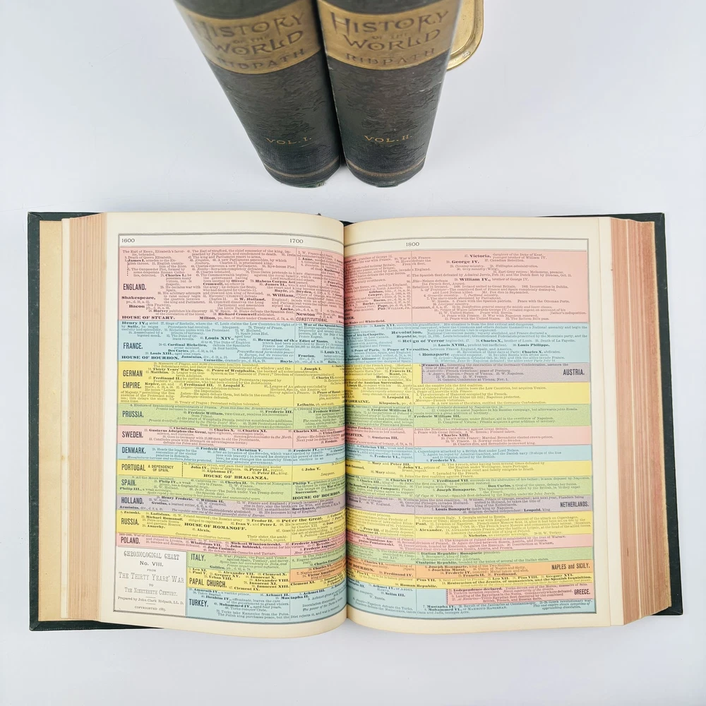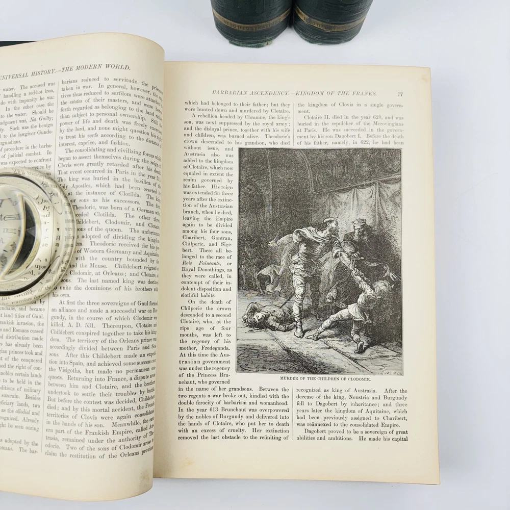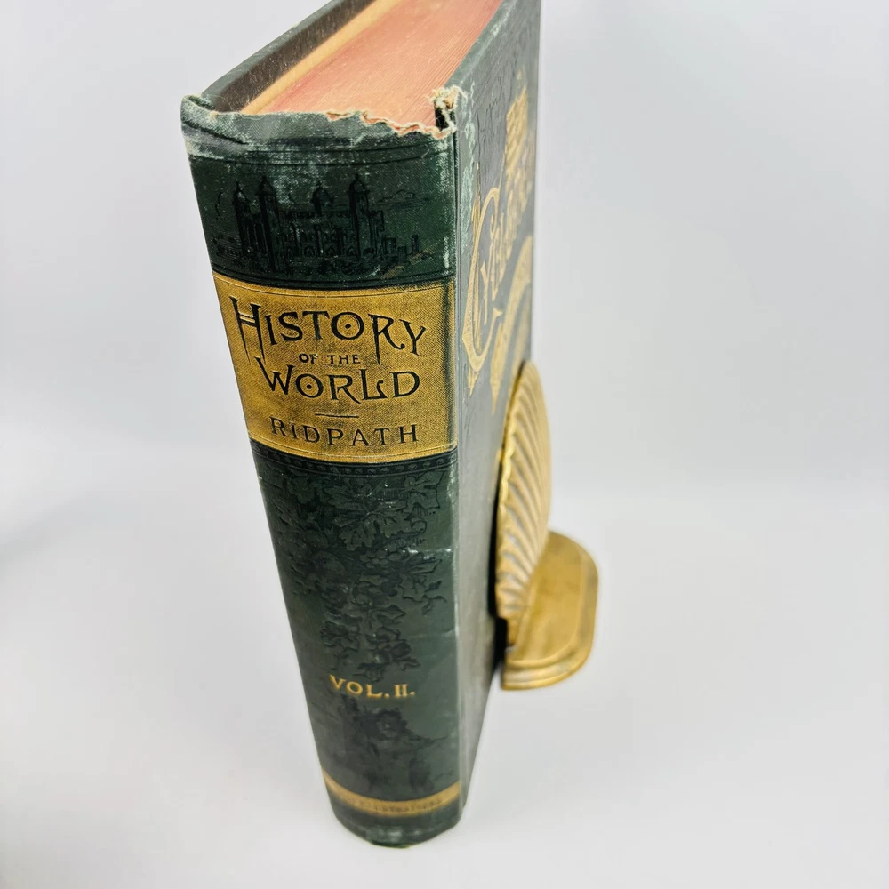 This is a handsome three-volume set of "Cyclopaedia of Universal History" by John Clark Ridpath, published in 1886. The set covers universal history from ancient to modern times, profusely illustrated with maps, charts, portraits, and diagrams. Bound in decorative green hardcover with gilt lettering and illustrations. Volume I covers 'The Ancient World', Volume II covers 'The Modern World, Part I', and Volume III covers 'The Modern World, Part II'. This set is a first edition and would make a significant addition to any antiquarian book collection. Condition: Good overall antique condition. Hardcover bindings are sturdy with some shelf wear, rubbing to edges, and minor fading. Spines show some wear but retain their decorative elements. Internal pages are generally clean with some age-toning and occasional foxing. Front hinge in Volume I & II are cracked. Some minor water staining on endpapers of Volume I (visible in image). Please see all photos for a detailed visual description of the condition.