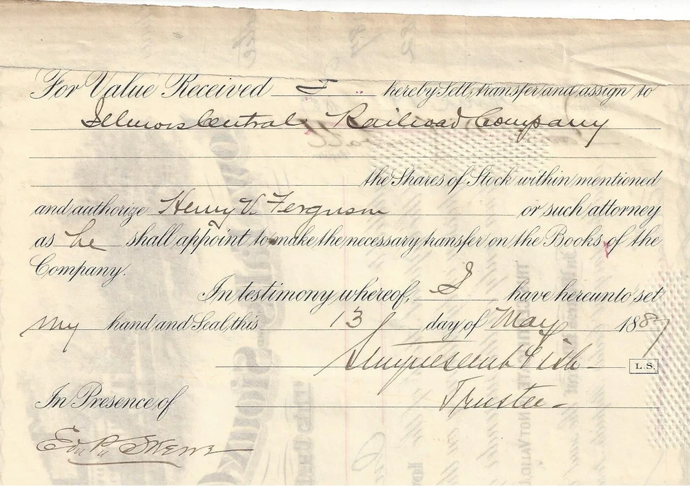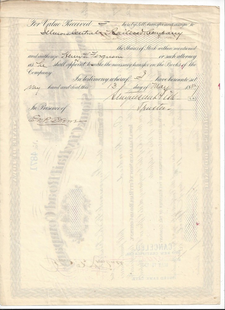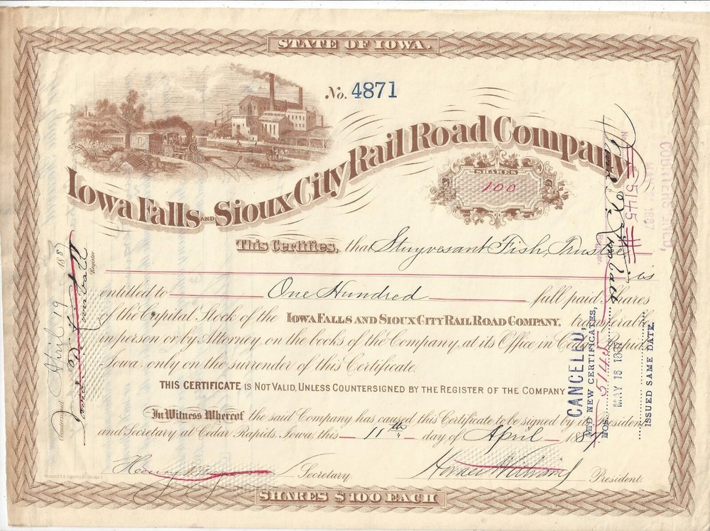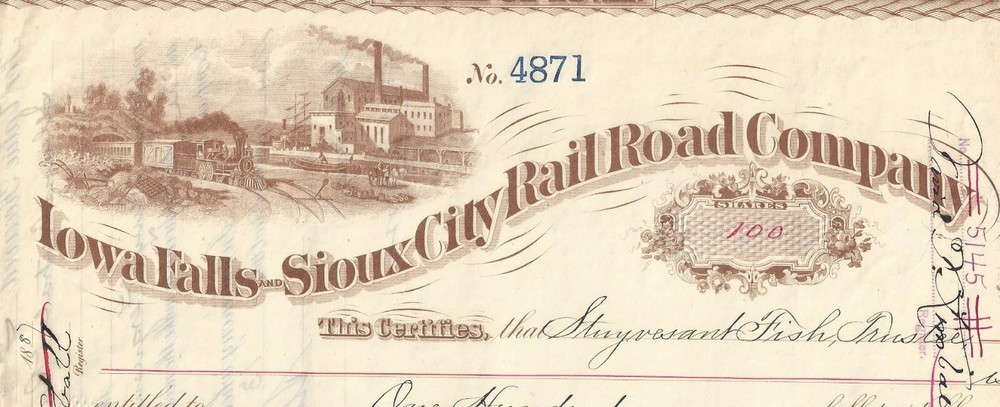 Iowa Falls & Sioux City Railroad Company Cedar Rapids, Iowa Capital Stock Certificate for 100 shares, #4871, Dated 1871 In BROWN Issued to Stuyvesant Fish, Trustee and signed on back ** NOTEWORTHY ** PRINTER: Western B. N. Engraving Co. Chicago Information image copies are included with certificate Images: POSTAGE U.S. Sent First Class with tracking, starting @ $6.00 US Canada Sent First Class Canada with no tracking, starting @ $6.00 US NON U.S, case by case, starting @ $8.00 US, sent First Class. I do ship world wide. -- All the certificates and all other items I sell are sold as collectibles only; although they are authentic, they no longer hold financial value. I do have other items up for auction. I Do Combine