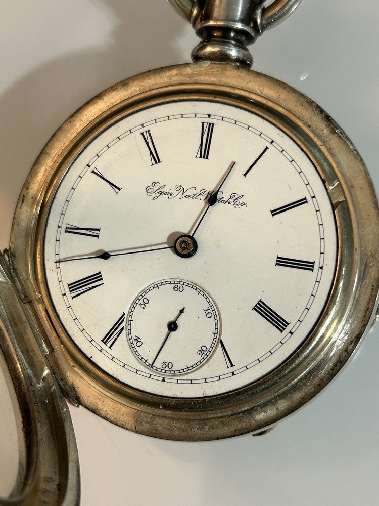 Elgin pocket watch coin silver very heavy all parts intact just stop working .