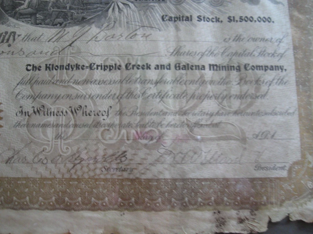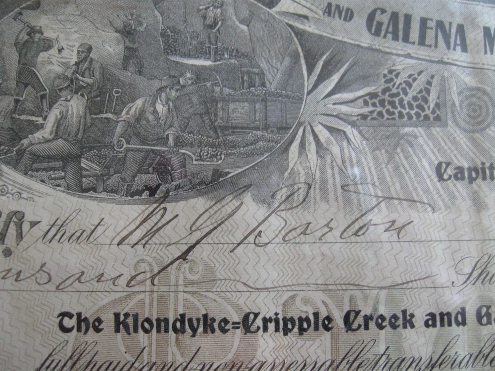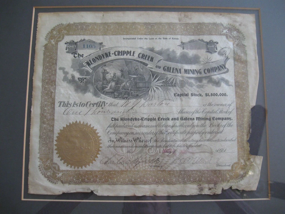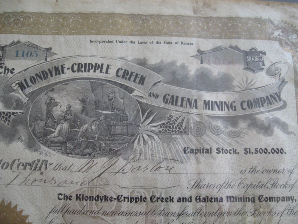Offered here is an original likely 1890's Mining Stock Certificate from The Klondyke - Cripple Creek and Galena Mining Company. Signed by the mining company President and issued. Professionally framed and matted, with the frame measuring 15.75 x 13.75. Incorporated under the laws of Kansas. I believe this was one of the Galena Mines in the Tri-State Lead Mining District of Kansas, Missouri and Oklahoma, with ties perhaps to Cripple Creek Colorado. A great display piece of Kansas Mining History well suited for any wall. Thanks for looking!