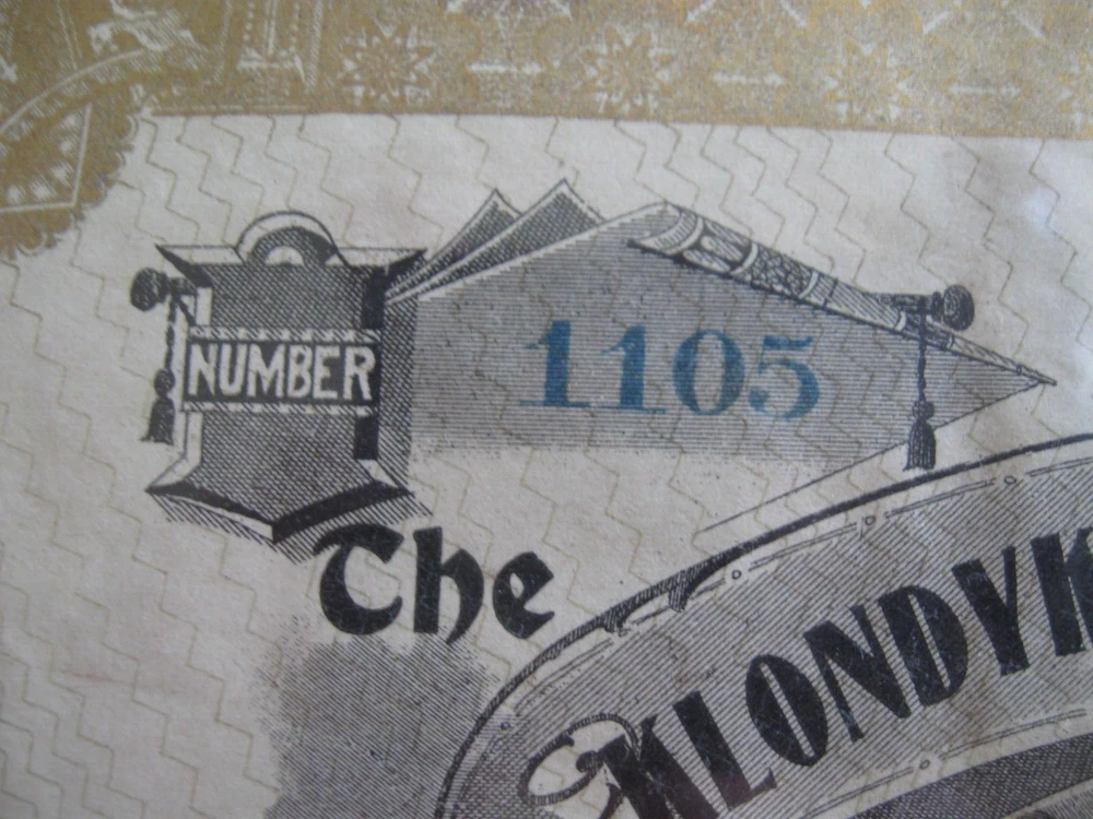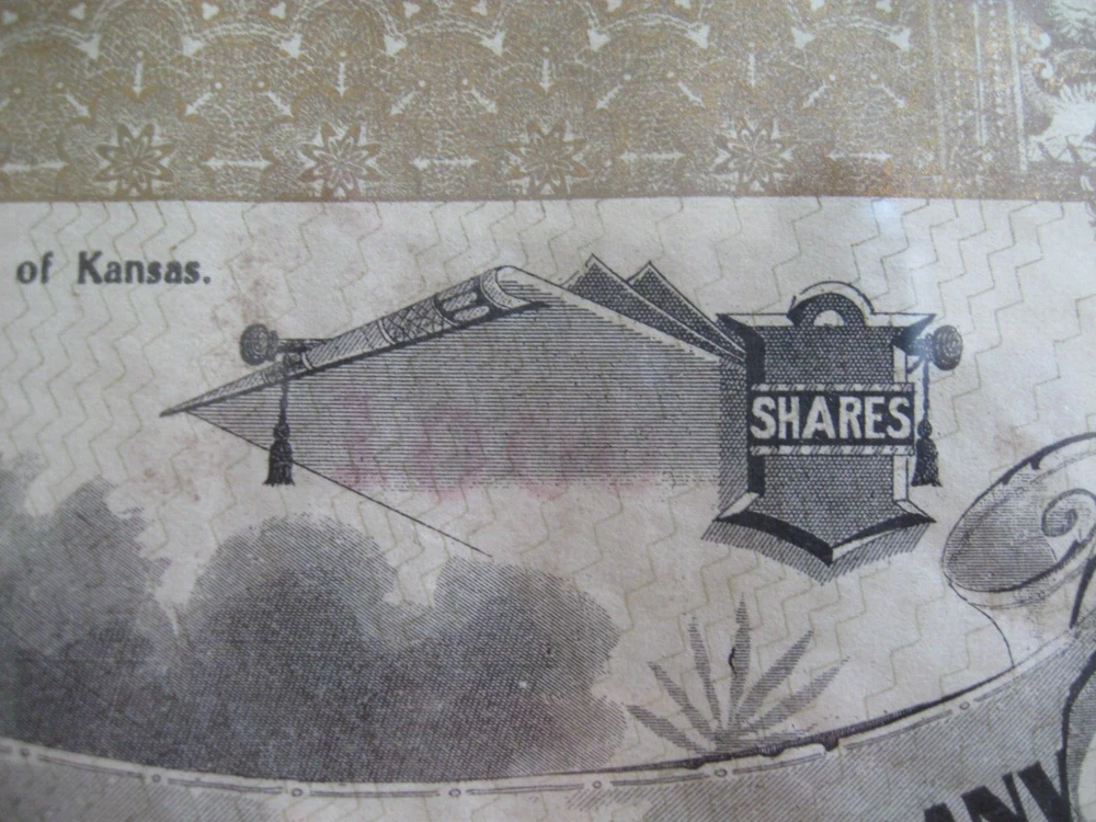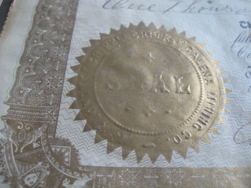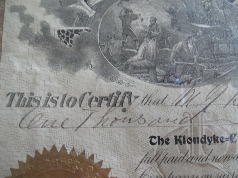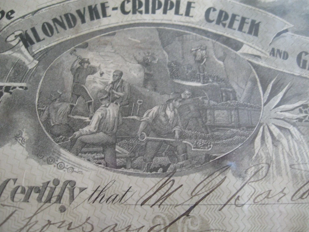 Offered here is an original likely 1890's Mining Stock Certificate from The Klondyke - Cripple Creek and Galena Mining Company. Signed by the mining company President and issued. Professionally framed and matted, with the frame measuring 15.75 x 13.75. Incorporated under the laws of Kansas. I believe this was one of the Galena Mines in the Tri-State Lead Mining District of Kansas, Missouri and Oklahoma, with ties perhaps to Cripple Creek Colorado. A great display piece of Kansas Mining History well suited for any wall. Thanks for looking!