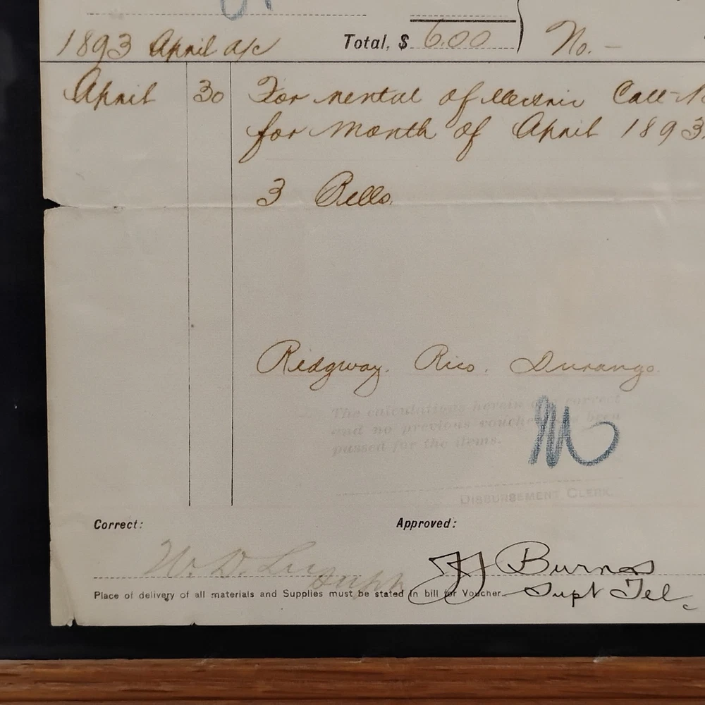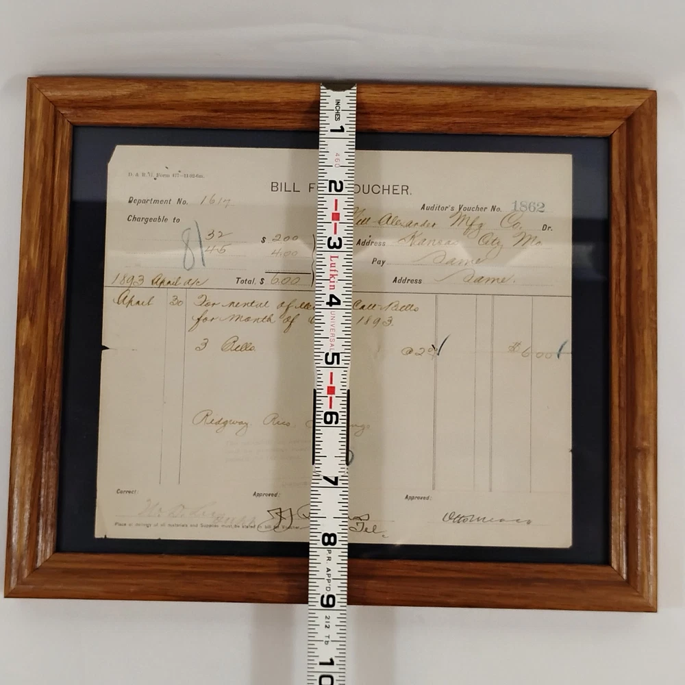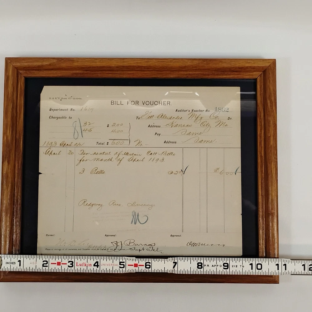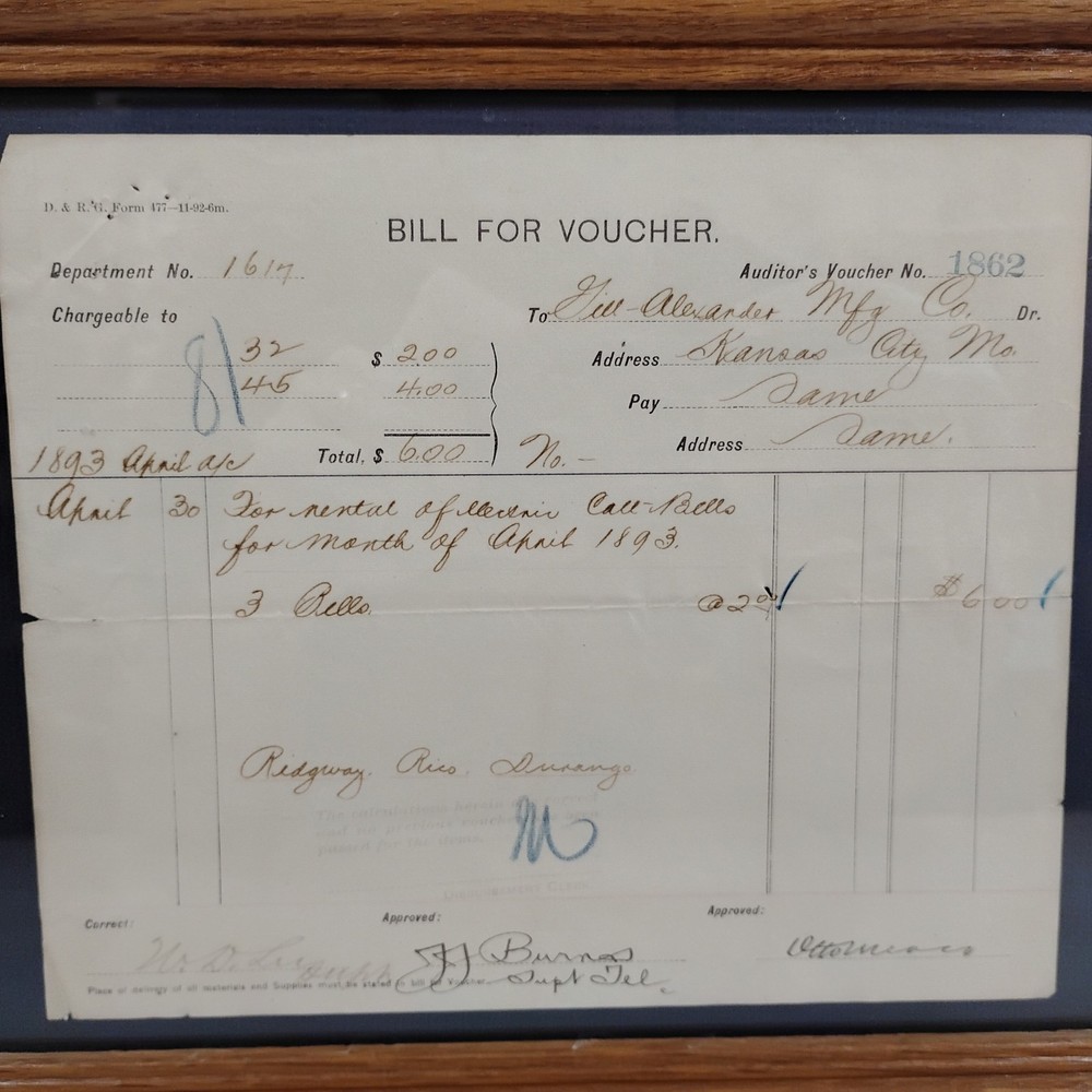 An authentic antique 'BILL FOR VOUCHER' document from the Denver & Rio Grande Railroad (D&RG), dated April 1893. This historical railroad ephemera details a payment to G.W. Alexander Manufacturing Co. of Kansas City, Missouri, for the rental of 'electric call bells' for the month of April 1893. The voucher also references 'Redgway, Rico, Durango', indicating its connection to the D&RG's operations in Colorado. It is signed by 'J.J. Burnas, Supt Tel' (Superintendent of Telegraph) and 'W.D. Leegh', and approved by 'Ottomar'. This piece offers a fascinating glimpse into late 19th-century railroad operations, inter-company transactions, and early electrical equipment usage. The document is presented in a classic wooden frame, ready for display. A unique collectible for railroad enthusiasts, history buffs, or collectors of American mercantile antiques.