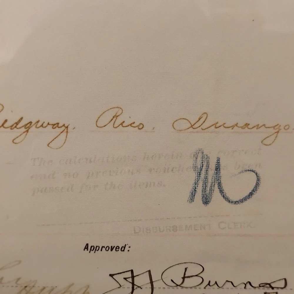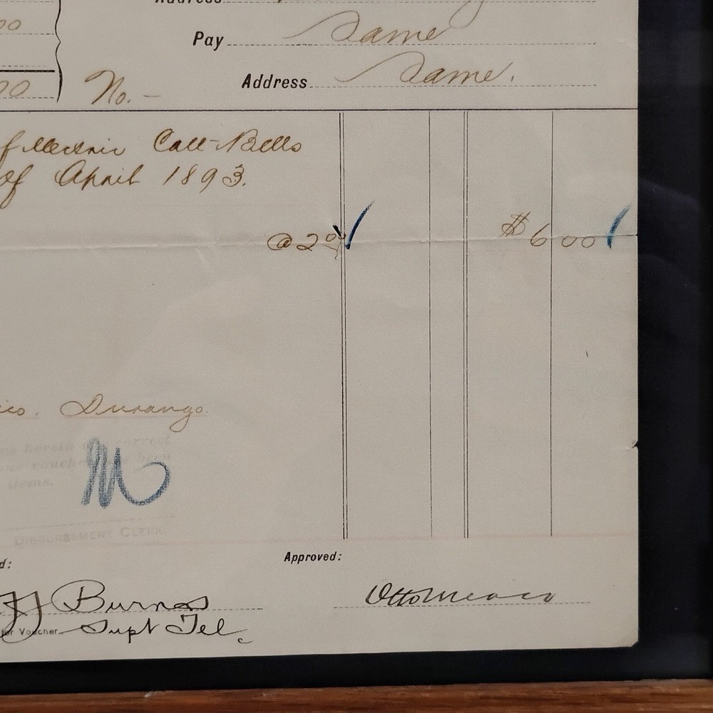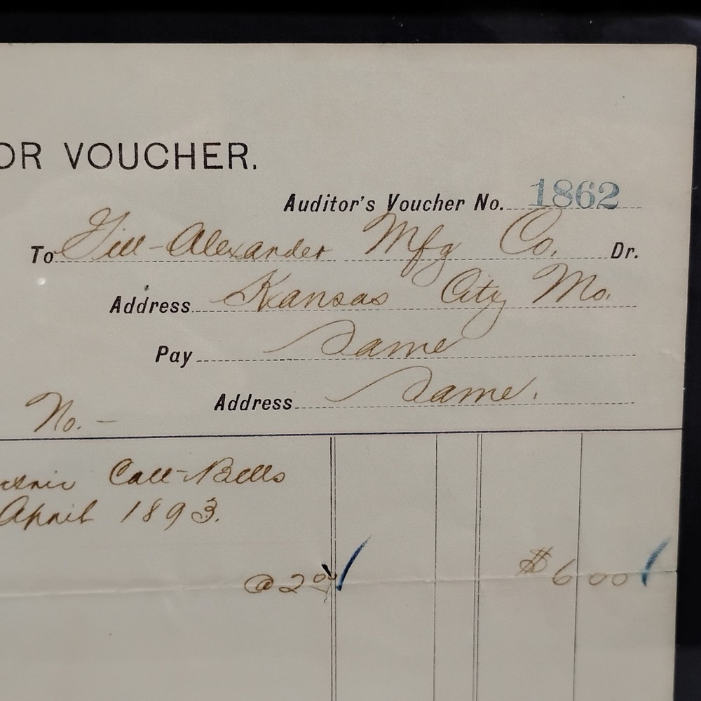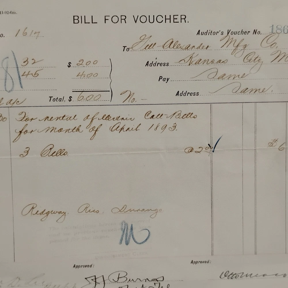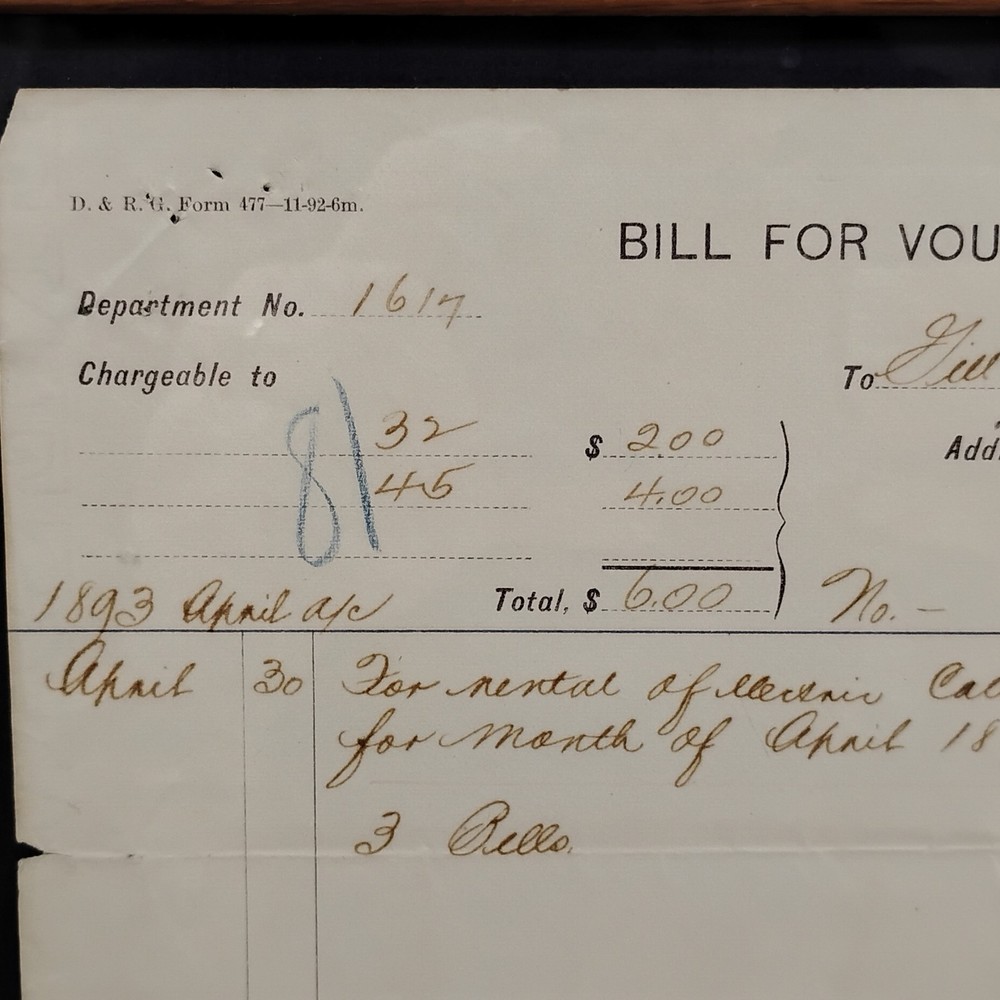 An authentic antique 'BILL FOR VOUCHER' document from the Denver & Rio Grande Railroad (D&RG), dated April 1893. This historical railroad ephemera details a payment to G.W. Alexander Manufacturing Co. of Kansas City, Missouri, for the rental of 'electric call bells' for the month of April 1893. The voucher also references 'Redgway, Rico, Durango', indicating its connection to the D&RG's operations in Colorado. It is signed by 'J.J. Burnas, Supt Tel' (Superintendent of Telegraph) and 'W.D. Leegh', and approved by 'Ottomar'. This piece offers a fascinating glimpse into late 19th-century railroad operations, inter-company transactions, and early electrical equipment usage. The document is presented in a classic wooden frame, ready for display. A unique collectible for railroad enthusiasts, history buffs, or collectors of American mercantile antiques.