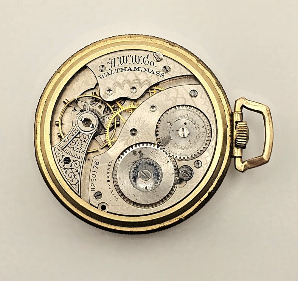 Just got this gorgeous vintage Waltham pocket watch from an auction! The balance wheel spins but it doesn't run, so it's a perfect project piece for collectors. Love the classic silver dial with Arabic numerals and the yellow gold case. Can't wait to restore it!