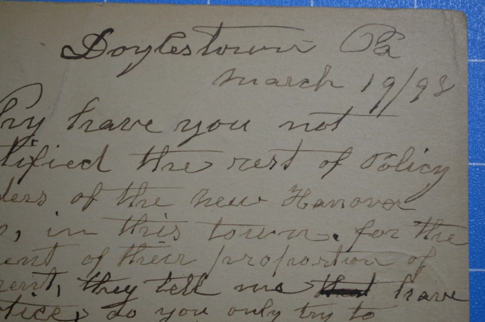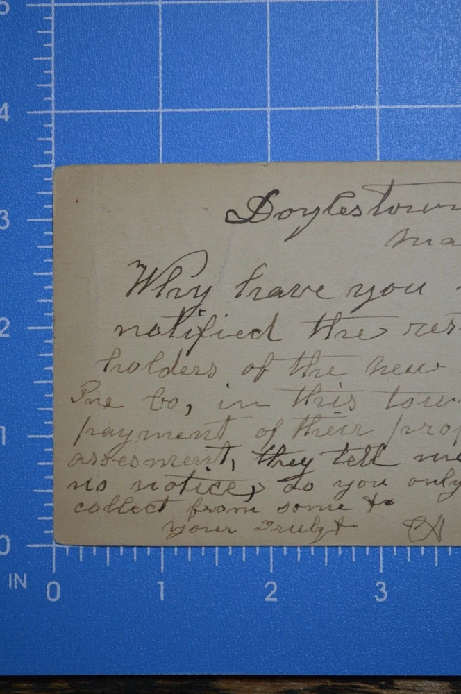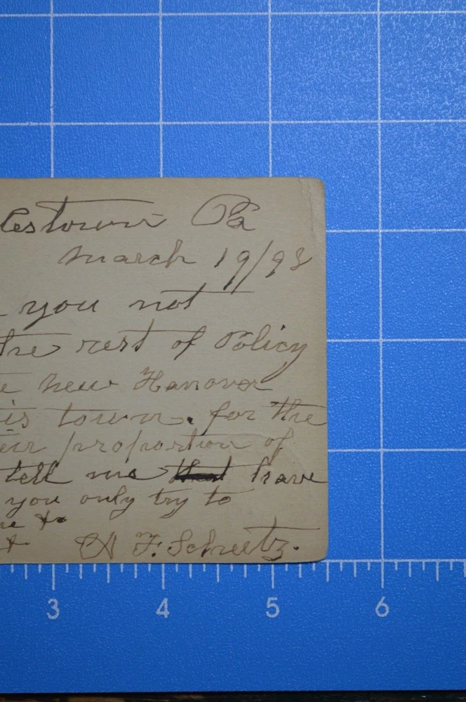 Description:1898 Doylestown Bucks County PA Insurance Sheetz Correspondence Posted Postcard. Questions and offers welcome. Please review entire listing (including condition, title, pictures, description, and terms) before committing to purchase this listing. Before agreeing to purchase this listing, make your own determination on condition of the item(s) being offered in this listing. Pictures are part of the description and are provided to help illustrate condition. Since descriptions and opinions of condition can vary, seller provides prospective buyers with the ability to request more information and additional pictures before the close of this listing. When in doubt, please contact Taggart Neveling Books Ephemera, LLC "the seller" through eBay before you bid or agree to purchase this listing. This helps ensure a smooth transaction, one where Taggart Neveling Books Ephemera, LLC gets a sale and the buyer gets the item(s) they want to purchase. Condition & Disclosure of All Faults: All items appearing in this listing are pre-owned and are sold "AS-IS" and "WITH ALL FAULTS." No warranties, express or implied, are made in connection with this listing. Additionally, all other warranties not specifically listed above, are also disclaimed. Since the seller, Taggart Neveling Books Ephemera, LLC, does not provide any warranties with this listing, to the fullest extent allowed by law no sale shall be deemed invalid. A written description and uploaded pictures are offered to help provide a general idea of condition. Pictures are part of the description, but may not show every defect or flaw of an item or collection of items. The written description offered in this listing may not state every single defect or flaw in condition associated with item or items offered in this listing. However, Taggart Neveling Books Ephemera, LLC "the seller" offers potential buyers the ability to submit questions before agreeing to purchase this listing. Buyer agrees that a failure to exercise this option is not sufficient cause to initiate a return. Since Taggart Neveling Books Ephemera, LLC offers potential buyers the ability to submit questions before agreeing to purchase this listing, by bidding or agreeing to purchase this listing, buyer agrees seller has provided sufficient legal disclosure of all defects and faults, even if such defects and faults are not specifically identified in the written description or shown in the uploaded images. All statements and descriptions about age, authenticity, condition, fitness for a particular purpose, or origin of items offered in this listing, as well as those made in response to questions about this listing, reflect the opinion of the seller and are NOT offered as statements of fact. By bidding or agreeing to purchase this listing, the buyer agrees that to the fullest extent allowed by applicable law, Taggart Neveling Books Ephemera, LLC "the seller" will not be liable for any defect, error, or omission in this listing. By bidding or agreeing to purchase this listing buyer agrees to have performed all due diligence beforehand. By bidding or agreeing to purchase this listing buyer agrees all items offered in this listing may require cleaning, conservation, or repair. By bidding or agreeing to purchase this listing, buyer agrees ALL SALES ARE FINAL. NO REFUNDS. NO PARTIAL REFUNDS. NO RETURNS. NO EXCHANGES. Digital Photos and on Screen Viewing: Cameras and computers sometimes display colors differently. Colors, when viewed on a computer screen, can be lighter or darker than the actual item(s) that is being photographed. Please keep this in mind when you place your bid. Please also note: No display props or materials (tape measures, stands, or other items that may be used to help display a listing) are included. Taggart Neveling Books Ephemera, LLC welcomes questions, but asks all potential buyers to submit questions at least one day before the close of this listing. This helps ensure there will be enough time to respond to questions before the close of the listing. Payment Policy: Payment is due within two days of the close of a listing. If a listing remains unpaid for three or more days the issue will be reported to eBay. Failure to pay for an item in a timely fashion may result in a buyer being blocked from both current and future listings offered under this user ID. Sales Tax, Use Tax, Other Taxes: Since tax laws vary by state, you may be responsible for remitting sales or use tax to the appropriate state agency. The bidder, by bidding, agrees that if any sales or use tax (or any other tax) is due on the item(s) purchased, it is to be paid and remitted to the appropriate agency by the buyer and not the seller. Please note that eBay has largely automated this process. However, if there is any error in eBay's collection or the calculation of tax due, the buyer agrees, to the fullest extent allowed by law, to pay the correct amount to the appropriate agency and to not hold the seller responsible for covering any additional amount of tax due. Shipping Policy: Shipping Cost for this listing (Within Continental US): Item will ship for $4.95, with tracking, to continental US. Please note: No in-person pickups or deliveries are offered with this listing. Delivery for this listing will only be made via USPS mail. In listings without free shipping offered, total shipping cost includes all aspects of shipping, such as packing materials, time to pack the listing(s), time and expense incurred to get the listing(s) to the post office, and lastly postage. Postage is just one aspect of shipping cost. Please keep this in mind if you happen to see an instance where the shipping cost charged was higher than the postage cost. Time to Ship: All orders will ship within five business days. This means your order will ship, once it is paid for, within five business days. Additionally, orders will be tracked and tracking information will be uploaded the same day (in some instances the day after)