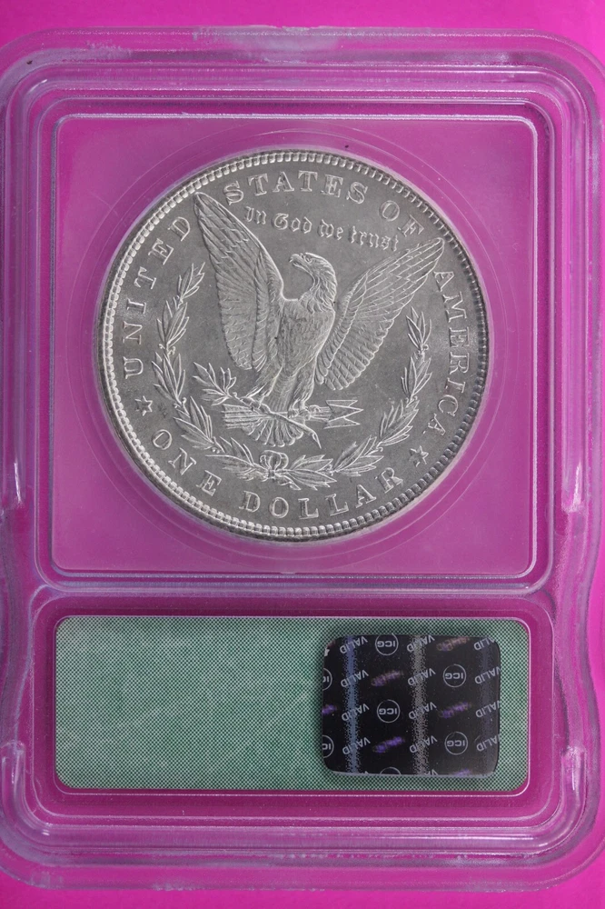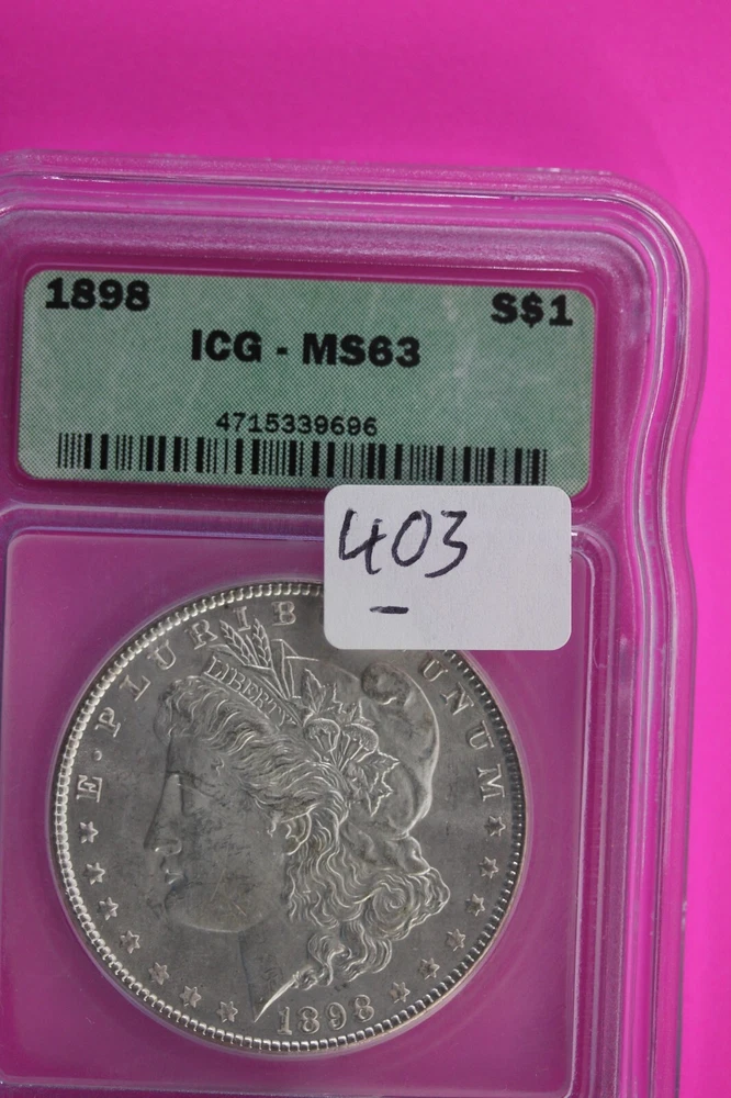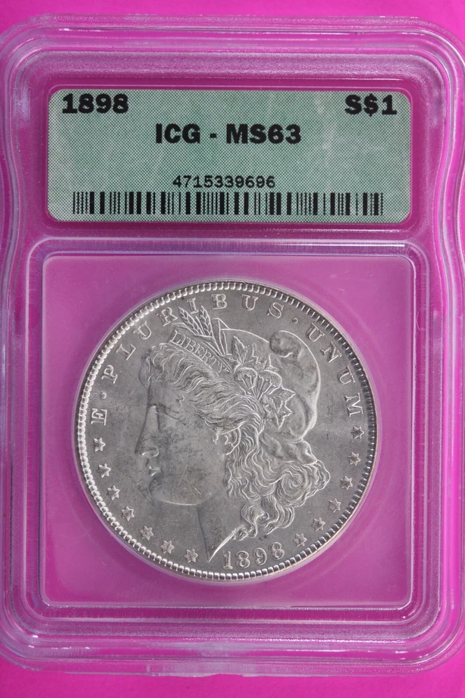 Coin: Morgan Silver Dollar Brand: US Mint Certification Number: na Country/Region of Manufacture: United States Seller Notes: “You will receive the exact same coin in the pictures. The background I use for pictures is colored.” Grade: MS 63 Total Precious Metal Content: .7734oz Brand/Mint: U.S. Mint Precious Metal Content per Unit: .7734oz Strike Type: Business Fineness: 0.900 Certification: ICG Composition: Silver Year: 1898