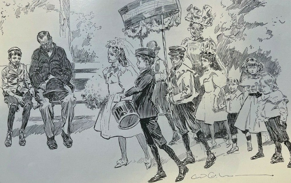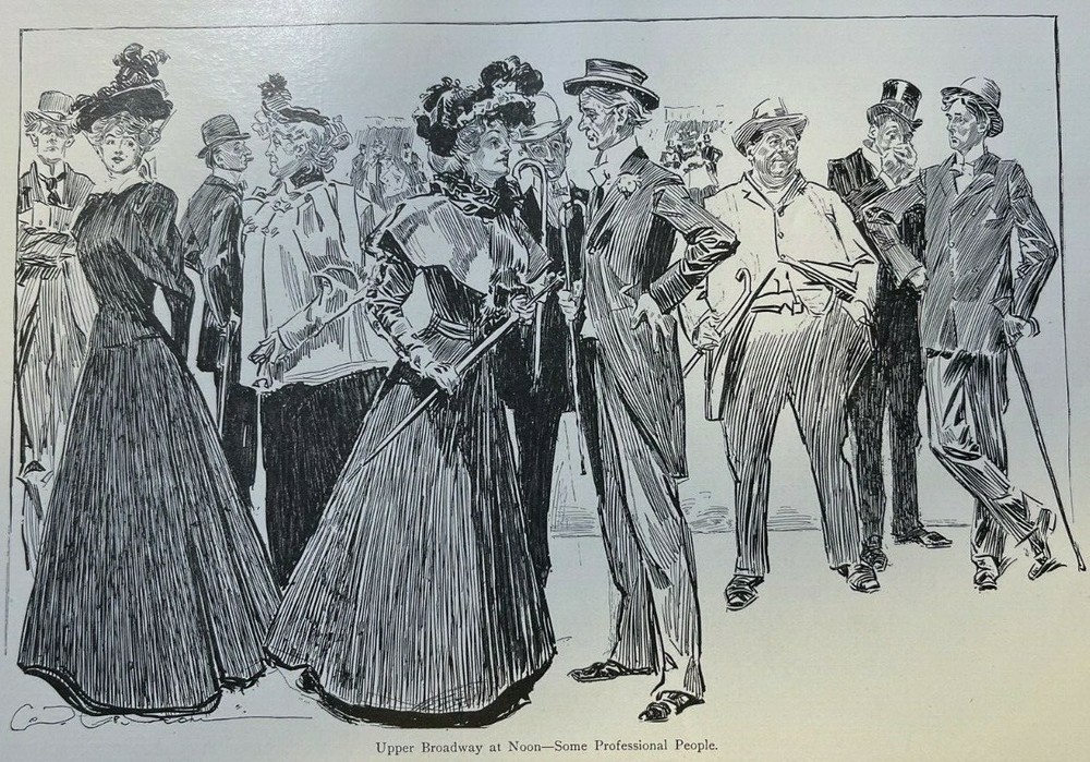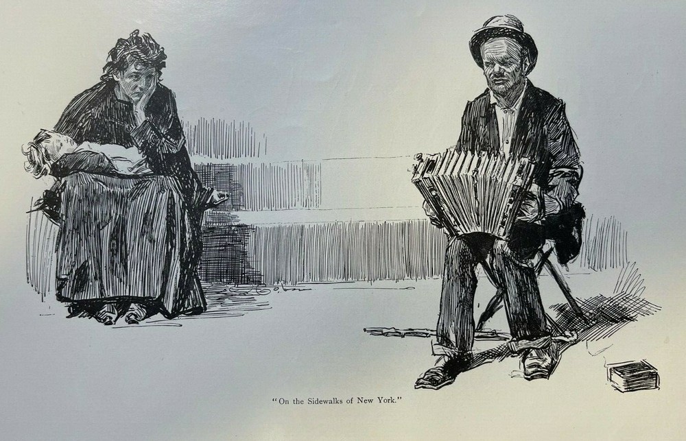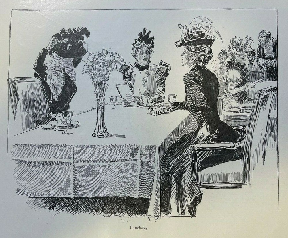 Vintage magazine illustrations removed from a vintage magazine . 1898. Contains 5 pages and 5 illustrations. Page size approximately 6 inches x 9 inches. Would make a great addition to any paper American collection. SKU # 40 Has some browning, age toning, and dinged corners, but overall very nice. Charles Dana Gibson studied at the Art Students’ League in New York in 1884 and 1885. The following year, Life Magazine published his first drawing. Between 1890 and 1920, his drawings appeared in Harper’s, Scribner’s, Century Magazine, Pall Mall, McClure’s, The Graphic, and more. Gibson visited London in 1895 and 1896, publishing articles and illustrations on his travels in Scribner’s Magazine. The Art Journal described those articles as a notable look at London that a historian of the nineteenth century would not want to overlook. Gibson “has gone into the fashionable thoroughfares and byways,” said the paper. “He visited the clubs and the theaters, the music halls and law courts, and described in vivid pictures and prose what he has seen there. He has walked the parks and given us types and scenes met with in London’s lungs.” Gibson followed that up with a series of articles in McClure’s Magazine in 1899 that detailed his travels in Egypt. He illustrated many articles, including Robert Grant’s The Art of Living and A. C. Goodloe’s Stories of College Life. He wrote and illustrated an article on Love and Life in 1897. Another series of illustrations for Scribner’s depicted a New York Day—Morning, Evening, and Night. In his day, art journals referred to Gibson as a society artist, covering the lives of upper-crust Americans and London’s city dwellers. Gibson’s Girls represented the new woman. They were independent, college educated, challenging the norms of Victorian society. His girls wore pants and took part in sports rather than sitting on the sideline watching. A Gibson Girl painted, played tennis, golfed, played the violin and piano, and yet, through it all, she was well-dressed and stylish. An illustration of a scrub woman gives one the impression she could drop the broom and transform into the belle of the ball. Society and women were changing, and Gibson documented those changes with pen and ink sketches. Women modeled themselves after his drawings. Men oohed and awed, learning the new rules of dating and society from how Gibson portrayed them. The only question was whether women were changing, or C. D. Gibson’s illustrations nudged them into making those changes.