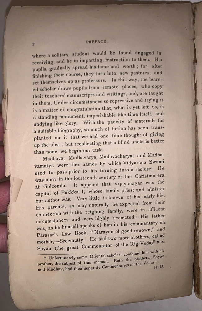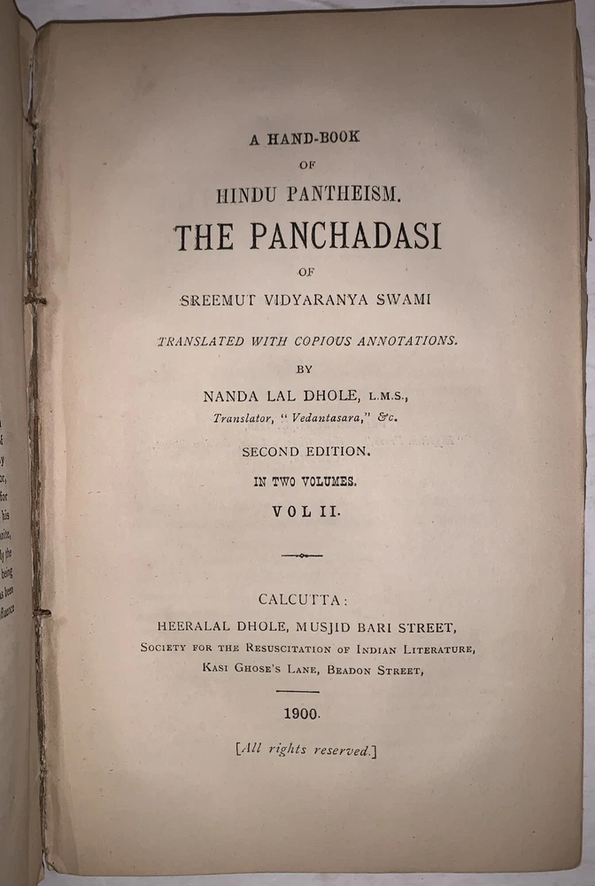 A Hand-Book Of Hindu Pantheism The Panchadasi Of Sreemut Vidyaranya Swami Translated with Copious Annotations by Nandalal Dhole, L.M.S. Second Edition Two Volumes in One Calcutta: Heeralal Dhole 1899-1900 Octavo, 333 pages, publisher's original brown wraps. Title in manuscript to top wrap. Top wrap and the first few pages are a little loose. Some tears to wraps and spine, rubbing and wear, some discoloration, previous owner's inscription, else in good + condition. A Handbook of Hindu Pantheism: The Panchadasi of Sreemut Vidyaranya Swami is a comprehensive English translation and commentary on the Panchadasi, a seminal text of Advaita Vedanta attributed to the 14th-century philosopher Vidyaranya Swami. The Panchadasi explores the nature of ultimate reality, the self, and liberation, emphasizing the non-dualistic philosophy of oneness between the individual soul (Atman) and the universal consciousness (Brahman). Divided into fifteen chapters, the text is grouped into three sections—Viveka (discrimination), Deepa (illumination), and Ananda (bliss)—each addressing a specific aspect of spiritual realization. This edition serves as an accessible guide to the profound teachings of Hindu pantheism, bridging ancient Sanskrit philosophy with modern readers through detailed explanations and insights. It remains a vital resource for those seeking to understand Hindu metaphysics and the principles of Advaita Vedanta. If you have any questions, feel free to ask, and don't forget to check out my other listings.