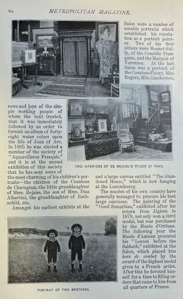 Vintage magazine illustrations removed from a vintage magazine published in 1899. Contains 4 pages and 10 illustrations. Page size approximately 6 inches x 9 inches. Would be great for addition to any vintage paper collection. SKU # 34363 Nice article overall. Has some browning, age toning, and dinged corners, but overall very nice.