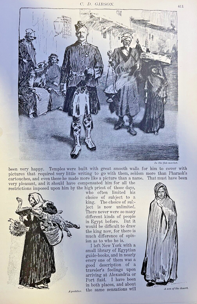 Vintage magazine article removed from a bound volume . 1899. Contains 8 pages and 14 illustrations. Page size approximately 6 inches x 9 inches. Would be great for addition to any vintage paper collection. SKU # 20379 Nice article overall. Has some browning, age-toning, and dinged corners, but overall very nice for a 100-year-old magazine article. Charles Dana Gibson studied at the Art Students’ League in New York in 1884 and 1885. The following year, Life Magazine published his first drawing. Between 1890 and 1920, his drawings appeared in Harper’s, Scribner’s, Century Magazine, Pall Mall, McClure’s, The Graphic, and more. Gibson visited London in 1895 and 1896, publishing articles and illustrations on his travels in Scribner’s Magazine. The Art Journal described those articles as a notable look at London that a historian of the nineteenth century would not want to overlook. Gibson “has gone into the fashionable thoroughfares and byways,” said the paper. “He visited the clubs and the theaters, the music halls and law courts, and described in vivid pictures and prose what he has seen there. He has walked the parks and given us types and scenes met with in London’s lungs.” Gibson followed that up with a series of articles in McClure’s Magazine in 1899 that detailed his travels in Egypt. He illustrated many articles, including Robert Grant’s The Art of Living and A. C. Goodloe’s Stories of College Life. He wrote and illustrated an article on Love and Life in 1897. Another series of illustrations for Scribner’s depicted a New York Day—Morning, Evening, and Night. In his day, art journals referred to Gibson as a society artist, covering the lives of upper-crust Americans and London’s city dwellers. Gibson’s Girls represented the new woman. They were independent, college educated, challenging the norms of Victorian society. His girls wore pants and took part in sports rather than sitting on the sideline watching. A Gibson Girl painted, played tennis, golfed, played the violin and piano, and yet, through it all, she was well-dressed and stylish. An illustration of a scrub woman gives one the impression she could drop the broom and transform into the belle of the ball. Society and women were changing, and Gibson documented those changes with pen and ink sketches. Women modeled themselves after his drawings. Men oohed and awed, learning the new rules of dating and society from how Gibson portrayed them. The only question was whether women were changing, or C. D. Gibson’s illustrations nudged them into making those changes.