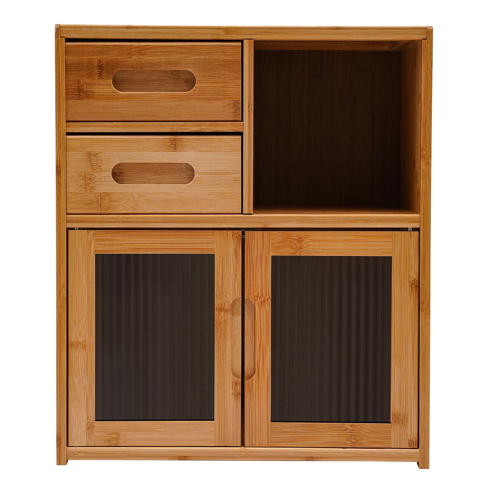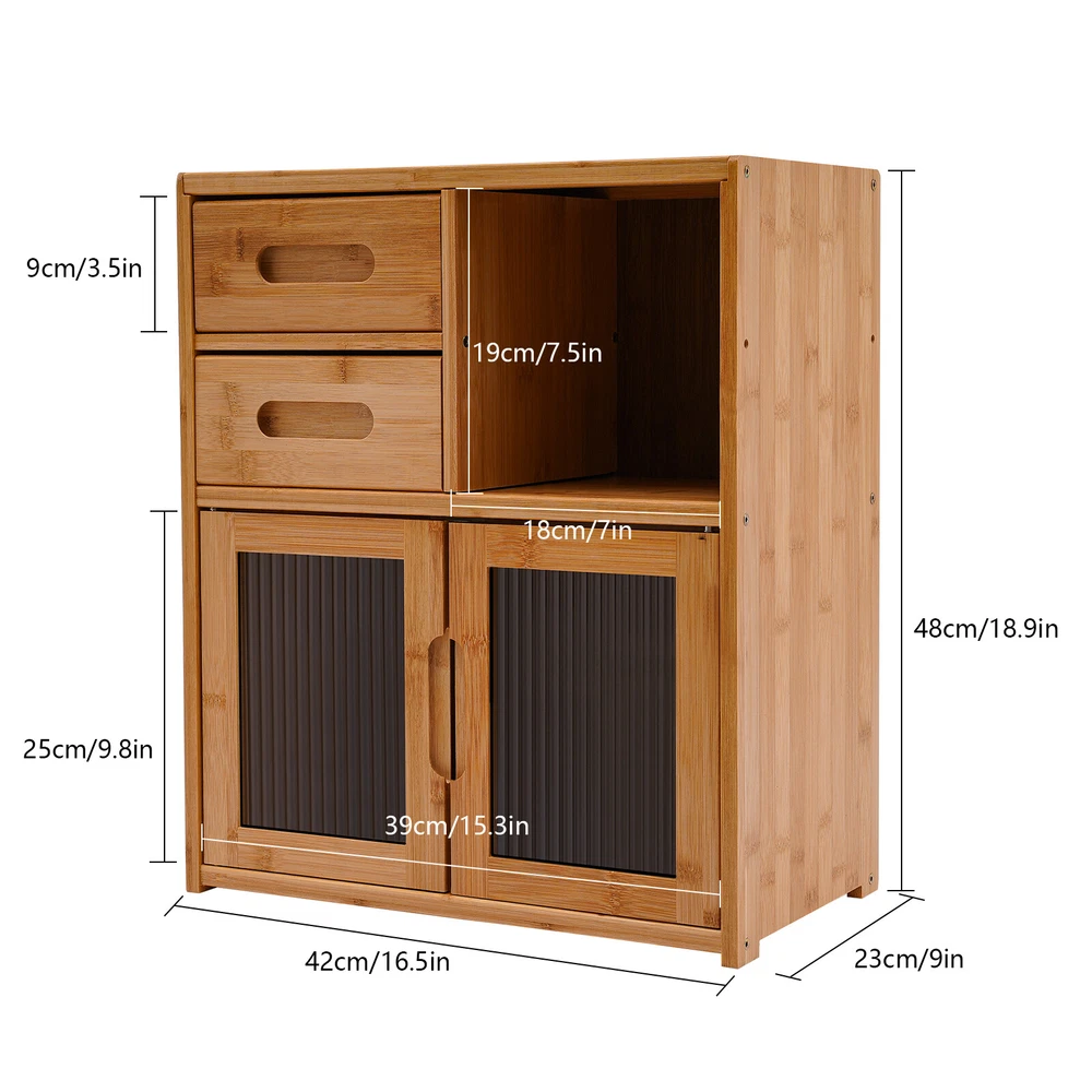 Specification Color: Wood Shape: Rectangular Mounting Type: Floor Mount Assembly Required: Yes Material: Bamboo, Composite Board, Acrylic Finish: Painting Each Tier Load-bearing Capacity: About 7.5-10kg/16.5-22 lbs Drawer Load-bearing Capacity: About 2.5kg/5.5 lbs Thickness: About 12mm/0.47in Product Size: 42*23*48cm/16.5*9*18.9in Drawer Height: 9cm/3.5in Open Tier Size(L*H): 18*19cm/7*7.5in Bottom Tier Size(L*H): 39*25cm/16.5*9.8in Package Included 1* Storage Cabinet 1* Glove All Accessories for Assembly 18.9in Tall Kitchen Pantry Sideboard Bamboo Kitchen Storage Cabinet with Drawer Description Description Looking to add some organizational magic to your space? Look no further than the sleek and versatile kitchen storage cabinet! Two drawers, an open space, and a large storage space at the bottom make full use of vertical space for you to place items in the limited space. This innovative piece of furniture is designed to give you the edge when it comes to storing and organizing your belongings in an organized, tidy, and efficient manner. Key Features High-end Materials : The premium bamboo with painting, composite backboard, and acrylic make this product sturdy, solid, and environmentally friendly, ensuring a long service life without being easily scratched or damaged. High Stability : The thickened board(12mm), screw-reinforced stabilized structure, stable feet, and reinforced composite backboard help it to support about 16.5-22lbs load-bearing capacity of each tier, keeping it in place and ensuring the safety of your items. Ample Storage Space : The two drawers, one open space, and a large bottom space with doors give you the freedom to arrange the cabinet's interior according to the size and type of items you want to store, thus organizing your belongings and making the most of the cabinet's space. The top platform can also be used to place some small potted plants or a microwave oven, making it a practical and stylish storage area. Considerate Design : The extended embedded handle makes it easy for you to open drawers and cabinet doors. Visual doors provide convenience for you to quickly find the items you need and protect your food from direct sunlight. The magnet can achieve a tight fit and prevent dust from entering to keep food or utensils clean. AttractiveAppearance: The wood color paired with clear doors makes it both beautiful and stylish, which well blends with your kitchen, living room, bedroom, etc. while adding texture and beauty to your room. Easy to Assemble : Simple construction, pre-drilled holes, a glove, and complete accessories help you achieve a quick installation, you just need to make sure all parts are properly nested. Effortless Clean-Up : The smooth surface and simple structure allow for easy access to all its components and you can wipe it with a clean towel. Protective Packaging : The strong box, sponge, and foam provide comprehensive protection for the product to ensure that it is fully delivered to you to the greatest extent possible. Customer Service : We are honored that you have chosen our product. We have sufficient confidence in the quality of the product so that you can buy it confidently. But if you have any questions, you can contact our customer service, he will patiently answer and solve your problems. Details Smooth Edges : The edges are finely treated to provide a comfortable and safer touch. Double Doors : They can provide enough door-opening space for you to place and take out items more conveniently. Rods : The inside of the drawer is supported by extra bamboo rods, which can effectively prevent the drawer from falling accidentally. Application It suits many occasions, like home kitchen, dining room, hallway, living room, office, break room, restaurant, and so on to place kitchen items such as tableware, glass jars, microwave donkeys, spices, seasonings, and daily necessities such as books, photo albums, pens, documents, etc. Specification Color: Wood Shape: Rectangular Mounting Type: Floor Mount Assembly Required: Yes Material: Bamboo, Composite Board, Acrylic Finish: Painting Each Tier Load-bearing Capacity: About 7.5-10kg/16.5-22 lbs Drawer Load-bearing Capacity: About 2.5kg/5.5 lbs Thickness: About 12mm/0.47in Product Size: 42*23*48cm/16.5*9*18.9in Drawer Height: 9cm/3.5in Open Tier Size(L*H): 18*19cm/7*7.5in Bottom Tier Size(L*H): 39*25cm/16.5*9.8in Package Included 1* Storage Cabinet 1* Glove All Accessories for Assembly Notes Please note that food, flower pots, and other items are not included. Please allow the slight color difference caused by the shooting light and 1-3cm error due to manual measurement and make sure you do not mind before ordering. Description Payment Delivery details Terms of sales About us Contact us Payment We accept ebay payment 。 Fees such as import duties, taxes are not included in the item price or shipping costs. These charges are the buyer's responsibility. Delivery details Shipping: 2-9 working days to: USA Terms of sales We maintain high standards of excellence and strive for hundred percent customer satisfaction. Feedback is very important to us. We hope that you contact us immediately before you give neutral or negative feedback, so that we can address your concerns. It is impossible to address issues if we do not know about them! About us Your satis faction is our ultimate goal. We work hard to earn your trust and future business. Our certified technicians have tested each item before shipping. The unit comes with 1 year limited warranty on all manufacturing defects. a) If you receive a defective item, you may return it or ask for a discount. Please contact us within 14 days after you receive the package. b) What you returned must be intact and in its original packaging as re? u. Customer is responsible for shipping costs of the returned item. c) We will cover the cost of shipping back t with the shipping rate indicated in the registration page. We will send you a new unit or refund the full payment