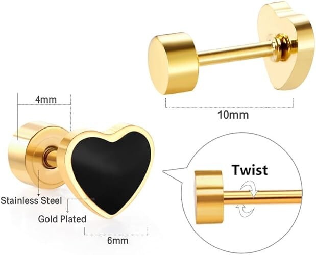 About this item Material: Dainty heart helix stud earrings for women and men are made of stainless steel, hypoallergenic, durable, great gold plating, long lasting color retention. Safe enough for sensitive skin. Stud Size: Heart: 5mm*6mm, studs length : 6mm, 18g (1mm gauge) These screw-on studs for women and men are perfectly match your various wearing style. Flat back heart love Stud Earrings: For regular wear and as multiple piercing jewelry. Use flat screw back don't worry about falling off when exercising and sleeping. Easier to wear and take off. Occasion: Cute hypoallergenic mini stud earrings is suitable for both everyday use and special occasions like parties, clubbing, weddings, and more. Cute Pierced Stud Earrings Come in an velet pouch. Great gifts for women, mom,mother in law, wife, daughter,aunt, best friend, etc. Ideal Birthday Gifts, Anniversary Gifts, Christmas Gifts, Graduation Gifts, Mother's Day Gifts, Valentine's Day Gifts, etc. Service and Returns: If you need help, just contact with us via , we will solve your problem in 24 hours.Your satisfaction is our greatest motivation.
