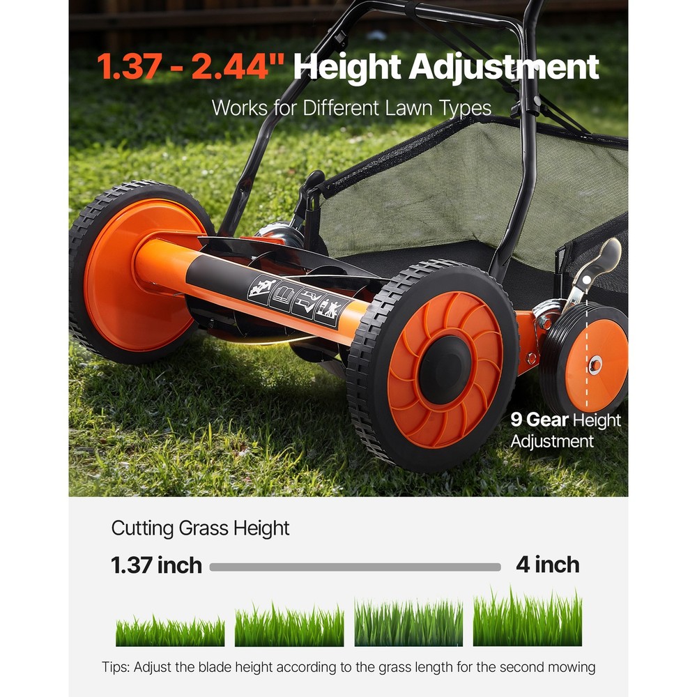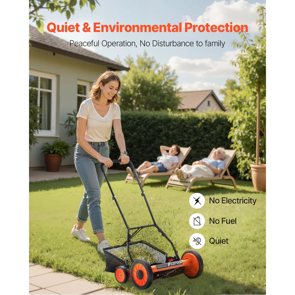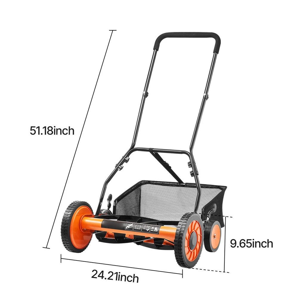 18-Inch Manual Push Reel Mower This 18in push reel mower with five 65Mn steel blades delivers precise, even cuts, for small to medium lawns. The adjustable height design accommodates different grass types, and the 4 large wheels and sponge handle reduce mowing effort. The included grass catcher bag makes clean-up easy. Cutting Height 5 Blades Mowing Effects Large Wheels Easy Assembly Wide Application Easy Storage No Pollution & Quiet What is the suitable grass height for cutting? If the grass is 4 inches or taller, be sure to overlap your mowing passes. For optimal results, trim no more than one-third of the grass height at a time to promote deeper root growth. What should I do if it gets stuck during use? If the blades get stuck, simply pull it back to clear out any branches or clippings. What kind of maintenance is needed? For maintenance, apply oil or lubricant to the blades to prevent rust. If cutting performance drops, tighten the blades using the adjustment screw. Features & Details Accurate and Even Cutting: The push lawn mower features 18-inch width and 5-blade design ensure precise and uniform trimming. Adjustable cutting height (1.37 to 2.44 in) to suit different seasons and grass types. For the optimal results, trim grass less than 4 in tall, and lower the blade for the second mowing to suit the grass height. Durable Construction: Our manual push mower features five high-quality UNS1566 steel blades for lasting performance and sharpness. Shock-resistant design ensures reliable results for multiple trims. If it gets stuck during use, you can simply pull back to clear branches or leaves. Portable & Easy Assembly: Simply attach the handle to the hand push reel mower main unit, and you're ready to go. Quick, tool-free assembly takes about 10 minutes. Get started quickly and save valuable time, so you can enjoy mowing your lawn immediately. Reduced Physical Strain: With 4 large wheels and cushioned, ergonomic U-shaped handle, the walk behind mower make mowing easier, reducing strain, especially for seniors. The included grass catcher bag for easy debris collection. Each mowing is no longer a burden but an enjoyable activity. Environment-Protection & Quiet: No batteries, electricity, or fuel needed. this reel grass mower is emission-free, and quiet. It's ideal for families with children or pets, while being considerate to neighbors. Enjoy a peaceful and green gardening. SHIPPING ABOUT US PAYMENT RETURNS CONTACT WARRANTY Welcome to our eBay store. As a leading and emerging company in manufacturer and exporting business, we are specialized in Business and Industrial Products, Sporting Goods, Pet Products, Home and Garden products for more than 10 years. We believe that it is our vision and mission to provide innovative products with best service and competitive price to satisfy you. Our goal is to make sure that you can find exactly what you are looking for and make it easy for you to place your orders. We accept PayPal payment,PayPal Credit,Credit card or debit card and so on. Payment should be completed within 4 (Four) days of auction closing. Or unpaid dispute will be filed for closing auction. We will leave a positive feedback immediately after payment is received. We appreciate a positive feedback as much as you do. If for some reason there is any issue with the purchase, please contact us prior to leaving feedback, we will be glad to work together and provide a satisfying solution. Please be aware that PO Box cannot receive items, please DO NOT fill in the PO Box address. DELIVERY DAYS: 3-7 BUSINESS DAYS 3 BUSINESS DAYS SHIPPING OUT SHIP FROM CA & TX & NJ & GA & NC &OR WAREHOUSE California Warehouse: City of Industry, CA Texas Warehouse : Houston, TX New Jersey Warehouse : Perth Amboy, NJ New York State Warehouse: Perth Amboy, NJ Georgia Warehouse: Austell,GA North Carolina Warehouse: Grove NC Oregon Warehouse: AIRPORT WAY Portland,OR All of our items are backed with a 30-day return policy. We ensure all our items are new and in excellent condition prior to shipping. In case you receive the item that is not to the standards above, please contact us via e-Bay messages. All returns must be in new original condition as received and should be shipped with delivery confirmation Please note that all returns must be pre-approved by us. Unauthorized returns will not be accepted. If you need to return, please check twice to confirm the item not work and contact our customer service representative, let us know the detailed problem and send us some pictures for confirmation. We ONLY accept returns with original package. Please make sure that item has NO man-made sabotage. Used items will not be accepted for return. Email Customer Support: 9:00am-2:00am PST Sunday-Friday All emails will be responded to within 12-24 hours This item comes with 12 months Warranty from the date of customers purchased it. Special circumstances will be listed clearly in the listing. If your item has been damaged in transit or become faulty in warranty period, please email us with pictures or video to show the problem. Please do check everything carefully after you received the parcel, any the damage except DOA (Dead-On-Arrival) would not be covered if it's your fault. Replacement products are provided with the same warranty as the returned products. 18-Inch Manual Push Reel Mower This 18in push reel mower with five 65Mn steel blades delivers precise, even cuts, for small to medium lawns. The adjustable height design accommodates different grass types, and the 4 large wheels and sponge handle reduce mowing effort. The included grass catcher bag makes clean-up easy. Cutting Height 5 Blades Mowing Effects Large Wheels Easy Assembly Wide Application Easy Storage No Pollution & Quiet What is the suitable grass height for cutting? If the grass is 4 inches or taller, be sure to overlap your mowing passes. For optimal results, trim no more than one-third of the grass height at a time to promote deeper root growth. What s