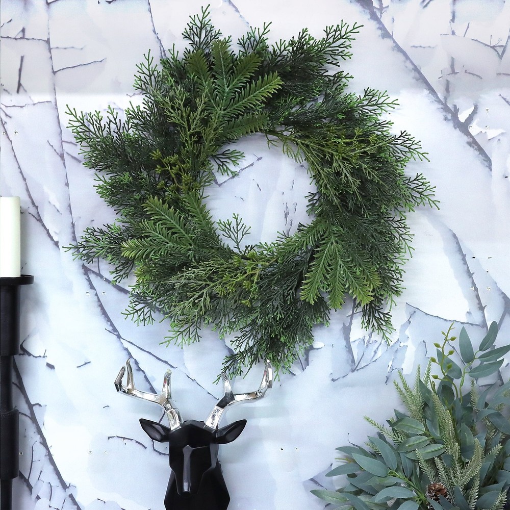 This wreath is absolutely stunning—perfect for adding a touch of nature to any space! The lush green pine and mixed foliage look so realistic, and the sturdy metal base makes it easy to hang. Love that it comes ready to use, and the size is just right for doors or walls. It’s a gorgeous, year-round decor piece that instantly elevates my home’s vibe. Highly recommend!