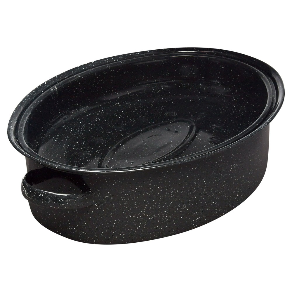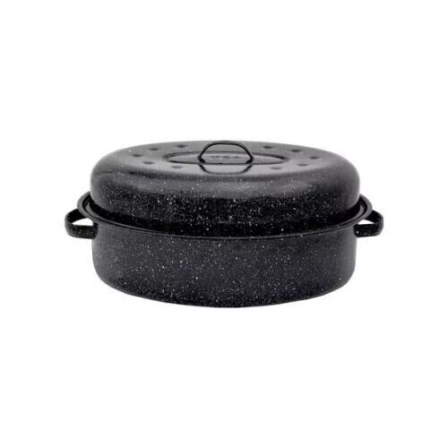 18" Roasting Pan With Lid Ceramic Non-Stick Black Oval Roaster Cookware This Granite Ware 18 in. covered oval roaster browns better and cooks more evenly than any other roaster. The dark interior absorbs all the oven's energy, the steel core evenly distributes the heat and the glass interior doesn't alter the taste. Ideally suited for a 15-pound roast, this oval roaster boasts even heating and faster cooking times because of its unique construction. Porcelain is fused to the steel at 2,000 degrees Fahrenheit producing a non-porous, inert glass surface that is naturally non-stick. Porcelain can chip if dropped, however this does not reduce the effectiveness of the cookware. They are safe for metal utensils, easy to clean, and dishwasher safe! Granite Ware 18" Black Covered Oval Roaster: Product features: Sized for a 15 lb. roast Porcelain finish is naturally non-stick Dark color absorbs heat quickly for faster cooking times Non-reactive finish won’t absorb food flavors, or change the color or taste of your food Dimpled lid bastes food for moist meals Durable finish is tough enough for metal utensils Side handles for easy lifting and moving Dishwasher safe for easy clean up On Jul 4, 2025 at 19:56:20 PDT, seller added the following information: