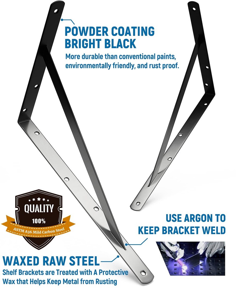 PERFECT FIT: This L shelf brackets fit the nominal 18” - 22” deep lumber board, measure 18” x 11-3/4” x 1” HIGH QUALITY: Unlike the normal painting material, power frosted black coating ensure its rust-resistance and anti-coating off HEAVY DUTY: Each heavy duty steel shelf bracket with upgrade quality screws carry up to 130lb, enough for daily use (260lb per pair) ALL-MATCH STYLE: Maximize space with with style. Fit for the kitchen, bathroom, bedroom, office & more. MAKE IT EASY: We provide installation manual and offer 90 days no reason or offer new free guaranteed