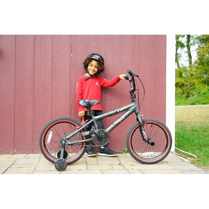 Product details Children will enjoy the wind in their face and speeding down the sidewalk with the 18" Kent Abyss FS18 Boys' BMX Bike. It has a sleek style and is a nice in-between model for the budding freestyler. This silver bike has all the same features of the grown-up version yet is suited for a little guy that's not quite ready for full-size. It's built with a steel frame for sturdiness and comes with removable training wheels for a smooth transition. This kids' BMX bike has a saddle seat with a nice pad and hand brakes to ensure safe stops. The kickstand keeps it upright when left alone. Brand: Kent Bicycle Bicycle Type: Freestyle BMX Wheel Diameter: 18" wheels, removable training wheels Age Group: Child Single Speed Front pegs Frame: steel frame Stem: 4-bolt stem Brakes: rear foot brake and dual alloy hand brakes Rims: steel rims Handlebars: steel handlebars Seat: padded saddle with quick-release seat post clamp Pedals: plastic pedals Weight limit: 70 lbs Assembly required Dimensions: 50"L x 23"W x 35"H Ideal in-between bike for the budding freestyler
