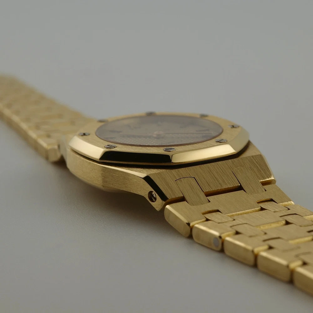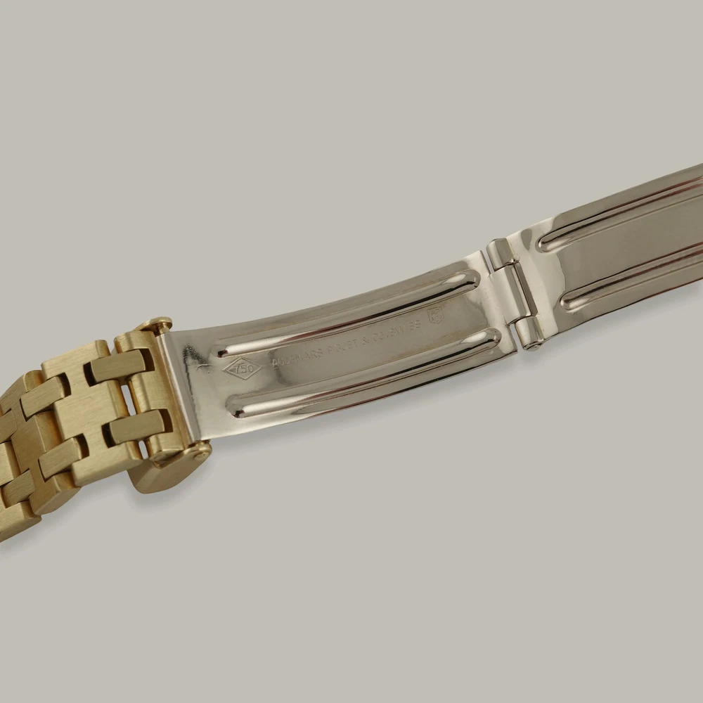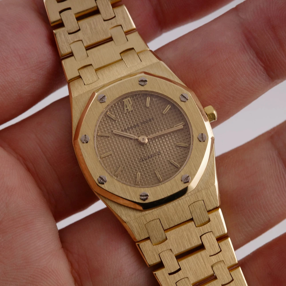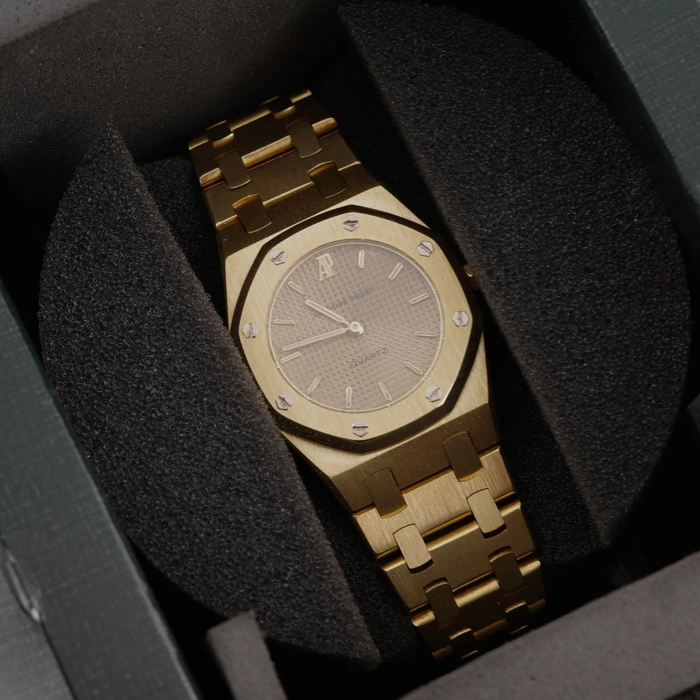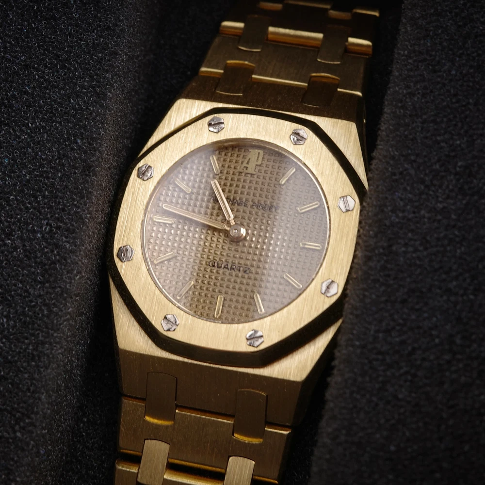 Our Perspective: Maybe it was Hailey and Justin Bieber matching mini Royal Oaks on social media or the new frosted 23mm Royal Oaks having the entire ladies’ watch world in a chokehold, but finding a Royal Oak at 26mm or smaller has quietly become both harder and more expensive. Small Royal Oaks are having an it-girl moment and the best ones are no longer flying under the radar. What makes this 1970s Royal Oak ref. 6007BA so compelling is how effortlessly chic it feels. In 18k yellow gold and just 26mm, it wears more like a piece of jewelry than a “downsized” watch. The proportions are spot-on, the design feels intentional, and on the wrist it delivers that unmistakable Genta-designed Royal Oak presence with a softer, more stylish edge. This is the kind of watch that looks just as right with denim and a tee as it does dressed up. The irony? The modern frosted gold 23mm Royal Oak quartz trades around $90,000. Meanwhile, this early Royal Oak, with true rarity and far more character, sits at under $30,000. Once you see them side by side, it becomes clear: this isn’t about size or gold weight- it’s about taste. Call it a mini, baby, or ladies’ Royal Oak if you want, but pieces like this are the original blueprint for the trend we’re seeing everywhere today. It’s chic, it’s rare, and it’s exactly the kind of Royal Oak the style-forward collectors are quietly chasing. Condition Report: Very Good overall condition. Watch recently received a full case and bracelet refinish/polish and is in beautiful condition with sharp edges and brushing. Screw heads on bezel, caseback and links show signs of removal. Caseback and crown have medium signs of wear. Medium scratches throughout crystal. Dial and hands are in very good condition with only minimal signs of age. Light stretch on bracelet. Bracelet has 20 links and fits a max wrist size of 6.5". One link (second link @ 6 o'clock) appears to have been repaired previously with a silver pin. Watch sets, runs and keeps accurate time without issue. Watch does not have original box or papers, but comes with a serialized AP service box. Condition Grade: 8.5 /10