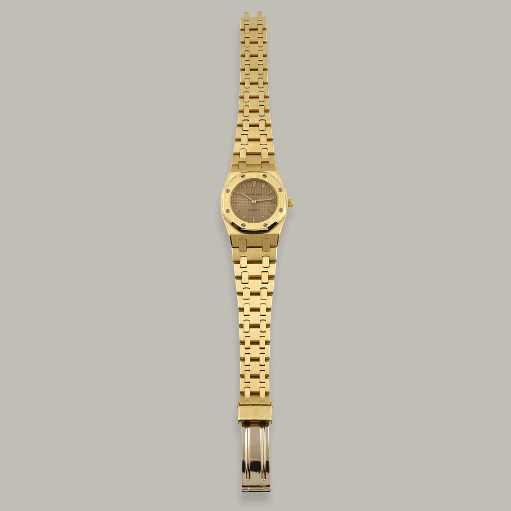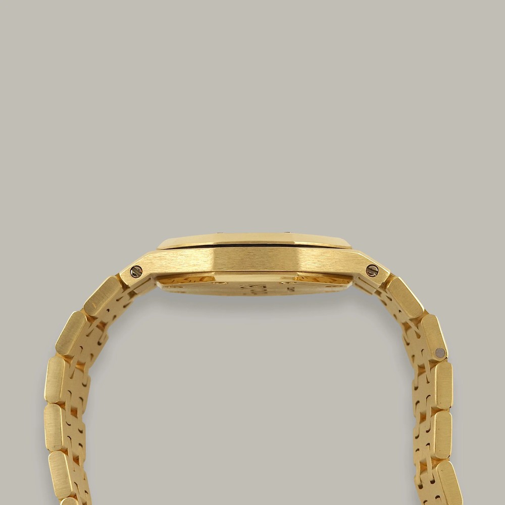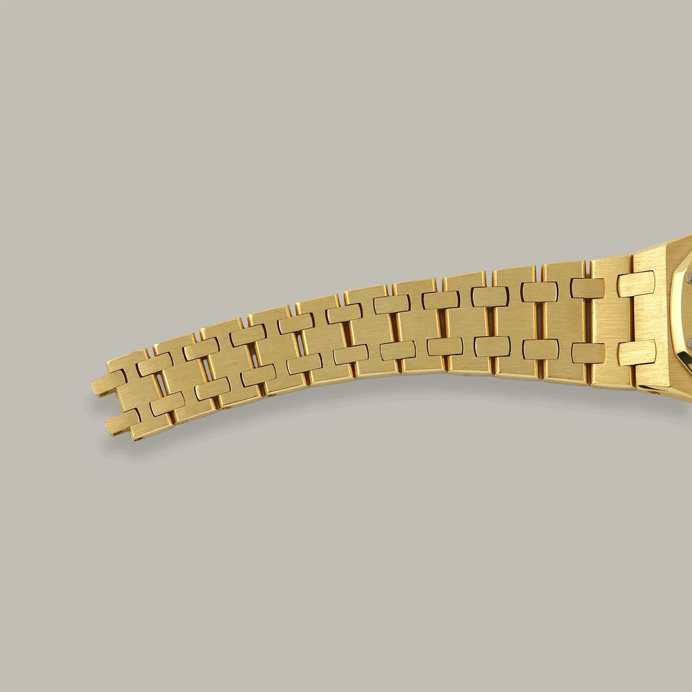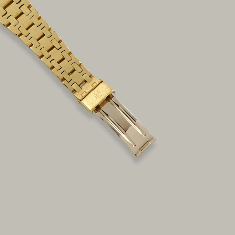 Our Perspective: Maybe it was Hailey and Justin Bieber matching mini Royal Oaks on social media or the new frosted 23mm Royal Oaks having the entire ladies’ watch world in a chokehold, but finding a Royal Oak at 26mm or smaller has quietly become both harder and more expensive. Small Royal Oaks are having an it-girl moment and the best ones are no longer flying under the radar. What makes this 1970s Royal Oak ref. 6007BA so compelling is how effortlessly chic it feels. In 18k yellow gold and just 26mm, it wears more like a piece of jewelry than a “downsized” watch. The proportions are spot-on, the design feels intentional, and on the wrist it delivers that unmistakable Genta-designed Royal Oak presence with a softer, more stylish edge. This is the kind of watch that looks just as right with denim and a tee as it does dressed up. The irony? The modern frosted gold 23mm Royal Oak quartz trades around $90,000. Meanwhile, this early Royal Oak, with true rarity and far more character, sits at under $30,000. Once you see them side by side, it becomes clear: this isn’t about size or gold weight- it’s about taste. Call it a mini, baby, or ladies’ Royal Oak if you want, but pieces like this are the original blueprint for the trend we’re seeing everywhere today. It’s chic, it’s rare, and it’s exactly the kind of Royal Oak the style-forward collectors are quietly chasing. Condition Report: Very Good overall condition. Watch recently received a full case and bracelet refinish/polish and is in beautiful condition with sharp edges and brushing. Screw heads on bezel, caseback and links show signs of removal. Caseback and crown have medium signs of wear. Medium scratches throughout crystal. Dial and hands are in very good condition with only minimal signs of age. Light stretch on bracelet. Bracelet has 20 links and fits a max wrist size of 6.5". One link (second link @ 6 o'clock) appears to have been repaired previously with a silver pin. Watch sets, runs and keeps accurate time without issue. Watch does not have original box or papers, but comes with a serialized AP service box. Condition Grade: 8.5 /10