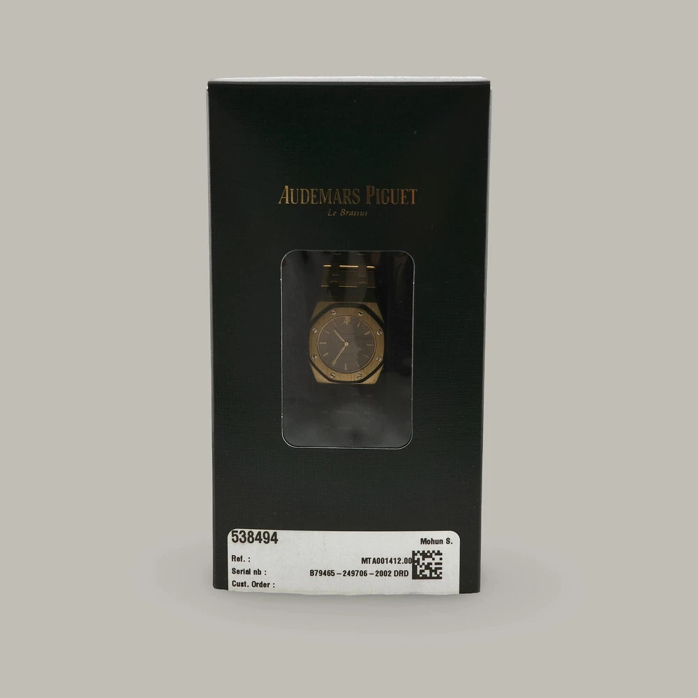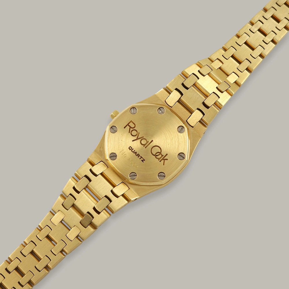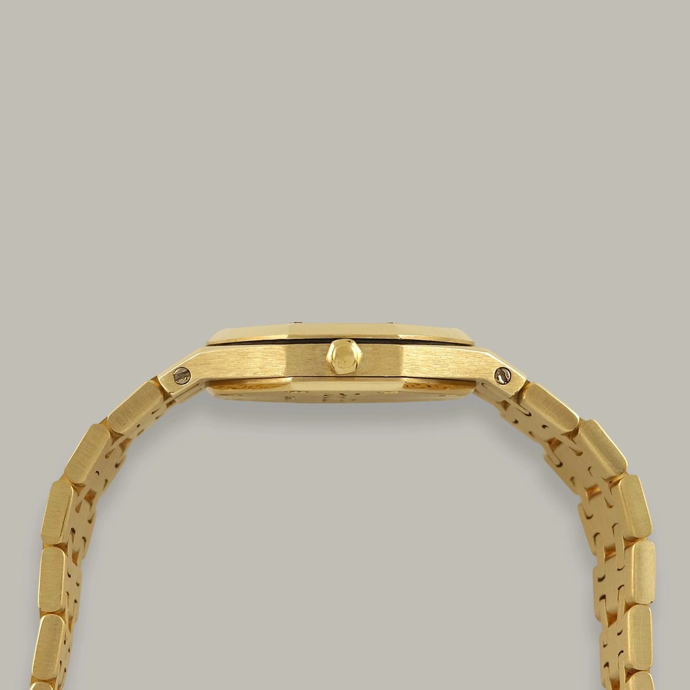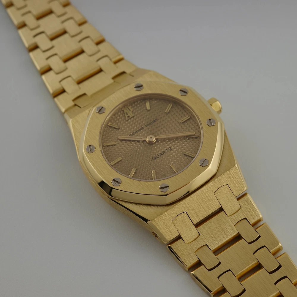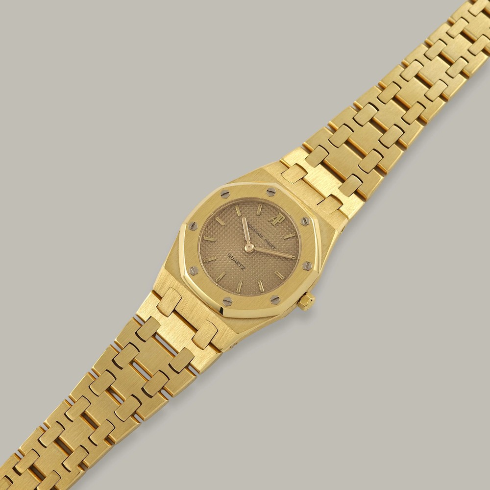 Our Perspective: Maybe it was Hailey and Justin Bieber matching mini Royal Oaks on social media or the new frosted 23mm Royal Oaks having the entire ladies’ watch world in a chokehold, but finding a Royal Oak at 26mm or smaller has quietly become both harder and more expensive. Small Royal Oaks are having an it-girl moment and the best ones are no longer flying under the radar. What makes this 1970s Royal Oak ref. 6007BA so compelling is how effortlessly chic it feels. In 18k yellow gold and just 26mm, it wears more like a piece of jewelry than a “downsized” watch. The proportions are spot-on, the design feels intentional, and on the wrist it delivers that unmistakable Genta-designed Royal Oak presence with a softer, more stylish edge. This is the kind of watch that looks just as right with denim and a tee as it does dressed up. The irony? The modern frosted gold 23mm Royal Oak quartz trades around $90,000. Meanwhile, this early Royal Oak, with true rarity and far more character, sits at under $30,000. Once you see them side by side, it becomes clear: this isn’t about size or gold weight- it’s about taste. Call it a mini, baby, or ladies’ Royal Oak if you want, but pieces like this are the original blueprint for the trend we’re seeing everywhere today. It’s chic, it’s rare, and it’s exactly the kind of Royal Oak the style-forward collectors are quietly chasing. Condition Report: Very Good overall condition. Watch recently received a full case and bracelet refinish/polish and is in beautiful condition with sharp edges and brushing. Screw heads on bezel, caseback and links show signs of removal. Caseback and crown have medium signs of wear. Medium scratches throughout crystal. Dial and hands are in very good condition with only minimal signs of age. Light stretch on bracelet. Bracelet has 20 links and fits a max wrist size of 6.5". One link (second link @ 6 o'clock) appears to have been repaired previously with a silver pin. Watch sets, runs and keeps accurate time without issue. Watch does not have original box or papers, but comes with a serialized AP service box. Condition Grade: 8.5 /10