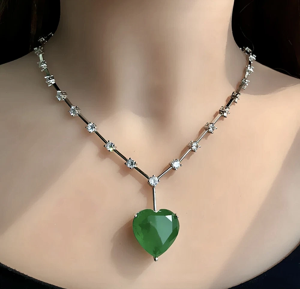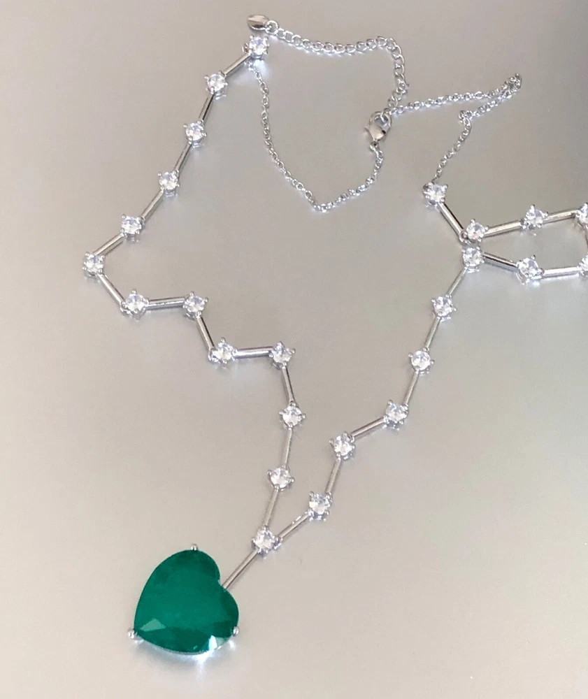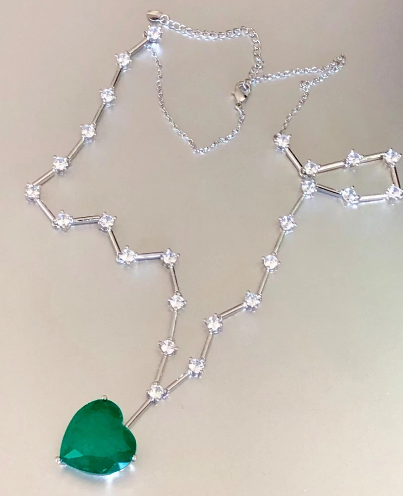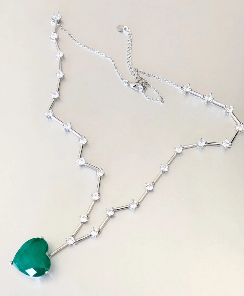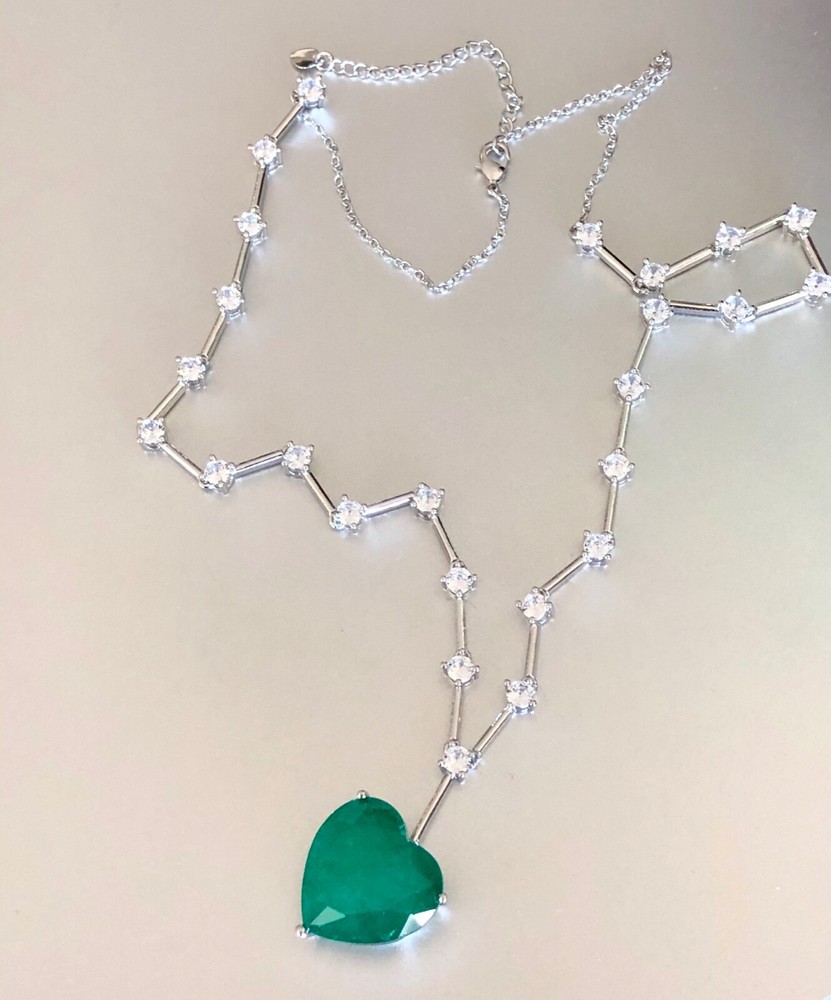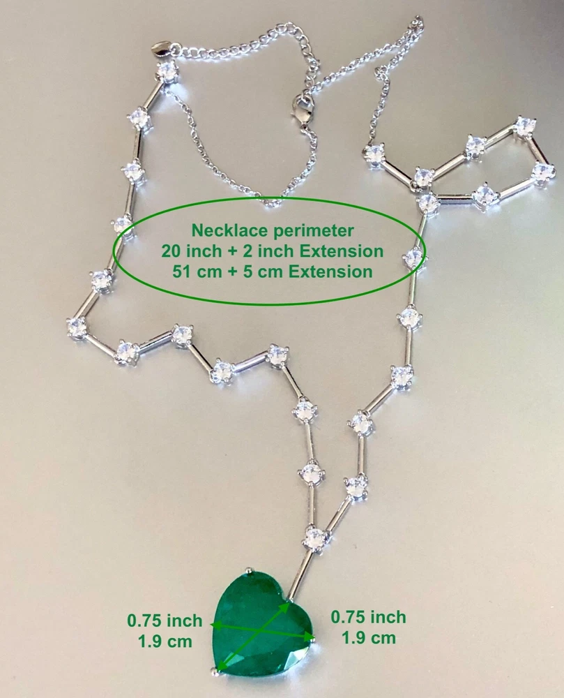 Exquisite Celebrity Inspired Jewelry Created Green Emerald Heart Pendant Necklace 18k White Gold Plated Finish We carry the Matching Earrings at Our eBay Store • Metal Setting: 18k White gold plated copper • Necklace Length: Approx. 20.0 inch + 2.0 inch extension chain. Pendant measures 0.75 inch x 0.75 inch. Dimensions at image # 6 • Stones: Gorgeous big lab green emerald heart adorned with simulated diamond round stones all around with beautiful brilliance and glamour • Stone Setting: Stone are prong-set • Closure: Necklace closes with lobster claw clasp • Note: Please refer to pendant/ necklace dimensions for its actual measurements and size Thank for Shopping with us! Feel Beautiful Every Day!