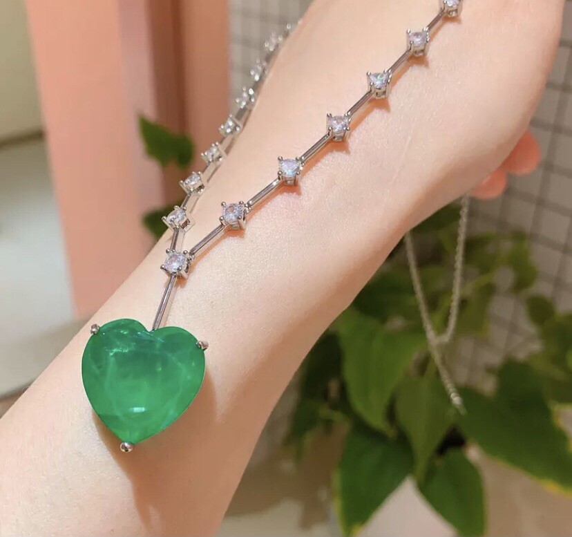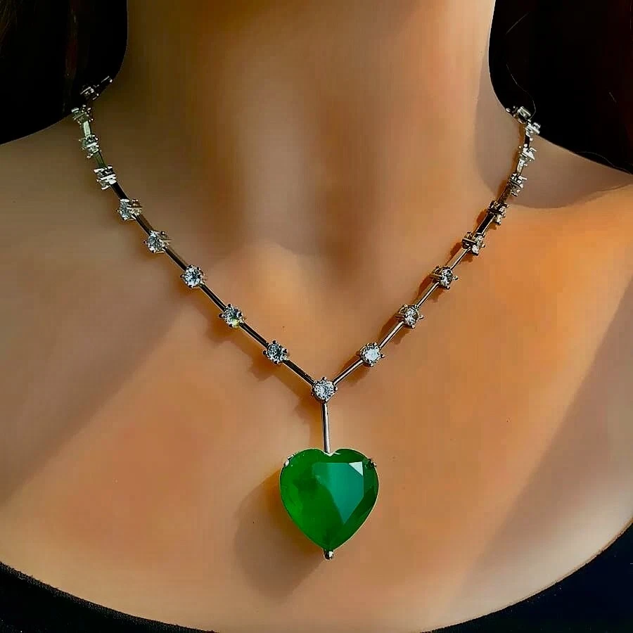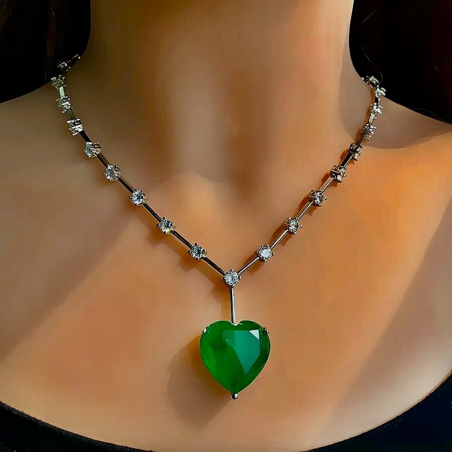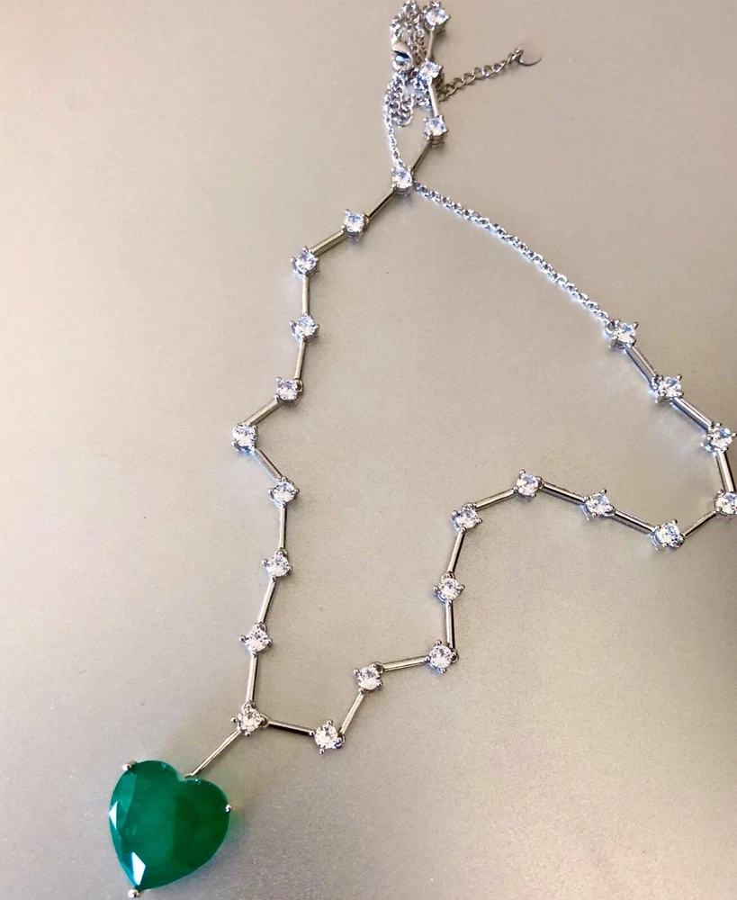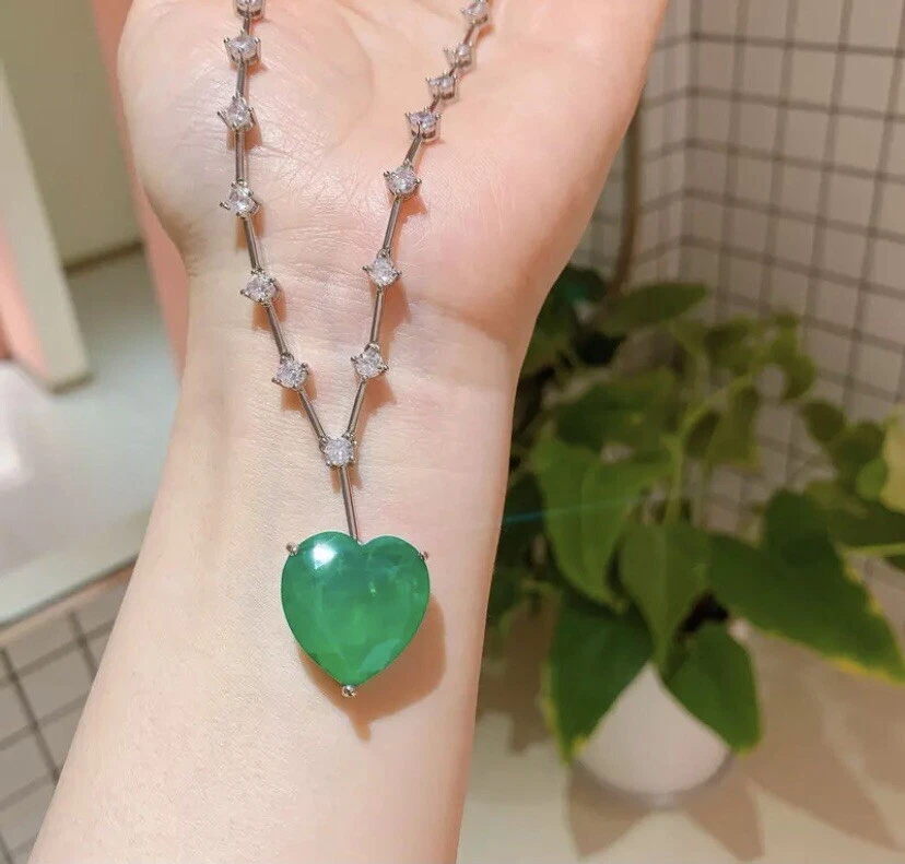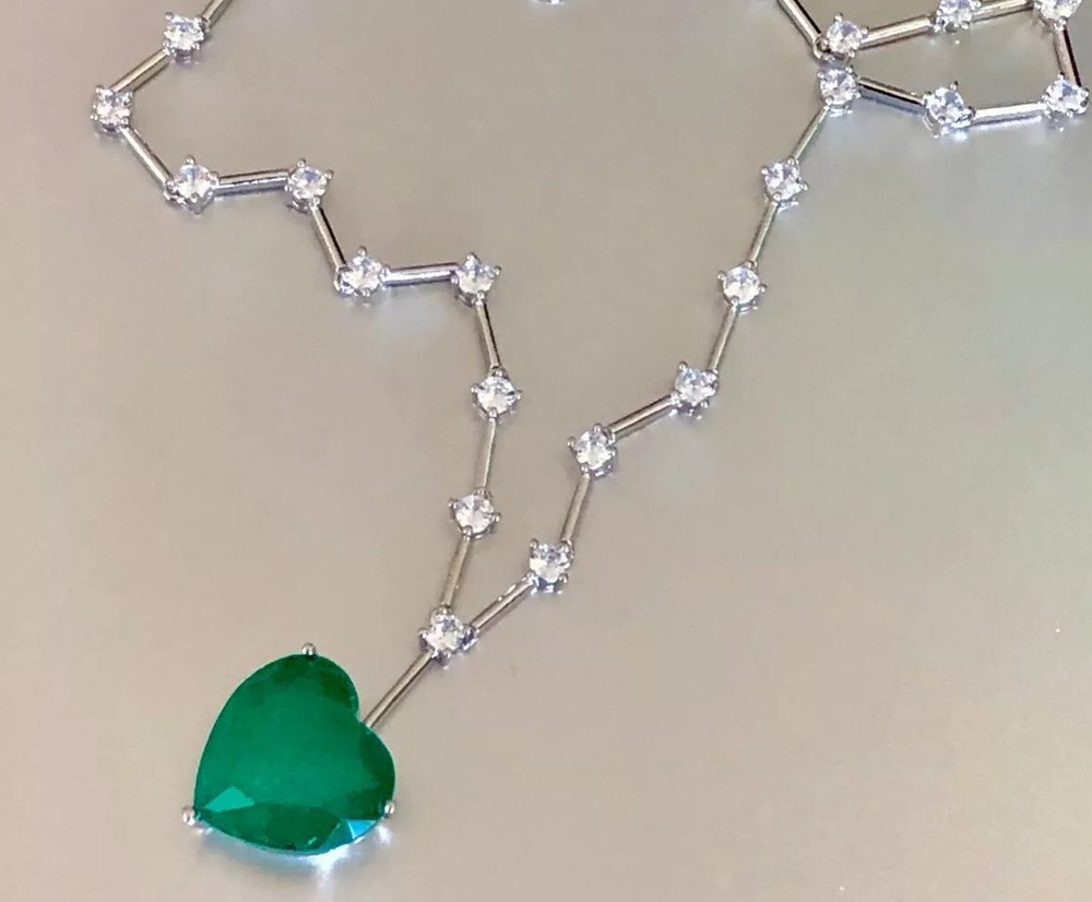 Exquisite Celebrity Inspired Jewelry Created Green Emerald Heart Pendant Necklace 18k White Gold Plated Finish We carry the Matching Earrings at Our eBay Store • Metal Setting: 18k White gold plated copper • Necklace Length: Approx. 20.0 inch + 2.0 inch extension chain. Pendant measures 0.75 inch x 0.75 inch. Dimensions at image # 6 • Stones: Gorgeous big lab green emerald heart adorned with simulated diamond round stones all around with beautiful brilliance and glamour • Stone Setting: Stone are prong-set • Closure: Necklace closes with lobster claw clasp • Note: Please refer to pendant/ necklace dimensions for its actual measurements and size Thank for Shopping with us! Feel Beautiful Every Day!