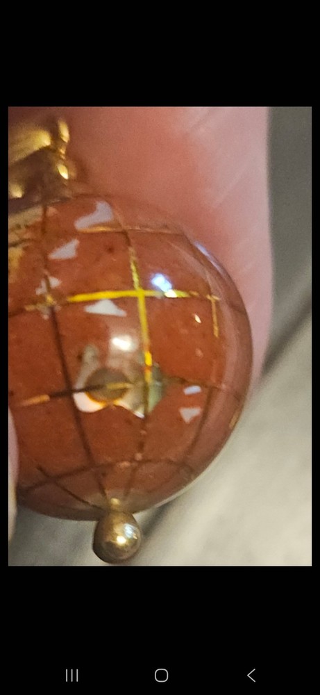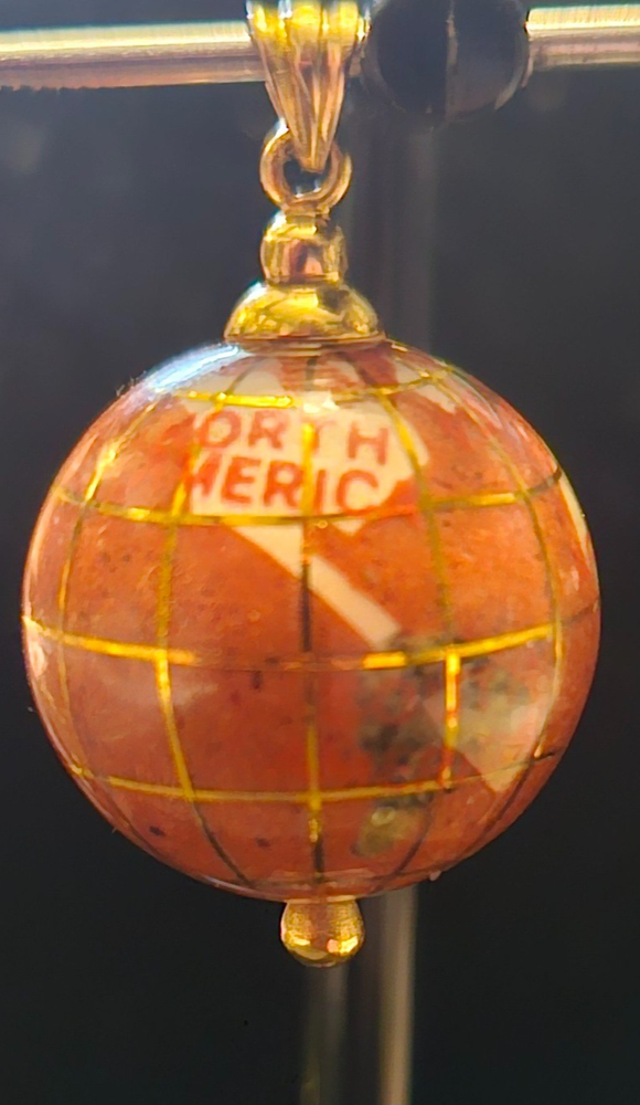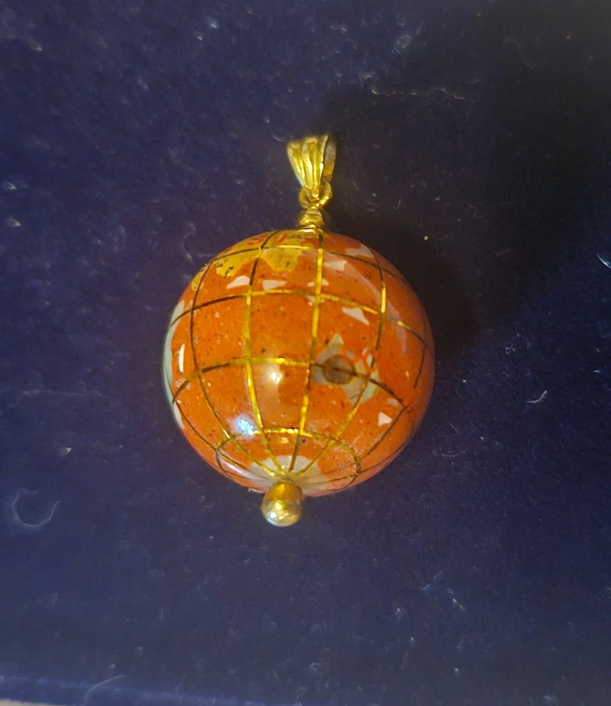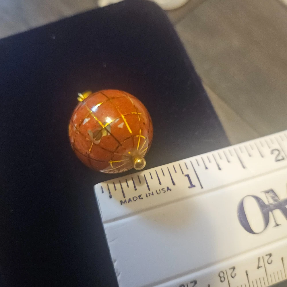 PRICE REDUCED AGAIN! Lowest Price of globes of this type. The Semi-Precious Stone is a stunning pendant featuring a beautiful abalone, mother of pearl, and jasper globe set in 18K solid gold with 18K inlay, bail and all trim.The globe is an intricate combination of natural shells,natural stone and an inlay of gold....a unique piece. It is approximately 11/4 inch tall and 3/4 inch wide.Weighs 6.6 grams. NOTE: The speckles throughout the globe are the different components of the stone. NOT DEFECTS For instance the round mark on Australia is a bluish green irredesent like abalone. The globe was created first, gold inlays added and then coated resulting in a shiny and smooth surface. The globe is still in its original state as it was created. There are no scratches or damage to the surface. Condition is Pre-owned great condition, no damage...smooth and shiny. 18K gold test- see Photo. Other measurements and coin comparisons in Photo. Free Shipping, usually mailed within 24 hours. Velvet Gift Box