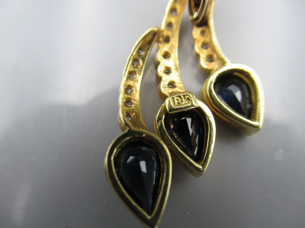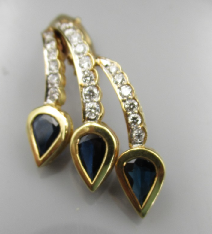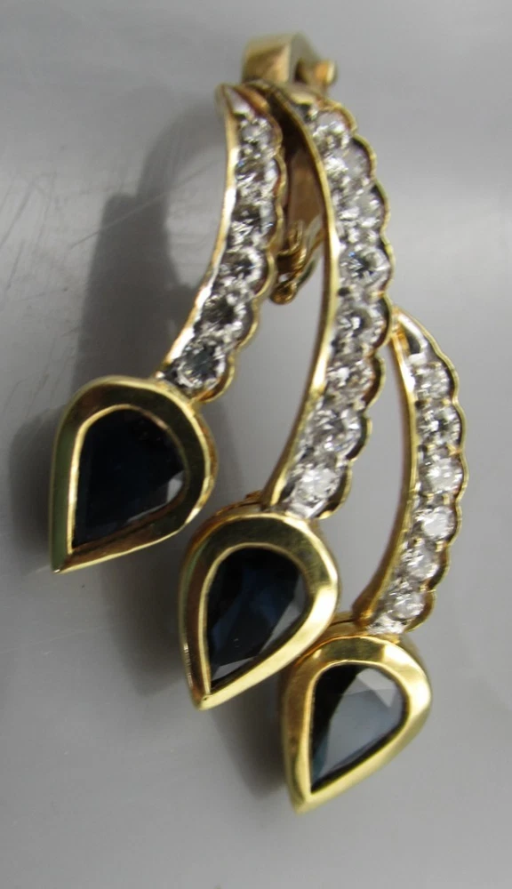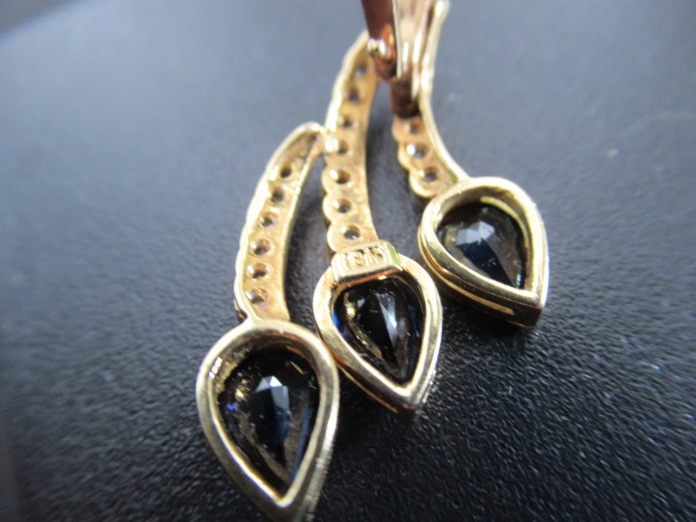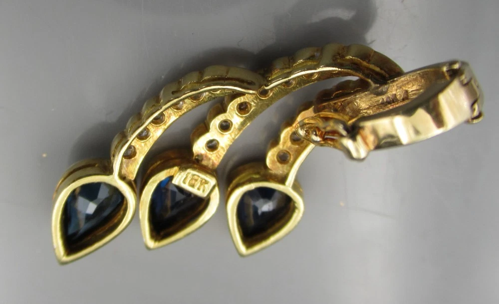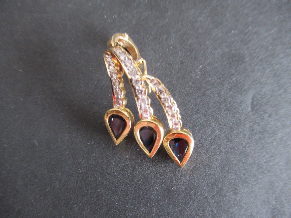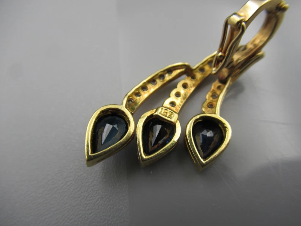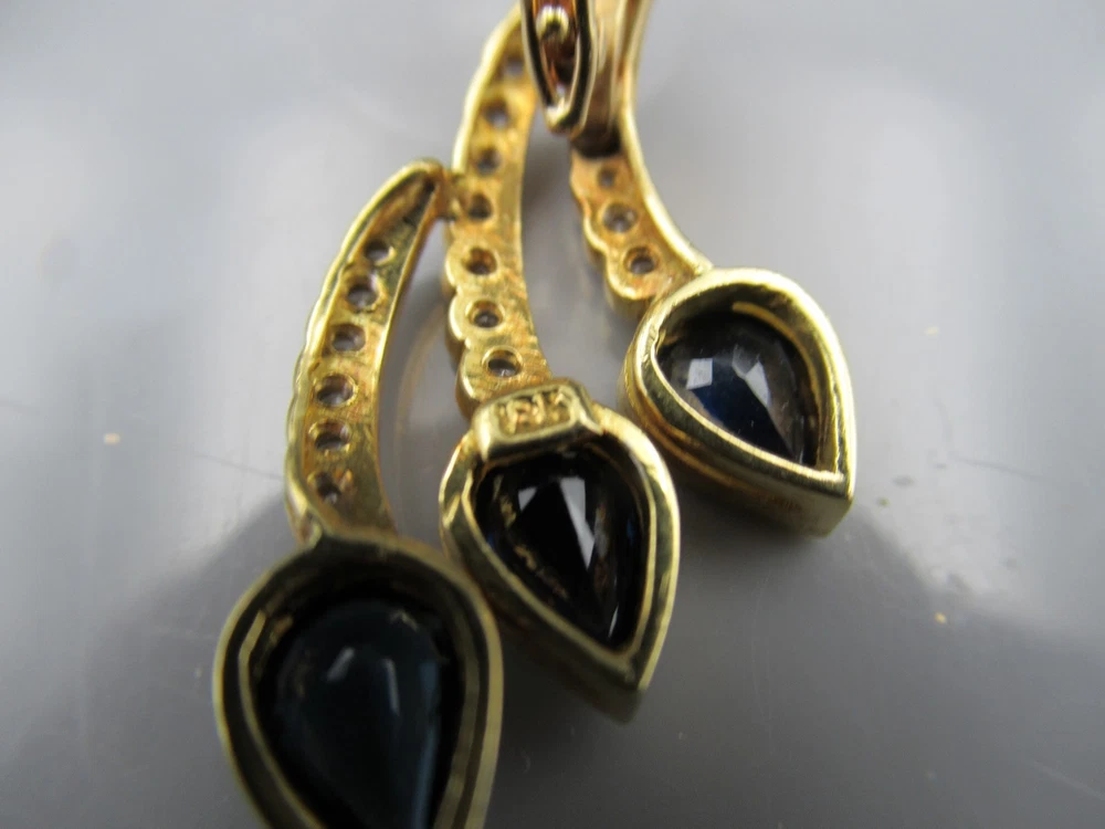 This 18KT gold pendant features an asymmetrical design with 20 natural diamonds and 3 beautiful sapphires as the main stones. The pendant has a slide closure. It is a perfect accessory for anniversary or birthday occasions, showcasing a yellow gold metal with a blue sapphire color. The pendant exudes beauty and elegance, making it a unique and luxurious piece of fine jewelry. THE PENDANT IS APPROXIMATELY 32.5 mm BY 12.1 mm AND WEIGHS 4.44 GRAMS. THE APPROXIMATE TOTAL DIAMOND WEIGHT IS .28CT AND THE SAPPHIRES 1.75CT. THIS IS ON ORIGINAL PURCHASE RECEIPT WHICH IS INCLUDED. RETAIL VALUE OVER $3,495.00. 2294a