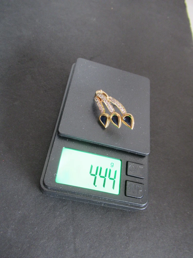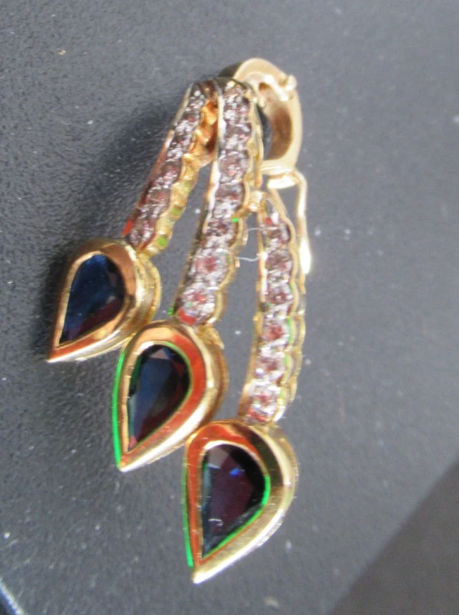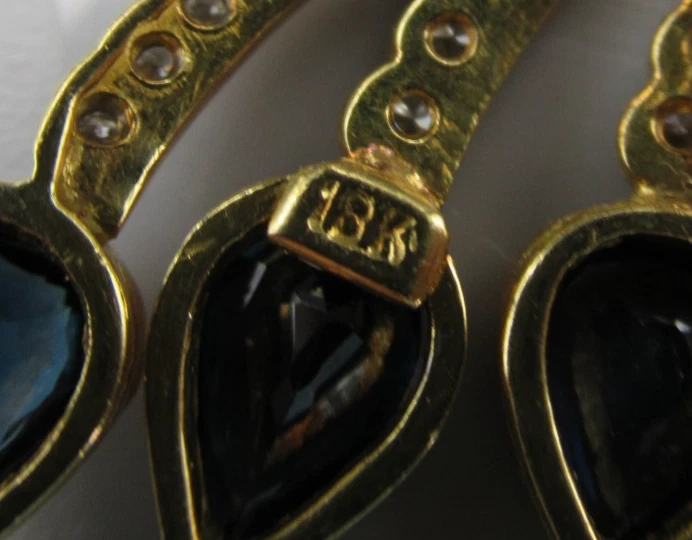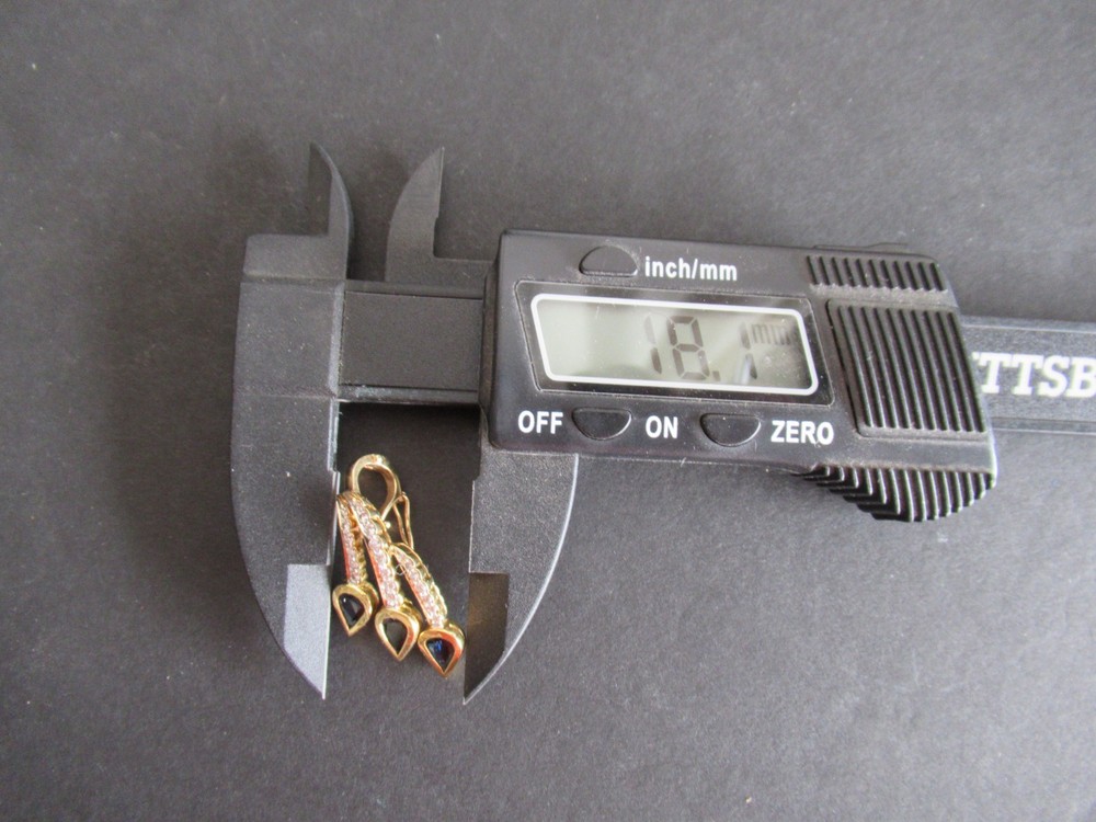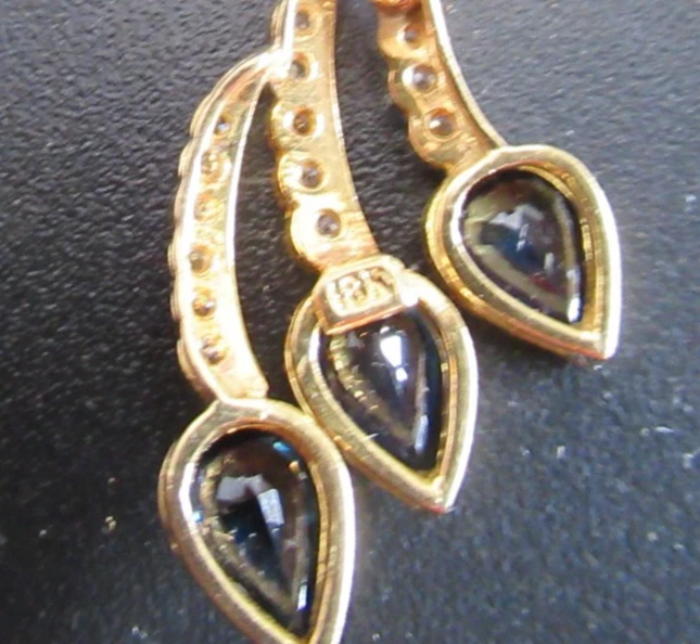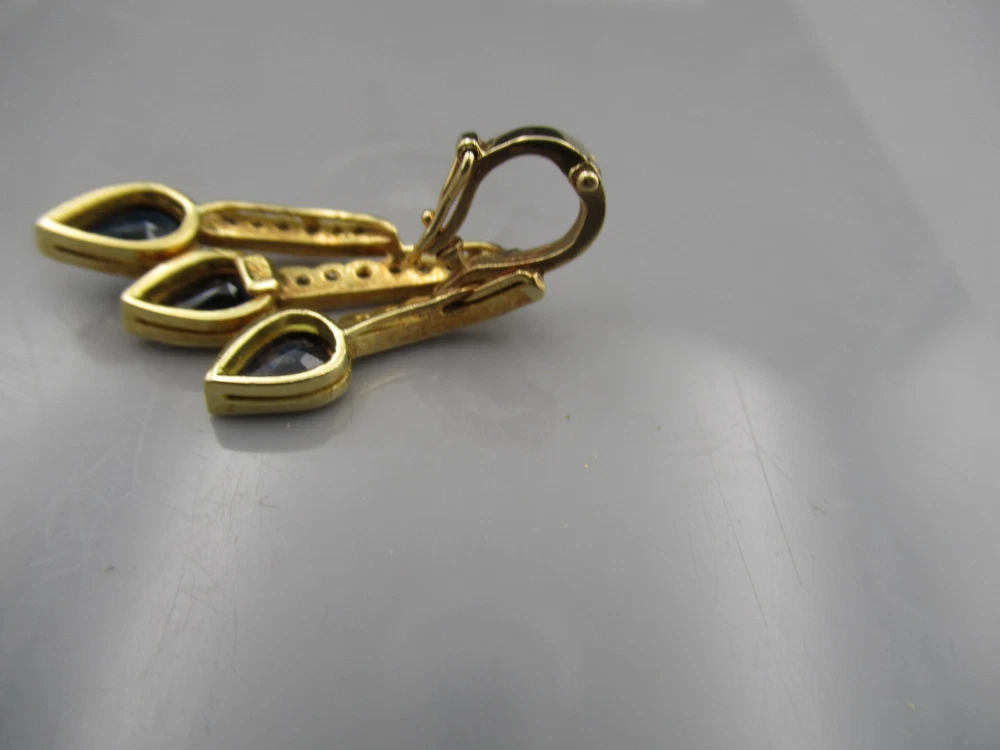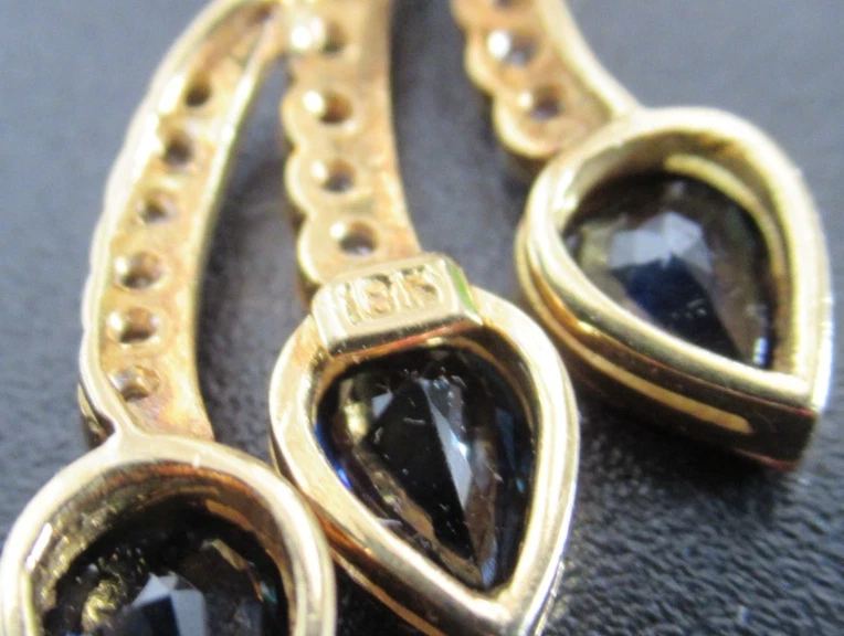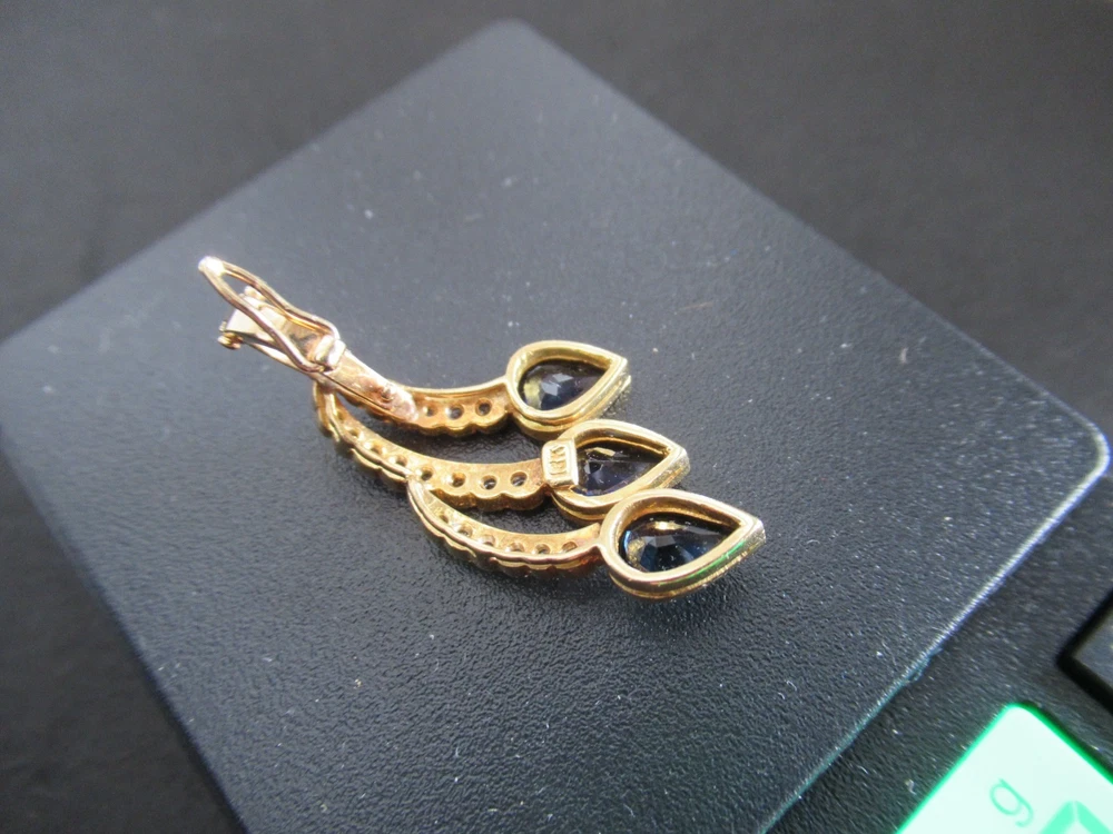 This 18KT gold pendant features an asymmetrical design with 20 natural diamonds and 3 beautiful sapphires as the main stones. The pendant has a slide closure. It is a perfect accessory for anniversary or birthday occasions, showcasing a yellow gold metal with a blue sapphire color. The pendant exudes beauty and elegance, making it a unique and luxurious piece of fine jewelry. THE PENDANT IS APPROXIMATELY 32.5 mm BY 12.1 mm AND WEIGHS 4.44 GRAMS. THE APPROXIMATE TOTAL DIAMOND WEIGHT IS .28CT AND THE SAPPHIRES 1.75CT. THIS IS ON ORIGINAL PURCHASE RECEIPT WHICH IS INCLUDED. RETAIL VALUE OVER $3,495.00. 2294a