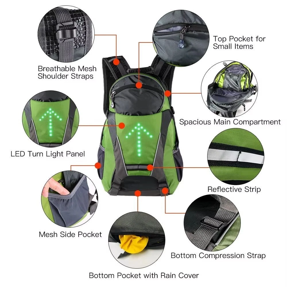 Product Specifications Size:440*290*180mm Rainproof Nylon material, softback 30 LEDs,85*70mm direction indicator Can be green-red or yellow-red color LEDs Built-in 500mAh rechargeable Lithium battery Mini USB recharged (include USB cable) Black remote, wireless control function. Weight: 0.64kg, Capacity: 18 L With a rain cover at the bottom pocket Packing : Package Inclued: 1 x Backpack LED Turn Signal with USB Cable (Receiver) 1 x Remote Controller (Transmitter) 1 x User Manual Shipping & Handling As we are new, to show you our appreciation to your attention, we would like to offer the following package for your consideration: · Buy 1 at a time , Shipping cost to worldwide is $19.99usd · Buy 2 (Combined) at a time, Shipping cost to worldwide is $9.99usd · Buy 3 (Combined) at a time, Shipping cost is FREE worldwide + an extra small gift NOTE: 1. For combined order of multiple articles, please contact us to enjoy the discounted shipping cost. 2. We will use Standard Intl Shipping Options to deliver your order, it will be safe and only takes around 8--15working days arriving at you after tracking # is provided. Payment · Please make payment for your order within 3 days of purchase. · We accept bank deposit or PayPal. Returns and Replacements · For lost/ damaged /missing items , please contact us for discussion, we will according to your comfortable request- either send you a replacement or alternatively refund you · For returns or exchanges we except returns within 30 days of receiving the item. Customer is responsible for return shipping fees. Feedback · After your order is received, If you are happy with item, please leave us a 100% positive feedback and five-star ratings on the transaction, allowing us to know you are happy with our product and other Ebay Members about your experience with us… · However, if you are unhappy with time, please contact us for a flexible resolution, and please don’t leave a neutral or negative feedback without communicating… Your support is highly appreciate in advance. Customized Service WE are also open and accept OEM customized service for branding … distribution & wholesale is welcome. THANK YOU FOR LOOKING AND HAVE A GREAT DAY !!!