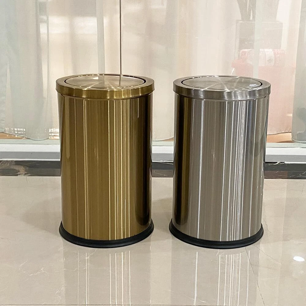 [Material and Appearance] : The whole trash can (including the lid and bucket body) is made of high-quality stainless steel material, with waterproof, rust-proof and fingerprint-proof characteristics. The barrel body adopts the wire drawing process, which not only enhances the visual texture, but also makes the trash can more thick and durable, and can maintain a beautiful appearance for a long time. [Swing Lid Design] : The lid is made of stainless steel and made by fine drawing process, which not only increases the structural strength but also enhances the overall high-grade feeling. The unique swing cover design supports 360-degree rotation and automatic return, making the disposal of garbage more convenient and fast operation, but also ensure good sealing, effectively reduce odor diffusion. [Composition] : This golden kitchen trash can is made up of three parts - a beautiful stainless steel lid, a PP plastic pressure ring to hold the garbage bag in place, and a sturdy stainless steel bucket body. This design ensures that the bags are perfectly hidden inside, avoiding unsightly problems caused by exposure. [Non-slip Base] : The bottom is equipped with non-slip gaskets, which can not only effectively prevent the garbage can from being dumped due to accidental collision, but also protect the ground from scratch damage, especially suitable for the family use of laying wood floors or tiles. [Large Capacity] : With 4.7 gallons of large capacity space, enough to meet the needs of the kitchen, living room and other areas in the daily family, but also very suitable for offices, meeting rooms and other high-end business places, is a practical and decorative ideal choice.