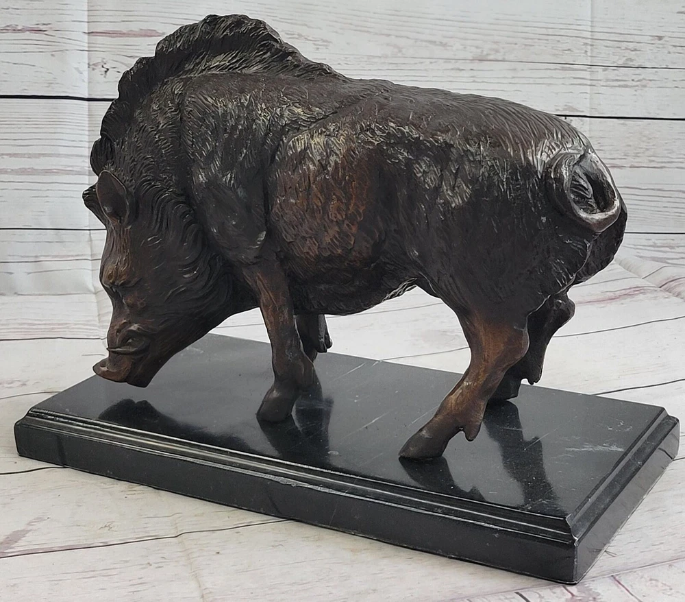 18LBS Signed ART Statue Bronze Marble wild boar Wild Pig & hunting dog WAR Art 18LBS Signed ART Statue Bronze Marble wild boar Wild Pig & hunting dog WAR Art Condition : This sculpture is in perfect condition Bronze Dimensions with Marble Base: Height 9 1/2" X Width 12" Marble Dimensions:12" X 7" Height without base:8 1/2" Weight:18 LBS Inventory:27-9944926572 Witness the captivating presence of the wild boar as it emerges from the forest's edge, exuding strength and defiance. This remarkable bronze sculpture captures the essence of this powerful creature with exceptional detail and artistry. From its alert gaze to the texture of its fur, every aspect of the boar has been meticulously crafted. Symbolizing warrior spirit, courage, and leadership in Celtic beliefs, the wild boar stands as a testament to bravery and perseverance. Its noble and fierce nature is beautifully portrayed in this handmade bronze sculpture, created using the ancient technique of lost-wax casting. The brown patina finish adds depth and character to the sculpture, highlighting the intricate details of the boar's form. Mounted on a black marble base, this sculpture becomes a striking focal point, whether displayed in a home, office, or gallery. The artist Moigniez's signature further enhances its quality and artistic value. Invite the spirit of the wild boar into your space and embrace the symbolism of strength and determination that it embodies. Wild Boar Pig Feral Hog Bronze Statue Sculpture Figure on Marble Base J. Moigniez 94492M Video will open in a new window Using the eBay App? Paste link into a browser window: [isdntekvideo] Shipping Terms : Most of our items are shipped via USPS (United States Postal Service) mail or UPS. Most orders are shipped within 24-48 hours of purchase. Please be aware that not all items are available for USPS shipping due to size and weight. We do ship to Hawaii, Alaska, Canada, Puerto Rico, APO/AE, and U.S. Virgin Islands, however, an additional charge may be required. Please contact us before making any purchases in these areas. For Non-USA customers, you may be responsible for all duty, tax, brokerage fees that may be due upon delivery (shipping costs cover freight charges only). We also ship internationally. Please refer to the "Shipping and Handling" chart for the rates for each area. Payment : We accept just about any form of payment. PayPal, Master Card, Visa or American Express credit cards. Money orders, cashiers checks, and even personal or business checks. For governmental institutions, we will also accept a purchase order. Please understand that for personal or business checks we have to wait for the check to clear (usually 7 days) before shipping. Condition : New Detailed Hand Crafted Hot Cast Bronze Satisfaction Guaranteed. This is Stock Photo, Slight Color Variation!! Listing and template services provided by inkFrog
