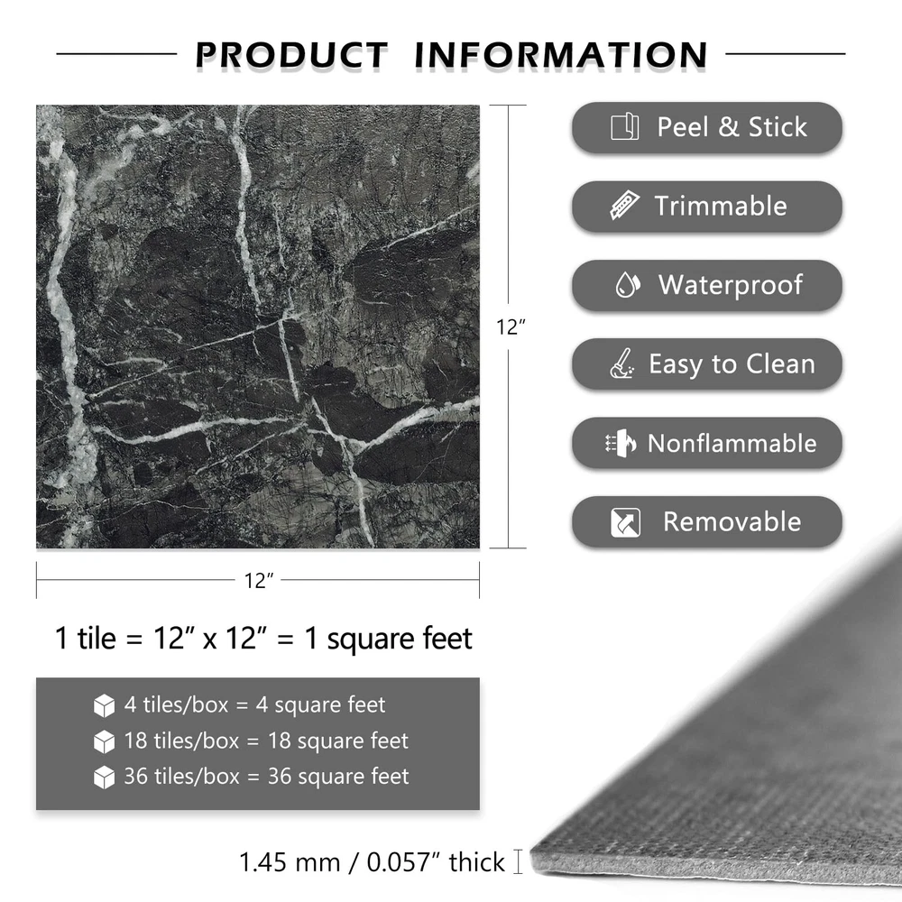 [SIZE] Length: 12 inch; Width: 12 inch [THICKNESS] 0.057 inch [MATERIAL] Vinyl [COLOR] Black Grey White Peel and Stick Floor Tile [STYLE] Black Marble Peel and Stick Floor Tile [DESIGN CONCEPT] Natural marble looking brings timeless charming for your floor! [ADVANTAGES] 1. Black Marble Peel and Stick Floor Waterproof: peel and stick floor tile, self adhesive floor tiles, no extra glue needed. 2. Black Marble Peel and Stick Floor Waterproof: removable floor tiles without sticky residue, great temporary flooring for renters. 3. Black Marble Peel and Stick Floor Waterproof: 12 x 12 peel and stick floor tile, vinyl floor tiles, vinyl laminate flooring, linoleum flooring. 4. Black Marble Peel and Stick Floor Waterproof: Waterproof flooring, stain resistant, moisture-proof, anti-slip, easy to clean. 5. Black Marble Peel and Stick Floor Waterproof: This peel and stick tile floor can be used as bathroom floor tile, shower floor tile, kitchen floor tile, it also can stick on bedroom floor tiles, living room floor tiles, this sticky floor tiles are suitable for dinning room, laundry, nursery, dollhouse, playroom, cubicle, farmhouse, garage, basement, attic, kitchenette, gym, dorm, classroom, apartment, office and rv flooring. [PRO TIPS] 1. Measure the size of the floor surface before purchase, buy enough rolls at one time to avoid color difference. 2. Clean the surface before pasting. The adhesion will be the best if the surface is clean, smooth, dry and flat. 3. We recommend to avoid leaving too much water on the floor tiles while cleaning within two days after installation, which helps to maintain great adhesion for a long time. ➤ SIZE & MATERIAL: Each marble floor tile measures 12"x12" and 0.057" thick. 18 tiles per box, totally can cover 18 square feet. The sticky floor tiles are made of superior vinyl, wear resistant and nonflammable, safe for your family. ➤ EASY TO INSTALL: Self adhesive vinyl floor tiles, just peel and stick floor tiles to your room, readjust if you need, cut with utility knife or scissors to fit small space, no grout or special tools needed. ➤ EASY TO CLEAN: This black marble peel and stick floor tile is waterproof and washable, oil proof and stain resistant, easy to clean with a wet mop. ➤ REMOVABLE: Just remove the vinyl flooring tiles if you want. It's perfect removable floor tiles and temporary flooring for renters! ➤ MULTI-USE: Stick on floor tiles to any dry, clean and flat floor, such as for bathroom flooring, kitchen flooring, rv flooring, bedroom, living room, laundry room, dining room, basement, entryway, foyers, gym, garage, office, apartment, classroom, etc. ➤ 24/7 SERVICES: Any questions about peel and stick floor tiles, please feel free to contact us or "Ask a Question". Get the black marble tiles for floor, and start to enjoy your DIY time!