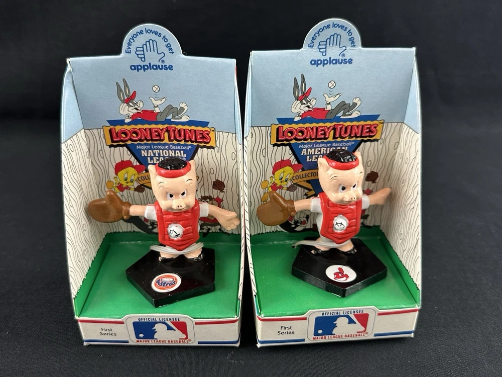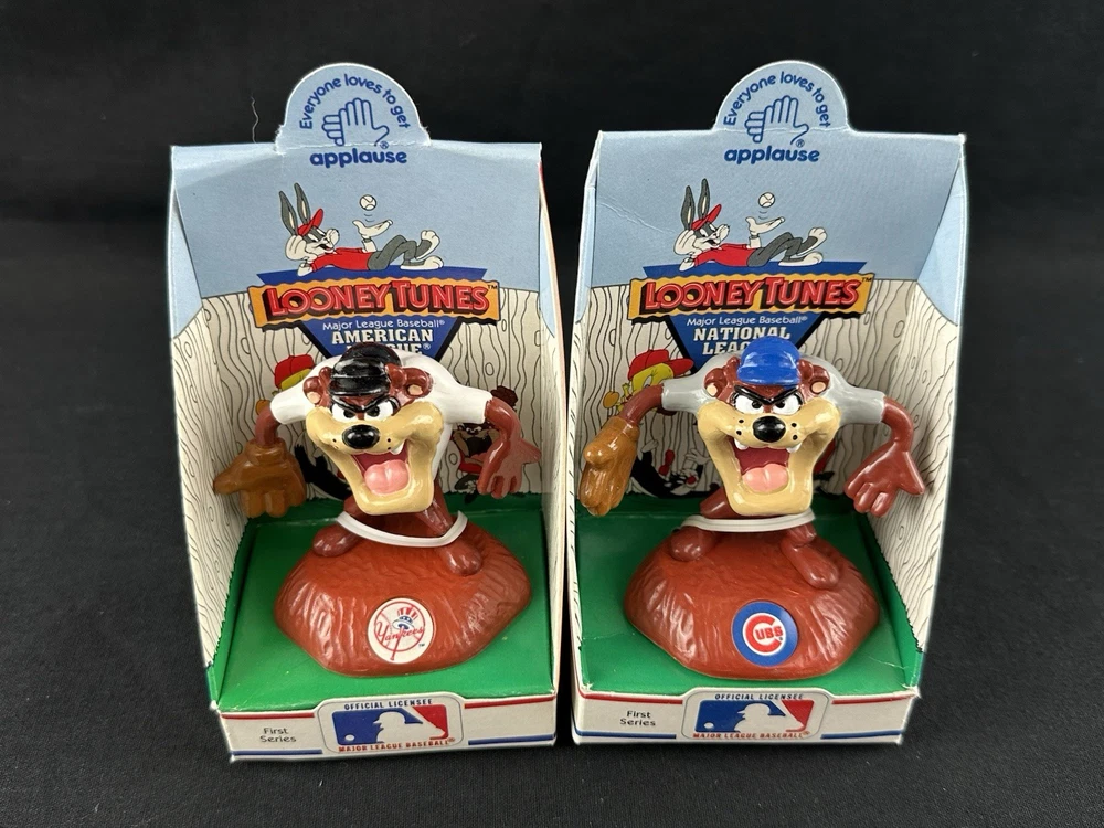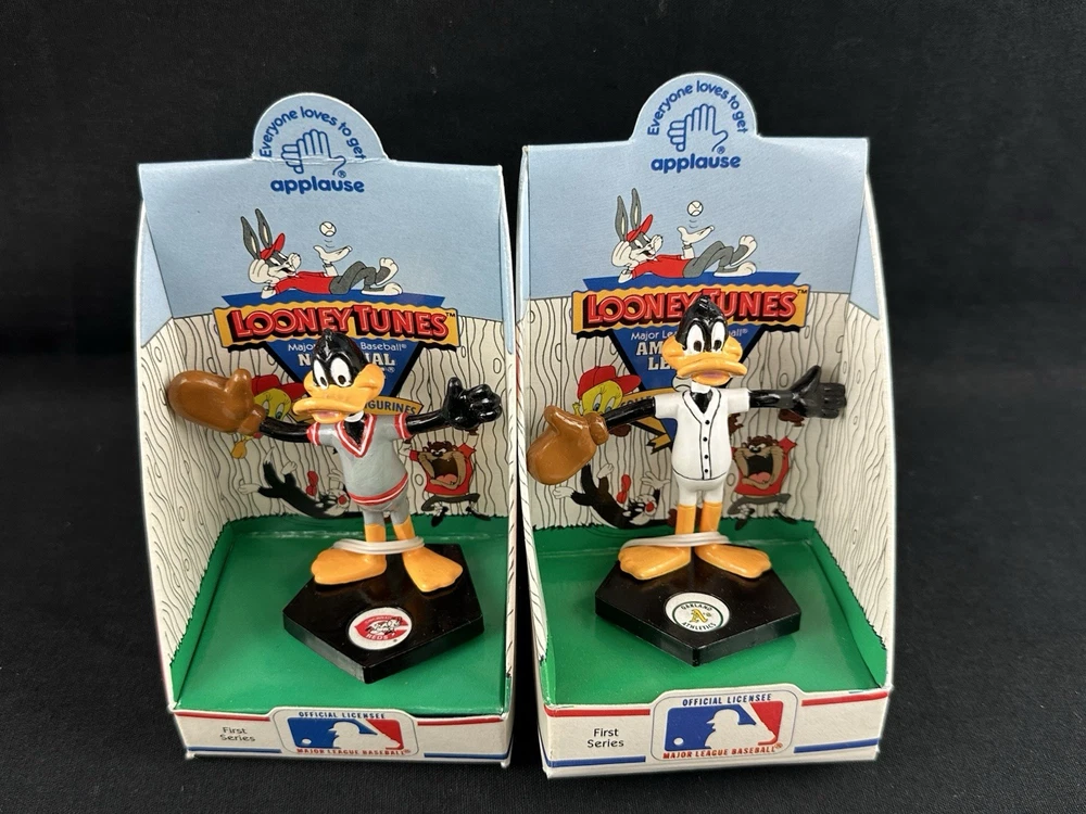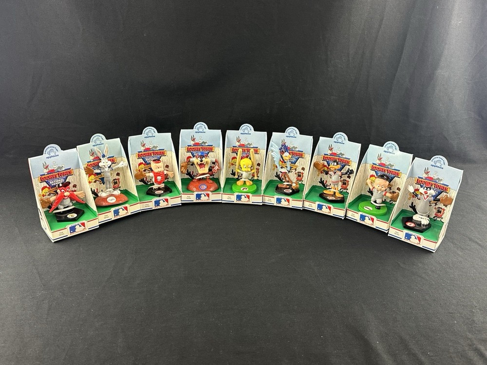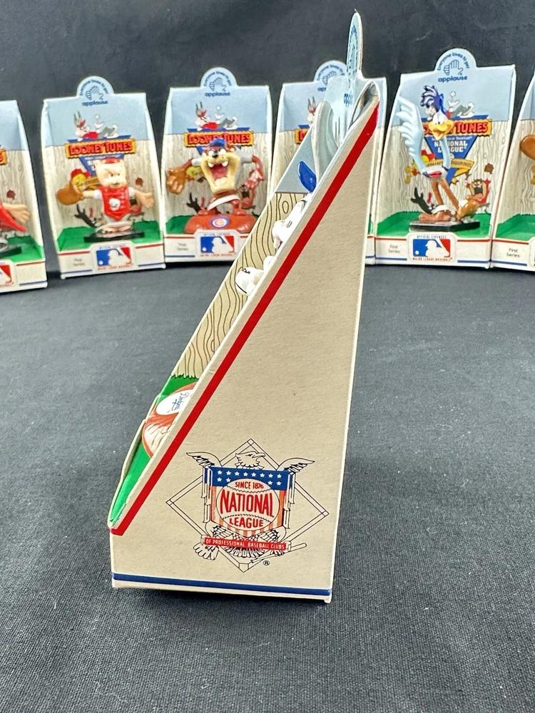 Up for sale is a Complete Set of (18) Applause PVC Looney Tunes Baseball Figures - Series 1 - New in Box. You get 9 National League teams and 9 American League teams. All figures are new in their original factory boxes. These were wrapped in plastic since purchase and removed for these pictures. No years of dust or fading on these! Great collection!