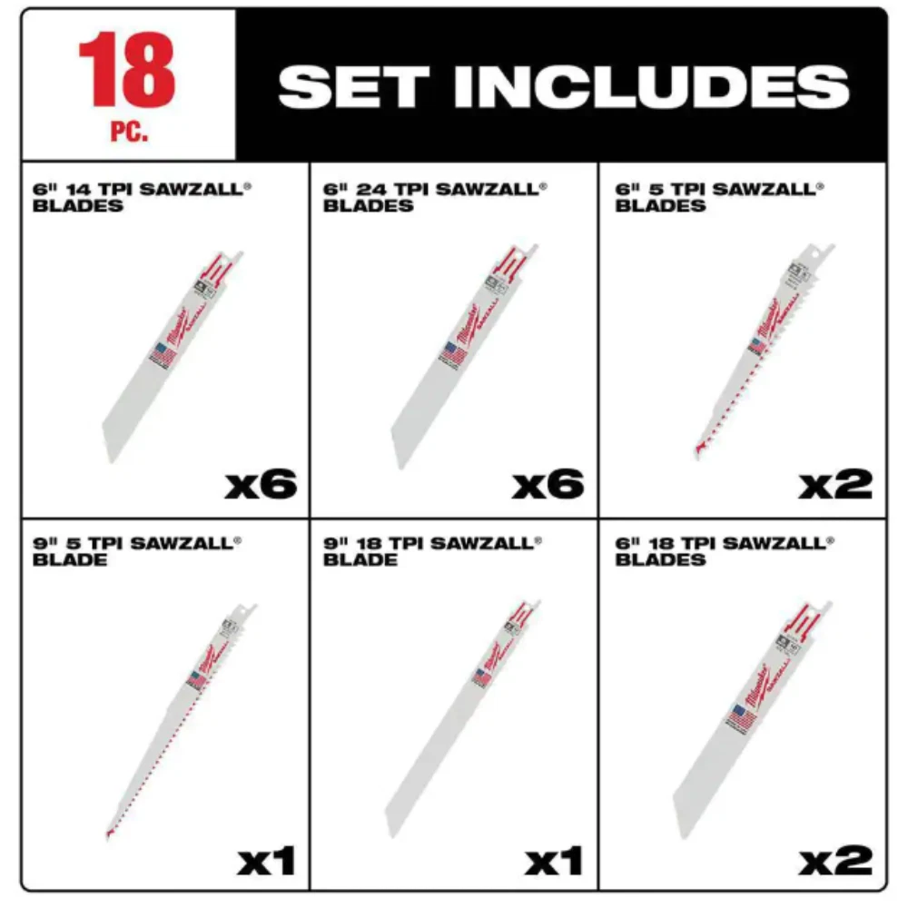 18-Piece SAWZALL Wood And Metal Cutting Bi-Metal Reciprocating Saw Blade Sets The MILWAUKEE 10-Piece SAWZALL Blade Set plus 8 FREE blades offer an assortment of wood and metal cutting SAWZALL blades for a wide range of applications. Milwaukee SAWZALL Blades feature an optimized tooth design that provides a longer life over standard bi-metal blades and are ideal for fast, flexible cuts. This set also includes an innovative job site durable case for convenient blade storage. Highlights NAIL GUARD combines an aggressive 5 TPI pattern for faster cutting, with a unique design that protects against tooth fractures FANG TIP design bites into wood on first contact for faster plunging Offers longer blade life over standard bi-metal blades Matrix II bi-metal teeth for greater durability Jobsite durable storage case holds up to 9 in. blades Precision forming process creates sharper teeth for fast cutting 1/2 in. Universal tang Made in USA Includes: 10-Piece SAWZALL blade set plus 8 free blades Shipping Policy FREE SHIPPING in all orders! Orders are usually processed and shipped out after 72 HOURS during BUSINESS DAYS (Monday to Friday) after payment has been received. But please be reminded that we are NOT processing and shipping orders during WEEKENDS and HOLIDAYS. Please make sure your ADDRESS is VALID for both UPS and USPS COURIER SERVICES. Please be reminded that costs incurred due to INCORRECT or UNDELIVERABLE ADDRESS should be shouldered by the buyer. The shipping services that we use are UPS, FedEx, USPS etc. We ONLY ship to the 48 STATES, NO APO/FPO ADDRESSES or PO BOXES. We DO NOT ship to warehouse, freight company. Local pickups and combined shipping options are NOT provided at this time. Return Policy DOMESTIC RETURN ACCEPTED - 30 DAYS. Contact us for more information. Payment Policy We accept payment by any of the following methods: PayPal Items can be returned for exchange or full refund WITHIN 30 DAYS from the date you receive your merchandise. We are not responsible for any purchase after this 30-day period. Feedback & Contact Us Customer satisfaction is very important to us. If you have any problem with your order, please contact us and we will do our best to make you satisfied. If you have any queries, please contact us via Ebay. We usually respond within 24 hours on weekdays. Thank you for shopping at our store.