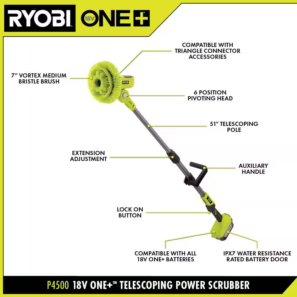 Fast Shipping On All Items 30 Days Money Guarantee Customer Support Excellent Service 100% Satisfaction Satisfaction Guaranteed ONE+ 18V Cordless Telescoping Power Scrubber (Tool Only) with 6 In. Knit Microfiber Kit Specification Cleaning Tool Type Squeegee/Washer Part/Accessory Pack Size 2 Product Weight (lb) 4.6 lb Recommended Surfaces Multisurface Returnable 90-Day Manufacturer Warranty 3-Year Manufacturer's Warranty Product Depth (in) 7.12 in Product Diameter (in) 49.5 in Product Height (in) 54.5 in Product Width (in) 4.25 in 4.25 inches x 7.12 inches x 54.5 inches. Weight: 4.6 lb Item Description Includes: Cordless Telescoping Power Scrubber and 6 in. Brush Includes: 6 in. 2-Piece Knit Microfiber Kit Over 300 ONE+ Products – All Work With Any RYOBI ONE+ 18V Battery RYOBI introduces the 18V ONE+ Cordless Telescoping Power Scrubber (Tool Only) with 6 in. Knit Microfiber Kit. As the industry's most powerful handheld scrubber, this cleaning tool is able to power through tough stains and grime. Telescoping up to 51 in., this handheld scrubber is perfect for reaching those hard to reach high or low areas. This scrubber features a 6 position articulating head, allowing users to customize the brush angle for the ultimate clean. With a runtime of up to 2 hours, this tool can handle the largest of cleaning projects. All RYOBI scrubbers have an IPX7 Water Resistance Rating, allowing these cleaning tools to be submerged in up to 3 feet of water for 30 minutes. This 18V ONE+ Cordless Telescoping Power Scrubber is compatible with additional interchangeable triangle connection brushes in the RYOBI Cleaning Accessories lineup. Best of all, it's a part of the RYOBI ONE+ System of over 300 Cordless Products that all work on the same battery platform. Backed by the RYOBI 3-Year Manufacturer's Warranty, the 18V ONE+ Cordless Telescoping Power Scrubber includes a 6 in. Medium Stiffness Bristle Brush and an operator's manual. Battery and charger sold separately. Included in this set is (1) 6 in. Knit Microfiber Head and (1) 6 in. Hook and Loop Backer. About us We offer the best prices around on high quality products. Our E-store includes media such as books, movies, music and games while offering electronics, toys, sporting apparel, clothing, tools, general home, garden items and more. Shipping We are always working hard to ensure your package arrives as soon as possible. Please understand that some factors like weather, high postal traffic, and the performance of shipping companies are outside of our control. We offer free shipping to the lower 48 states and ship within 2-3 business days of payment, usually sooner. We do not accept P.O. Boxes. Please provide a physical address. For shipping outside of the continental USA, we only use eBay's Global Shipping Program.The item is shipped to KY and then sent to the rest of the world. International customers are responsible for all duties and taxes. Continue to check out to calculate costs for shipping the item to your country. Messages regarding eBay's Global Shipping Program MUST be directed at eBay EXCLUSIVELY. Returns We offer a 30-Day Return Policy on items in which you are not completely satisfied with. You have the option of a full-refund or an exchange of the item. No returns are available on items shipped outside of the USA Satisfaction We try over very best to make sure every customer is completely satisfied. If there's a problem, message us! We're happy to help. Payment Options Shop With Confidence