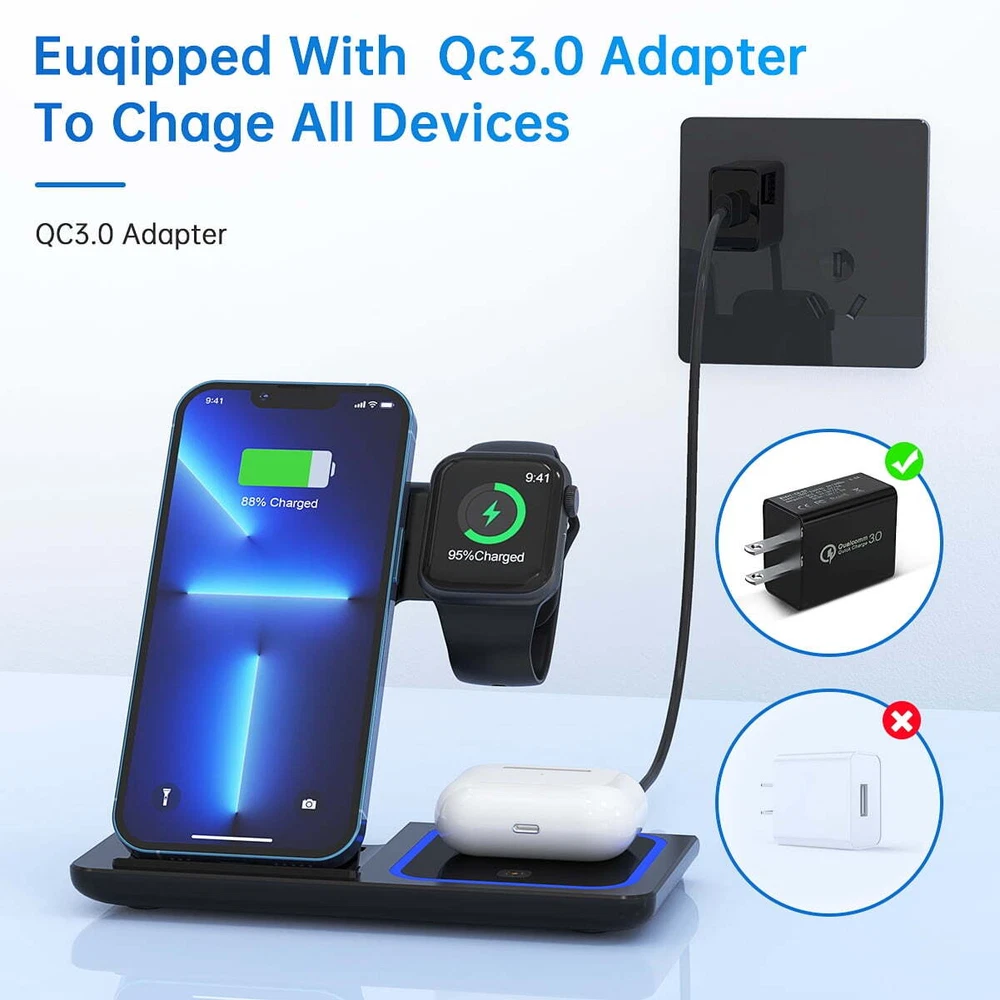 For other styles of wireless chargers, please click the link below NOTE:Please DO NOT directly use the included charging cable to connect the phone to charge, otherwise it will easily burn the phone. 3-in-1 Wireless Charging Station: You can charge your apple products simultaneously with this 3-in-1 wireless charger stand. It charges your iPhone, iWatch and AirPods at the same time.Powered by QC3.0 adapter (INCLUDED), the charging stand outputs up to 10W for phones, 5W for AirPods, 2.5W for iWatch. . Safe Wireless Charger: The fast wireless charging station provides you a safe charging experience. It adopts over-current protection, over-voltage protection, over-charging protection techniques, and massive heat dissipation holes, ensuring your charging safe & secure. . Adjustable & Foldable Charging Stand: Designed for your convenience, this wireless charging station is adjustable with 2 gears and foldable for carrying around. You can also charge your phones vertically while browsing apps (Instagram, TikTok, Facebook, etc.) and horizontally while watching movies. It suits your office desk, end table, and bedside desk perfectly. . Advanced smart protection: The 3 in 1 wireless charger uses high-efficiency components and advanced chipsets, and the dual-coil design greatly improves the charging speed of the device. Control, foreign body detection, etc, you and your products will be fully protected. . No longer need a lot of wires: The 3 in 1 wireless charging station can reduce your charging cable on your desk for different devices, only need one cable, save place and look neatly. Easily install and conveniently to use. Just put your device in the right charging place and insert the cable. Features Specifications: Input Voltage/Current: DC 9V-2A Wireless Output for Phone :5W/ 7.5W/10W /15W Max. Wireless Output for Airpod: 5W Max. Wireless Output for iWatch: 2W Max. Material: ABS+PC Fireproof Material What Youâll Get 1*3 in 1 Wireless Charger 1*Type-C Power Cable 1*QC3.0 adapter 1*User Guide 10W Fast Charge Mode (with Quick charge 3.0 adapter) - Samsung Galaxy S25/S24 /S23/ S21/ S20/ S10/ S10 Plus/ S10e/ Note 10 - Samsung Galaxy S9 Plus/ S9/ Note 9 - Samsung Galaxy S8/ S8 Plus/ Note 8 - Samsung Galaxy S7/ S7 Edge/ S6 Edge Plus/Note 5 7.5W Fast Charge Mode for iPhone series: iPhone 16/16 Plus/16 Pro/16 Pro Max iPhone 15/15 Plus/15 Pro/15 Pro Max iPhone 14 Pro/14 Plus/14 Pro/14 Pro Max iPhone 13/13 Plus/13 Pro/13 Pro Max iPhone 12/12 Plus/12 Pro/12 Pro Max iPhone 11/ 11 Plus/11 pro/ 11 Pro Max/ XS/ XS Max/ XR/ X/ 8/ 8 Plus (Not for iPhone 12 Mini/13mini) 5W standard charging (Using 5V/2A adapter): all wireless devices. Apple Watch Series SE/ 10 / 9 / 8 / 7 / 6/ 5/ 4 / 3 / 2 / 1 and Other Wireless Devices. AirPods 2/3/4/Pro/Pro 2(Wireless charged,do not need extra cable). Input:12V/2A, 9V/2.7A Phone Output:15W-7.5W-10W-5W Earbuds output: 2.5W Conversion efficiency: 73% Specification and size: 5.35*4*5.35 inches
