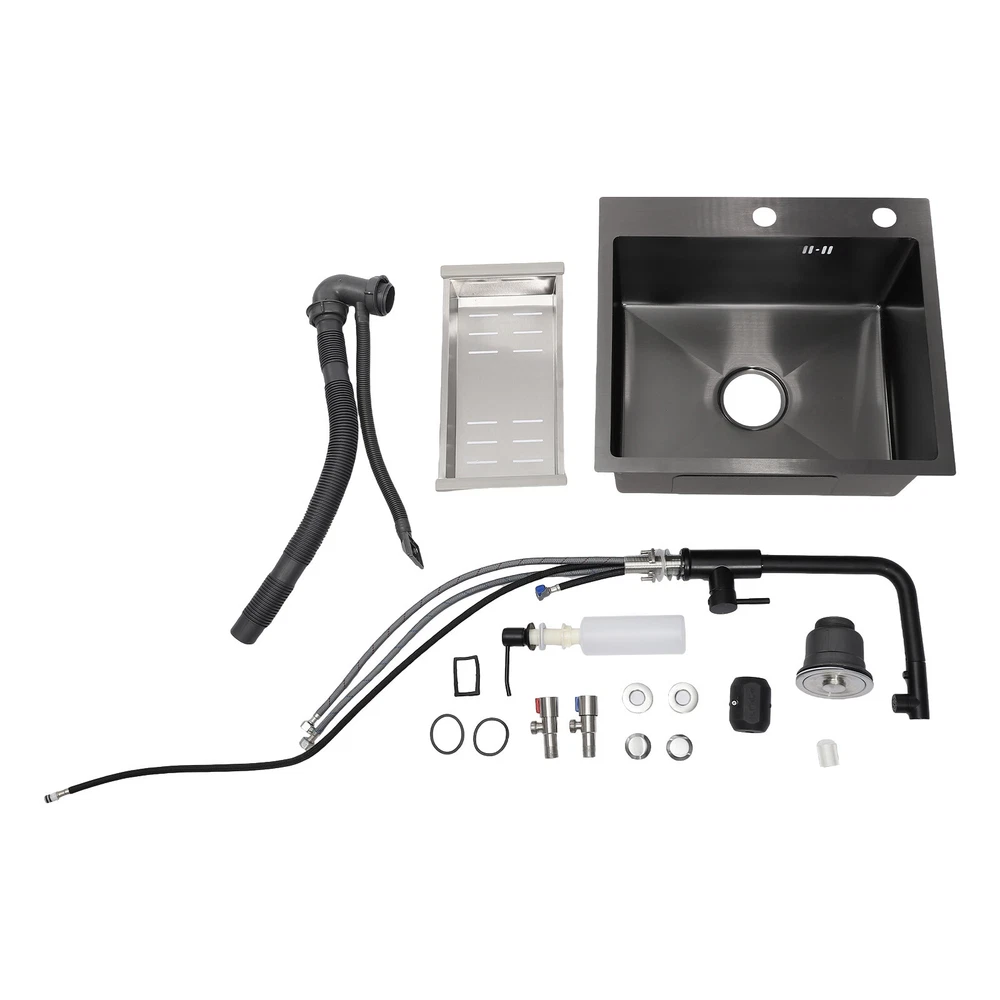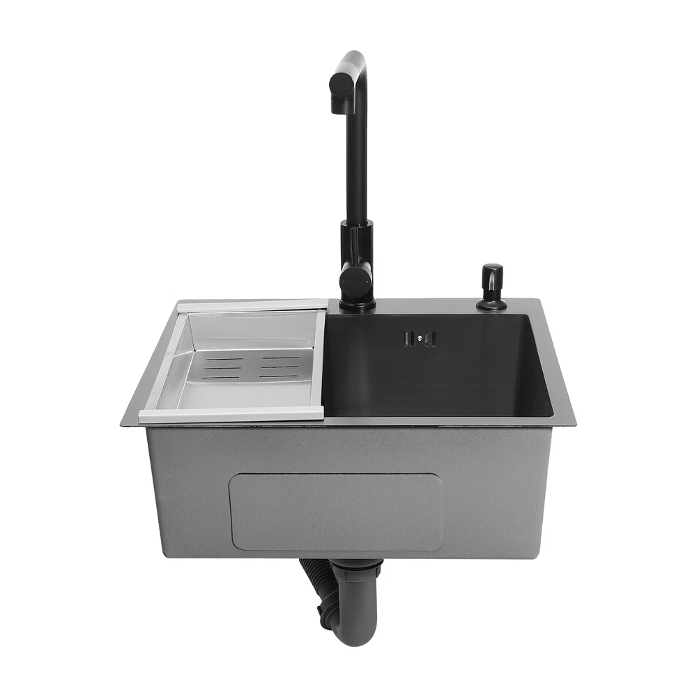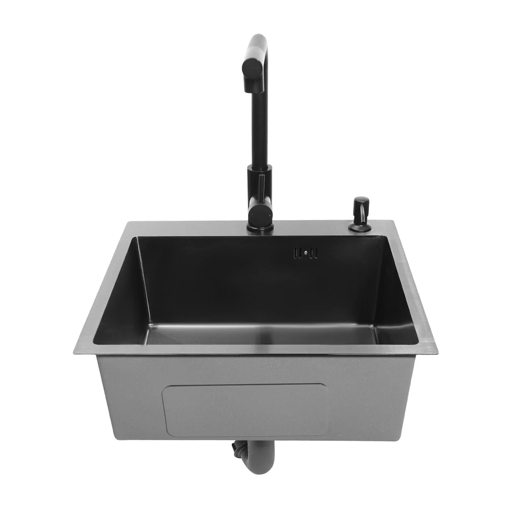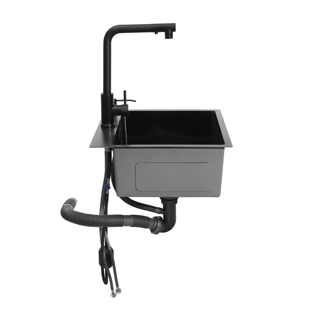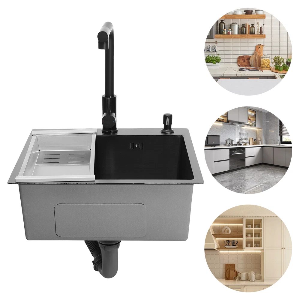 18X14" Undermount Workstation Kitchen Sink Single Bowl Drop-in with Faucet Description This 304 stainless steel kitchen sink adopts a nano-coating process, making it easy to clean and not easy to fade. Its enlarged and deepened sink not only alleviates splash problems but also improves space utilization and facilitates the cleaning of large quantities of cookware. The equipped draining basket allows for the convenient cleaning of fruits and vegetables. With it, you can enjoy a more convenient and healthier life. Key Features Build to Last: High-quality 304 stainless steel is not easy to rust, wear, and deform, and a 6-layer protective nano-coating prevents stains from adhering and enhances the sink's resistance to scratches and abrasion, making it hard to fade and reducing bacterial growth. Large Sink Size: It is large ( 18.11*13.98*7.87 inches) enough to accommodate multiple plates, dishes, and pots at once. Moreover, it prevents splashing when washing fruits and vegetables. Flexible Washing: The 360° rotatable pull-out faucet extends 23.62 inches to allow you to wash at different angles or flush the sink corners. You can switch its flush and shower water modes through the button on the spout and adjust the cold and hot water and water volume with the single handle. Humanized Design: The anti-condensation coating prevents condensation in the sink and thus prevents moisture in the kitchen cabinets. The soundproof mats on the surrounds and bottom reduce noise. Quick Drainage: It has X-shaped water guidelines and a high-performance drainer set for good drainage, effectively preventing water from accumulating inside. Complete Set: The combination of a sink and a range of accessories meets your needs in one go and is easy to install. In addition, we offer you a soap dispenser and a retractable draining basket to facilitate the draining of your dishes and allow for convenient hand washing. Easy Cleaning: Thanks to its smooth nano-coating surface, simple structure, R10 radius corners, and open design, you can easily wipe or rinse away grease and dirt on it without leaving a trace. Stylish Appearance: The modern, clean lines and elegant black color match all types of decor, making it a unique and beautiful addition to your kitchen while providing you with practical functionality. Ideal Gift: Its beautiful appearance and practical function make it an ideal housewarming gift for your friends, families, and colleagues. Details Overflow Holes: The overflow holes hidden in the sink wall prevent water from overflowing and wetting countertops and floors. Pre-drilled Holes: The reserved holes allow you to conveniently install the equipped soap dispenser and faucet. Smooth Edge: The rounded and smooth edges not only add to the aesthetics of the product but also improve the safety of use. Application This product can be widely used in homes, restaurants, laundry rooms, basements, bars, kitchens, food trucks, dessert shops, coffee shops, hotels, garages, etc. for cleaning tableware, vegetables, fruits, etc. Specification Color: Black Style: Modern Shape: Rectangular Material: 304 Stainless Steel Process: Nano-coating Assembly Required: Yes Mounting Type: Undermount, Topmount Faucet Pull-out Length: 60cm/23.62in Water Inlet Pipe Length: 60cm/23.62in Sink Size: 46*35.5*20 cm/ 18.11*13.98*7.87 in Product Size: 50*45 cm/ 19.69*17.72 in Package Size: 49*45*21.5 cm/ 19.29*17.72*8.46 in Gross Weight: 3.6kg/ 7.93lbs Net Weight: 3.3kg/ 7.28lbs Package Included 1* Kitchen Sink 1* Soap Dispenser 1* Drain Basket 1* Pull-out Faucet 1* Drainer Set 1* Multilingual Manual Other Accessories for Installation Notes Please check the size carefully before ordering. Please read the assembly instructions carefully before installation. We recommend installation by a professional. Please do not clean it with hard tools like steel wire balls for a longer service life. Please allow the slight color difference caused by the shooting light and the 1-3 cm error due to manual measurement, and make sure you do not mind before ordering. Payment Delivery details Terms of sales About us Contact us Payment We accept ebay payment 。 Fees such as import duties, taxes are not included in the item price or shipping costs. These charges are the buyer's responsibility. Delivery details Shipping: 2-9 working days to: USA Terms of sales We maintain high standards of excellence and strive for hundred percent customer satisfaction. Feedback is very important to us. We hope that you contact us immediately before you give neutral or negative feedback, so that we can address your concerns. It is impossible to address issues if we do not know about them! About us Your satis faction is our ultimate goal. We work hard to earn your trust and future business. Our certified technicians have tested each item before shipping. The unit comes with 1 year limited warranty on all manufacturing defects. a) If you receive a defective item, you may return it or ask for a discount. Please contact us within 14 days after you receive the package. b) What you returned must be intact and in its original packaging as re? u. Customer is responsible for shipping costs of the returned item. c) We will cover the cost of shipping back t with the shipping rate indicated in the registration page. We will send you a new unit or refund the full payment you paid. Thank you. Contact us Business Hour Business Hour: Monday To Friday: 8:30 AM to 5:00 PM (Beijing China time) Due to time zones, our reply to your questions may not be immediately. But within above working time, we will reply your email within 24 hours. If it's non-workdays, please kindly be patient and wait till Monday. Please contact us with ebay message. Please feel free to contact us if you have any questions. Monday To Friday: 8:30 AM to 5:00 PM (Beijing China time) Due to time zones, our reply to your questions may not be immediately. But within above working time, we will reply your email within 24 hours. If it's non
