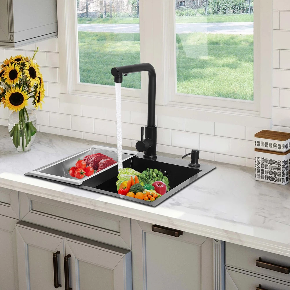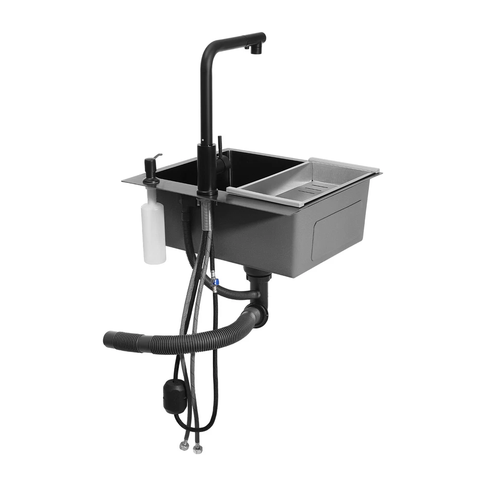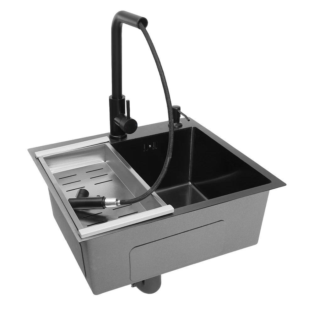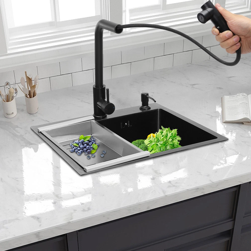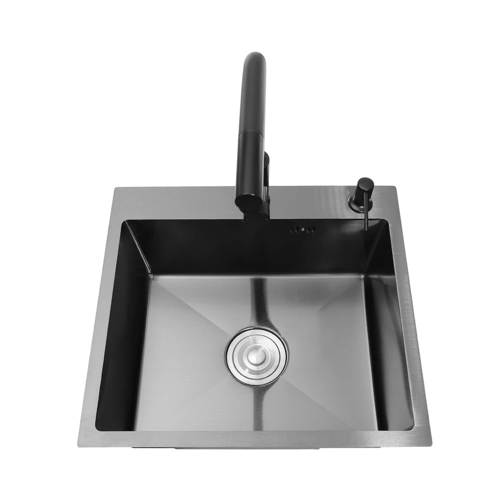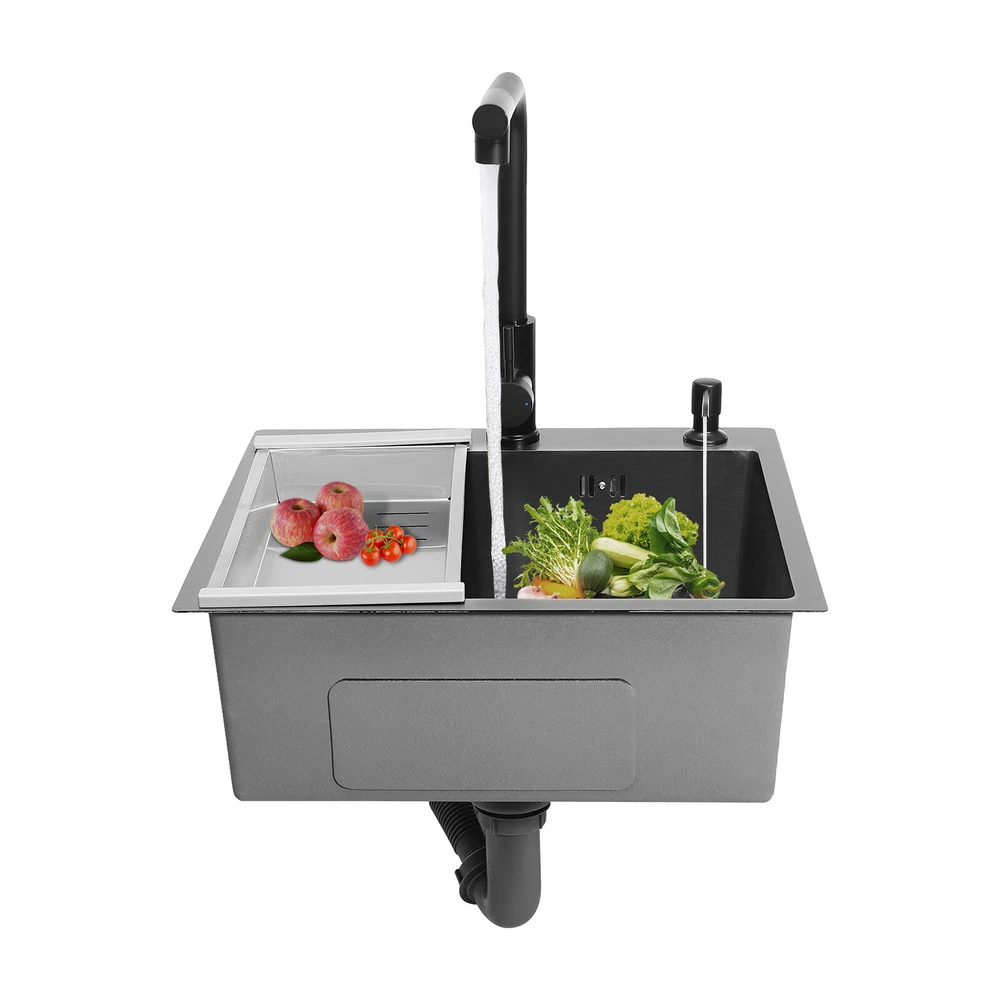 18X14" Undermount Workstation Kitchen Sink Single Bowl Drop-in with Faucet Description This 304 stainless steel kitchen sink adopts a nano-coating process, making it easy to clean and not easy to fade. Its enlarged and deepened sink not only alleviates splash problems but also improves space utilization and facilitates the cleaning of large quantities of cookware. The equipped draining basket allows for the convenient cleaning of fruits and vegetables. With it, you can enjoy a more convenient and healthier life. Key Features Build to Last: High-quality 304 stainless steel is not easy to rust, wear, and deform, and a 6-layer protective nano-coating prevents stains from adhering and enhances the sink's resistance to scratches and abrasion, making it hard to fade and reducing bacterial growth. Large Sink Size: It is large ( 18.11*13.98*7.87 inches) enough to accommodate multiple plates, dishes, and pots at once. Moreover, it prevents splashing when washing fruits and vegetables. Flexible Washing: The 360° rotatable pull-out faucet extends 23.62 inches to allow you to wash at different angles or flush the sink corners. You can switch its flush and shower water modes through the button on the spout and adjust the cold and hot water and water volume with the single handle. Humanized Design: The anti-condensation coating prevents condensation in the sink and thus prevents moisture in the kitchen cabinets. The soundproof mats on the surrounds and bottom reduce noise. Quick Drainage: It has X-shaped water guidelines and a high-performance drainer set for good drainage, effectively preventing water from accumulating inside. Complete Set: The combination of a sink and a range of accessories meets your needs in one go and is easy to install. In addition, we offer you a soap dispenser and a retractable draining basket to facilitate the draining of your dishes and allow for convenient hand washing. Easy Cleaning: Thanks to its smooth nano-coating surface, simple structure, R10 radius corners, and open design, you can easily wipe or rinse away grease and dirt on it without leaving a trace. Stylish Appearance: The modern, clean lines and elegant black color match all types of decor, making it a unique and beautiful addition to your kitchen while providing you with practical functionality. Ideal Gift: Its beautiful appearance and practical function make it an ideal housewarming gift for your friends, families, and colleagues. Details Overflow Holes: The overflow holes hidden in the sink wall prevent water from overflowing and wetting countertops and floors. Pre-drilled Holes: The reserved holes allow you to conveniently install the equipped soap dispenser and faucet. Smooth Edge: The rounded and smooth edges not only add to the aesthetics of the product but also improve the safety of use. Application This product can be widely used in homes, restaurants, laundry rooms, basements, bars, kitchens, food trucks, dessert shops, coffee shops, hotels, garages, etc. for cleaning tableware, vegetables, fruits, etc. Specification Color: Black Style: Modern Shape: Rectangular Material: 304 Stainless Steel Process: Nano-coating Assembly Required: Yes Mounting Type: Undermount, Topmount Faucet Pull-out Length: 60cm/23.62in Water Inlet Pipe Length: 60cm/23.62in Sink Size: 46*35.5*20 cm/ 18.11*13.98*7.87 in Product Size: 50*45 cm/ 19.69*17.72 in Package Size: 49*45*21.5 cm/ 19.29*17.72*8.46 in Gross Weight: 3.6kg/ 7.93lbs Net Weight: 3.3kg/ 7.28lbs Package Included 1* Kitchen Sink 1* Soap Dispenser 1* Drain Basket 1* Pull-out Faucet 1* Drainer Set 1* Multilingual Manual Other Accessories for Installation Notes Please check the size carefully before ordering. Please read the assembly instructions carefully before installation. We recommend installation by a professional. Please do not clean it with hard tools like steel wire balls for a longer service life. Please allow the slight color difference caused by the shooting light and the 1-3 cm error due to manual measurement, and make sure you do not mind before ordering. Payment Delivery details Terms of sales About us Contact us Payment We accept ebay payment 。 Fees such as import duties, taxes are not included in the item price or shipping costs. These charges are the buyer's responsibility. Delivery details Shipping: 2-9 working days to: USA Terms of sales We maintain high standards of excellence and strive for hundred percent customer satisfaction. Feedback is very important to us. We hope that you contact us immediately before you give neutral or negative feedback, so that we can address your concerns. It is impossible to address issues if we do not know about them! About us Your satis faction is our ultimate goal. We work hard to earn your trust and future business. Our certified technicians have tested each item before shipping. The unit comes with 1 year limited warranty on all manufacturing defects. a) If you receive a defective item, you may return it or ask for a discount. Please contact us within 14 days after you receive the package. b) What you returned must be intact and in its original packaging as re? u. Customer is responsible for shipping costs of the returned item. c) We will cover the cost of shipping back t with the shipping rate indicated in the registration page. We will send you a new unit or refund the full payment you paid. Thank you. Contact us Business Hour Business Hour: Monday To Friday: 8:30 AM to 5:00 PM (Beijing China time) Due to time zones, our reply to your questions may not be immediately. But within above working time, we will reply your email within 24 hours. If it's non-workdays, please kindly be patient and wait till Monday. Please contact us with ebay message. Please feel free to contact us if you have any questions. Monday To Friday: 8:30 AM to 5:00 PM (Beijing China time) Due to time zones, our reply to your questions may not be immediately. But within above working time, we will reply your email within 24 hours. If it's non