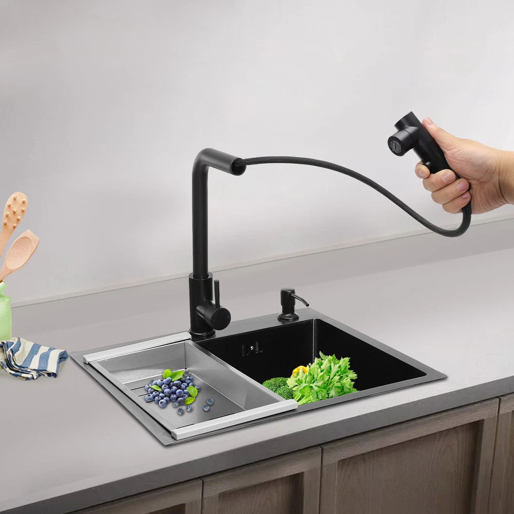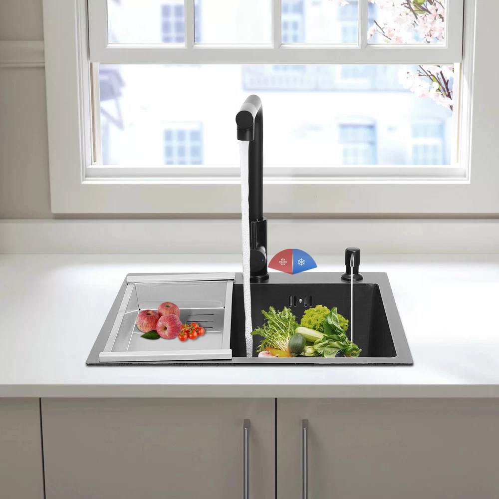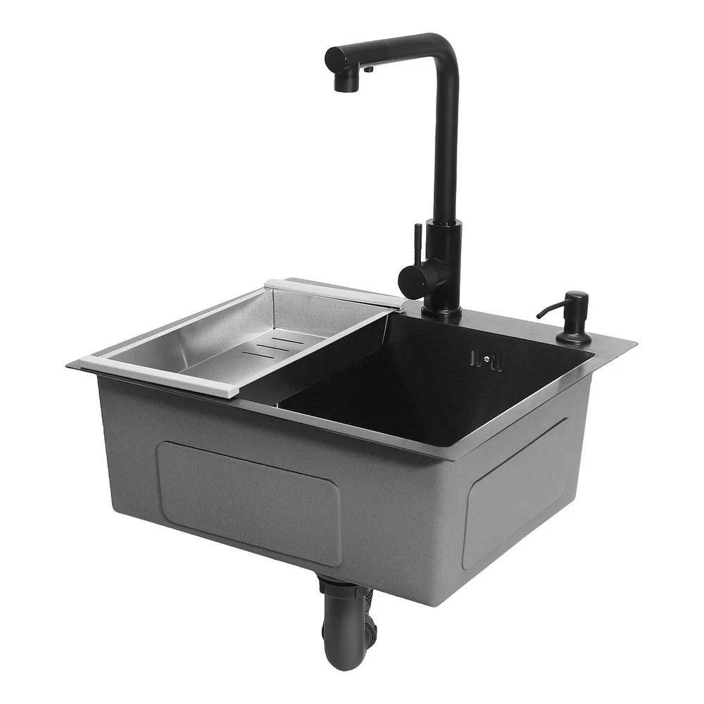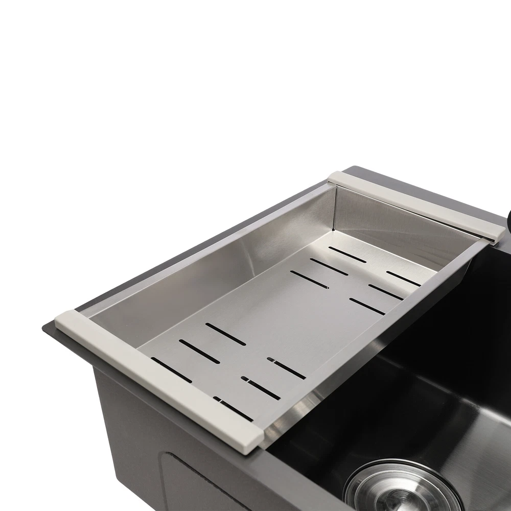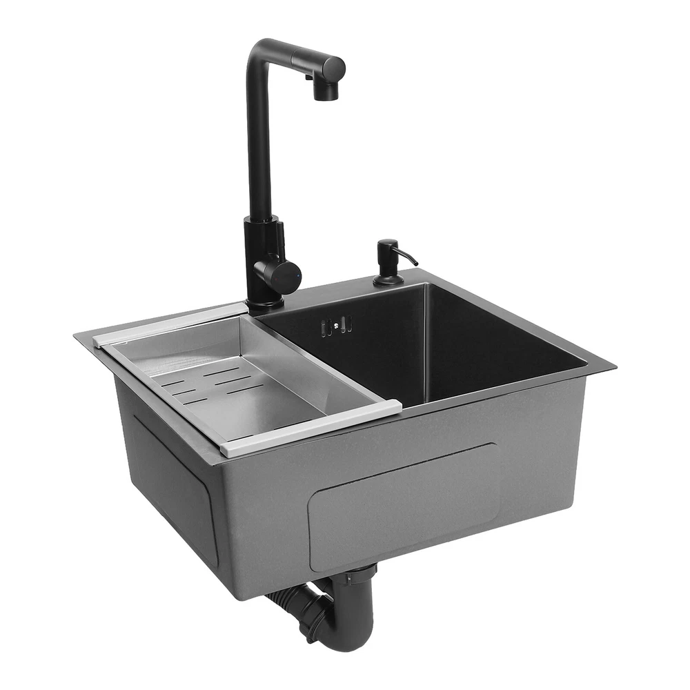 18X14" Undermount Workstation Kitchen Sink Single Bowl Drop-in with Faucet Description This 304 stainless steel kitchen sink adopts a nano-coating process, making it easy to clean and not easy to fade. Its enlarged and deepened sink not only alleviates splash problems but also improves space utilization and facilitates the cleaning of large quantities of cookware. The equipped draining basket allows for the convenient cleaning of fruits and vegetables. With it, you can enjoy a more convenient and healthier life. Key Features Build to Last: High-quality 304 stainless steel is not easy to rust, wear, and deform, and a 6-layer protective nano-coating prevents stains from adhering and enhances the sink's resistance to scratches and abrasion, making it hard to fade and reducing bacterial growth. Large Sink Size: It is large ( 18.11*13.98*7.87 inches) enough to accommodate multiple plates, dishes, and pots at once. Moreover, it prevents splashing when washing fruits and vegetables. Flexible Washing: The 360° rotatable pull-out faucet extends 23.62 inches to allow you to wash at different angles or flush the sink corners. You can switch its flush and shower water modes through the button on the spout and adjust the cold and hot water and water volume with the single handle. Humanized Design: The anti-condensation coating prevents condensation in the sink and thus prevents moisture in the kitchen cabinets. The soundproof mats on the surrounds and bottom reduce noise. Quick Drainage: It has X-shaped water guidelines and a high-performance drainer set for good drainage, effectively preventing water from accumulating inside. Complete Set: The combination of a sink and a range of accessories meets your needs in one go and is easy to install. In addition, we offer you a soap dispenser and a retractable draining basket to facilitate the draining of your dishes and allow for convenient hand washing. Easy Cleaning: Thanks to its smooth nano-coating surface, simple structure, R10 radius corners, and open design, you can easily wipe or rinse away grease and dirt on it without leaving a trace. Stylish Appearance: The modern, clean lines and elegant black color match all types of decor, making it a unique and beautiful addition to your kitchen while providing you with practical functionality. Ideal Gift: Its beautiful appearance and practical function make it an ideal housewarming gift for your friends, families, and colleagues. Details Overflow Holes: The overflow holes hidden in the sink wall prevent water from overflowing and wetting countertops and floors. Pre-drilled Holes: The reserved holes allow you to conveniently install the equipped soap dispenser and faucet. Smooth Edge: The rounded and smooth edges not only add to the aesthetics of the product but also improve the safety of use. Application This product can be widely used in homes, restaurants, laundry rooms, basements, bars, kitchens, food trucks, dessert shops, coffee shops, hotels, garages, etc. for cleaning tableware, vegetables, fruits, etc. Specification Color: Black Style: Modern Shape: Rectangular Material: 304 Stainless Steel Process: Nano-coating Assembly Required: Yes Mounting Type: Undermount, Topmount Faucet Pull-out Length: 60cm/23.62in Water Inlet Pipe Length: 60cm/23.62in Sink Size: 46*35.5*20 cm/ 18.11*13.98*7.87 in Product Size: 50*45 cm/ 19.69*17.72 in Package Size: 49*45*21.5 cm/ 19.29*17.72*8.46 in Gross Weight: 3.6kg/ 7.93lbs Net Weight: 3.3kg/ 7.28lbs Package Included 1* Kitchen Sink 1* Soap Dispenser 1* Drain Basket 1* Pull-out Faucet 1* Drainer Set 1* Multilingual Manual Other Accessories for Installation Notes Please check the size carefully before ordering. Please read the assembly instructions carefully before installation. We recommend installation by a professional. Please do not clean it with hard tools like steel wire balls for a longer service life. Please allow the slight color difference caused by the shooting light and the 1-3 cm error due to manual measurement, and make sure you do not mind before ordering. Payment Delivery details Terms of sales About us Contact us Payment We accept ebay payment 。 Fees such as import duties, taxes are not included in the item price or shipping costs. These charges are the buyer's responsibility. Delivery details Shipping: 2-9 working days to: USA Terms of sales We maintain high standards of excellence and strive for hundred percent customer satisfaction. Feedback is very important to us. We hope that you contact us immediately before you give neutral or negative feedback, so that we can address your concerns. It is impossible to address issues if we do not know about them! About us Your satis faction is our ultimate goal. We work hard to earn your trust and future business. Our certified technicians have tested each item before shipping. The unit comes with 1 year limited warranty on all manufacturing defects. a) If you receive a defective item, you may return it or ask for a discount. Please contact us within 14 days after you receive the package. b) What you returned must be intact and in its original packaging as re? u. Customer is responsible for shipping costs of the returned item. c) We will cover the cost of shipping back t with the shipping rate indicated in the registration page. We will send you a new unit or refund the full payment you paid. Thank you. Contact us Business Hour Business Hour: Monday To Friday: 8:30 AM to 5:00 PM (Beijing China time) Due to time zones, our reply to your questions may not be immediately. But within above working time, we will reply your email within 24 hours. If it's non-workdays, please kindly be patient and wait till Monday. Please contact us with ebay message. Please feel free to contact us if you have any questions. Monday To Friday: 8:30 AM to 5:00 PM (Beijing China time) Due to time zones, our reply to your questions may not be immediately. But within above working time, we will reply your email within 24 hours. If it's non