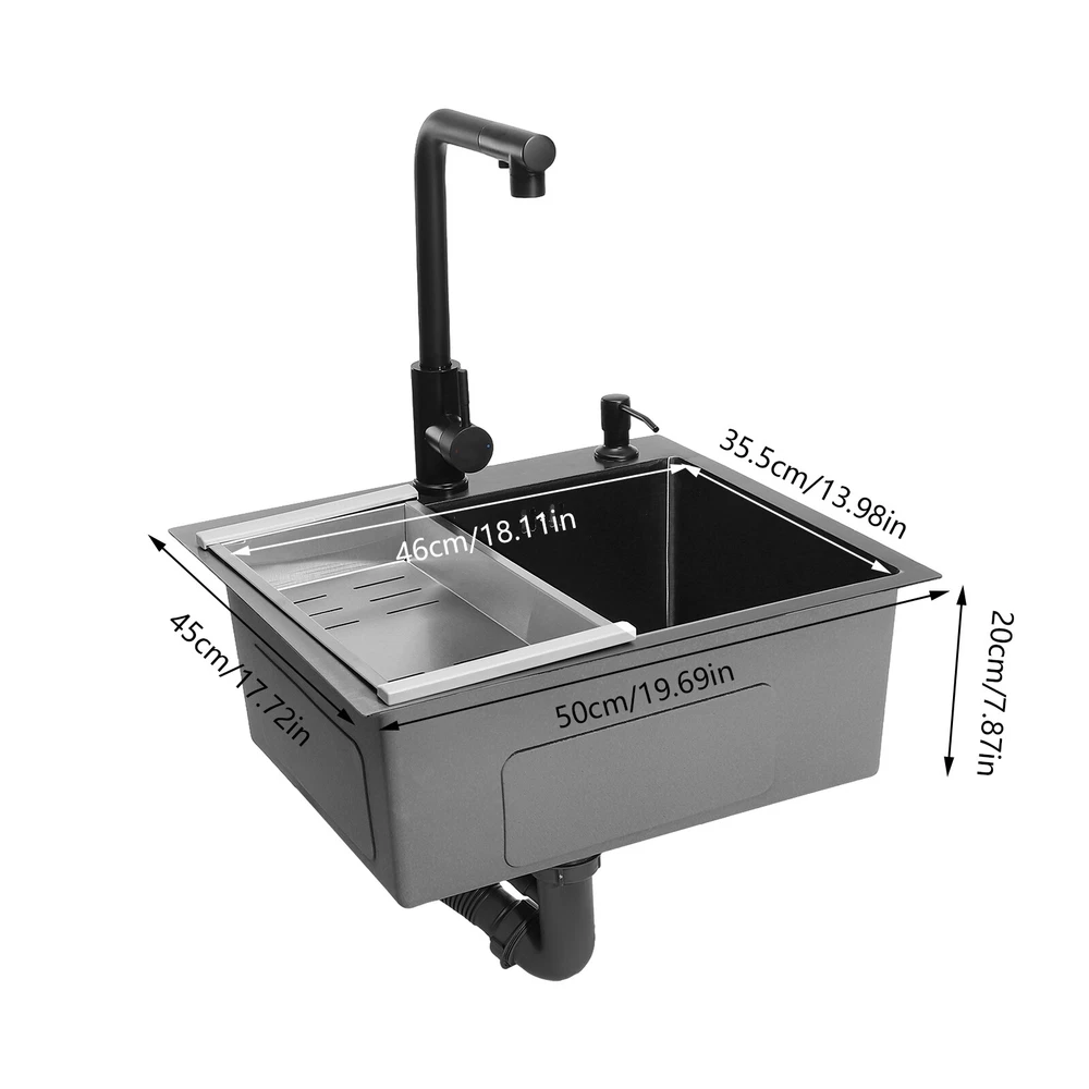 Type: Kitchen Sink Item Height: 48cm Sink Size: 46*35.5*20 cm/ 18.11*13.98*7.87 in UPC: Does not apply Material: 304 Stainless Steel Item Width: 35.5cm gtin13: Does not apply Mounting: Drop-in Item Length: 20cm Brand: Unbranded Product Size: 50*45 cm/ 19.69*17.72 in Room: Any Room Color: Black