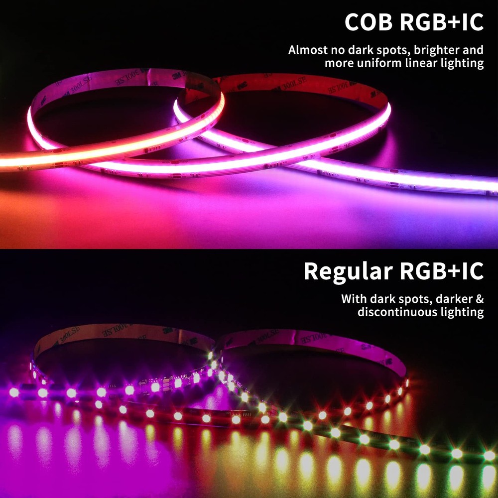 [What’s special about the Strip] - Unlike normal RGB LED Strip that can show only one color in the same time of a strip, the RGB COB LED Strip applied with IC technology, that is different colors displayed simultaneously on the strip. The IC is addressable, segment control with its color, mode, and speed of the light strip by using an addressable LED controller according to the pixels(Strip only, power supply and controller sell seperately). [Uniform & Continuous Light ] - Unlike traditional 5050 LED strip lights with 120° beam angle, GINGOW addressable RGB COB LED strip lights are designed with a 180°,more wider light range. 3465LEDs on this 18ft COB LED strip make the emitting units closer to each other than ever before, without dark spots, providing uniform linear illumination. [Cuttable & Connectable] - RGB Smart IC COB LED strip is cuttable at every 7.15cm/2.81in(copper marks) and connectable. Once cut, if re-connect them, can use RGB+IC COB connector or soldering, there is a connector with 20cm/7.87in wire in the package to easy reconnect, and you can also find 12mm RGB with IC COB connector in the market.(When re-connection, please make sure the direction are same of the strips, if reversed, the signal cannot be transmitted, and it only show white color). [UL Certificate] - COB LED strips are low-voltage (12V) strips, and they are all UL-listed strip lights, which are safer for daily use. Constant voltage design, the voltage drop is smaller than ordinary single-color light strips, and the lighting effect is better. Real double layer PCB board make this COB LED strip with good heat dissipation and durable, lifespan is more than 65000 hours! 3M peel-and-stick adhesive, easy to install on clear,dry surface, no need extra tools. [Wide Applications] - 12V Symphony IC RGB COB LED Strip can provide comfortable lighting, rich colors and strong restoring power, suitable for home, bar, entertainment hall, coffee shop, party, dance, RV, gym, 3D printers,gaming room, musical instrument room, etc. [Packaging Scope & Warranty] - The package contains: 1 X 18ft 12V RGB Smart IC COB LED strip light; 1 X Connector with 20cm/7.87in extension wire. offers 5 years warranty, any question about our product, feel free to contact us in any time!