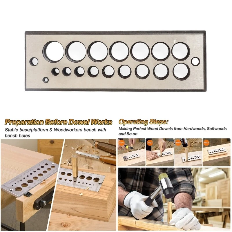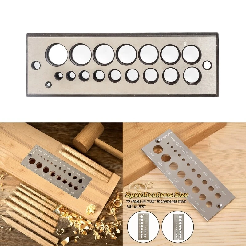 Features: The steel dowel plate maker has 19 sizes of holes in 32 increments. Size from 8 to 5/8", which contains: 8 5/32",3/16", 7 32 4 9/32",5/16",11/32", 3/8“, 13/32", 7/16", 15/32", 17/32", 9/16",19/32", 5/8". Each steel dowel maker is with 2 discharge holes and 2 to make the dowels plate easier and stable fix on the platform or woodworkers bench- with bench- holes. Made of high quality-precision chromium steel for long lasting durability. Compatibility: Make dowels from hardwoods, softwoods and so on, after multiple cutting, you will get correct size for the dowel required. Specifications: Size:approx15.2x5x1cm/5.98x1.97x0.39 Material:Chromium Steel Weight:400g Holes: 19 holds in 32 increments Holes Size: 8 5/32",3/16", 7 32 4 9/32",5/16",11/32", 3/8“, 13/32", 7/16", 15/32", 17/32", 9/16",19/32", 5/8" Package Includes: 1PC Steel Dowel Plate Maker note: Due to differences in lighting and screen settings, the color of the product may be slightly different from the picture. Due to different manual measurements, please allow slight size differences.