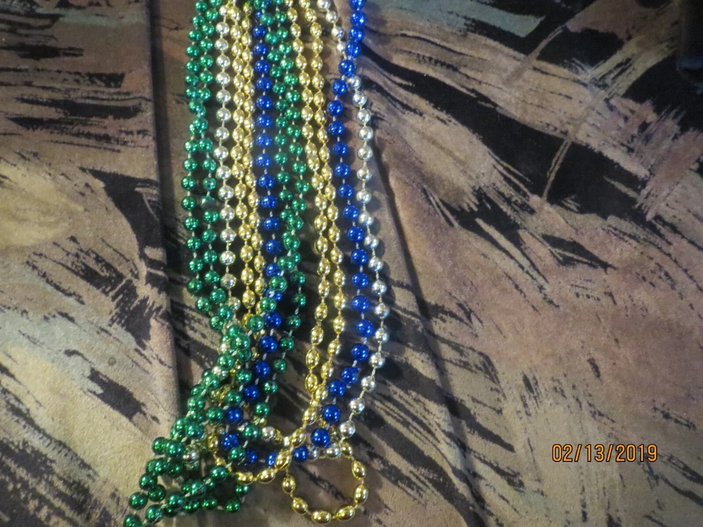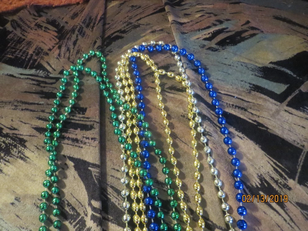 19 MARDI GRAS BEADS NECKLACES MOTORCYCLE BIKE RALLY THROW BEAD BIRTHDAY PARTY. The gray beads pictured last are not Mardi GRAS but is a long vintage necklace included just for fun. Also please note that 5 of the beads are in shape of shamrocks great for St. Patrick's Day!